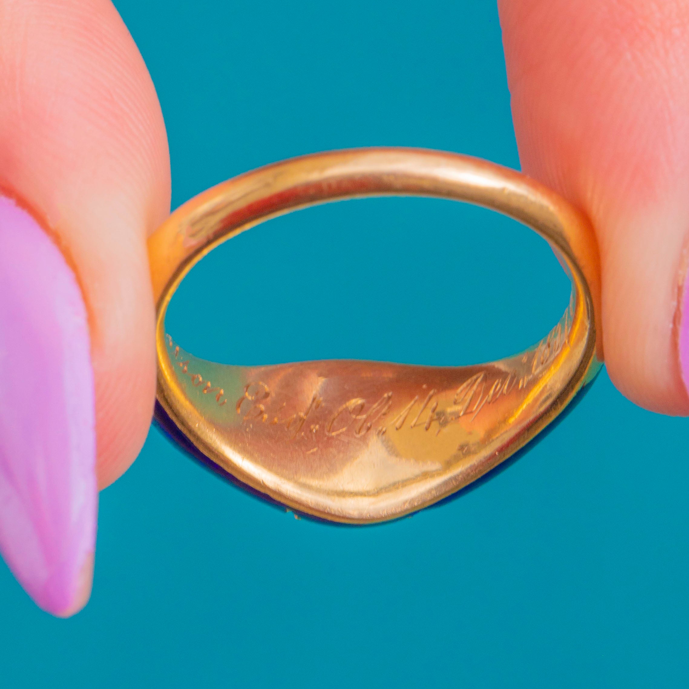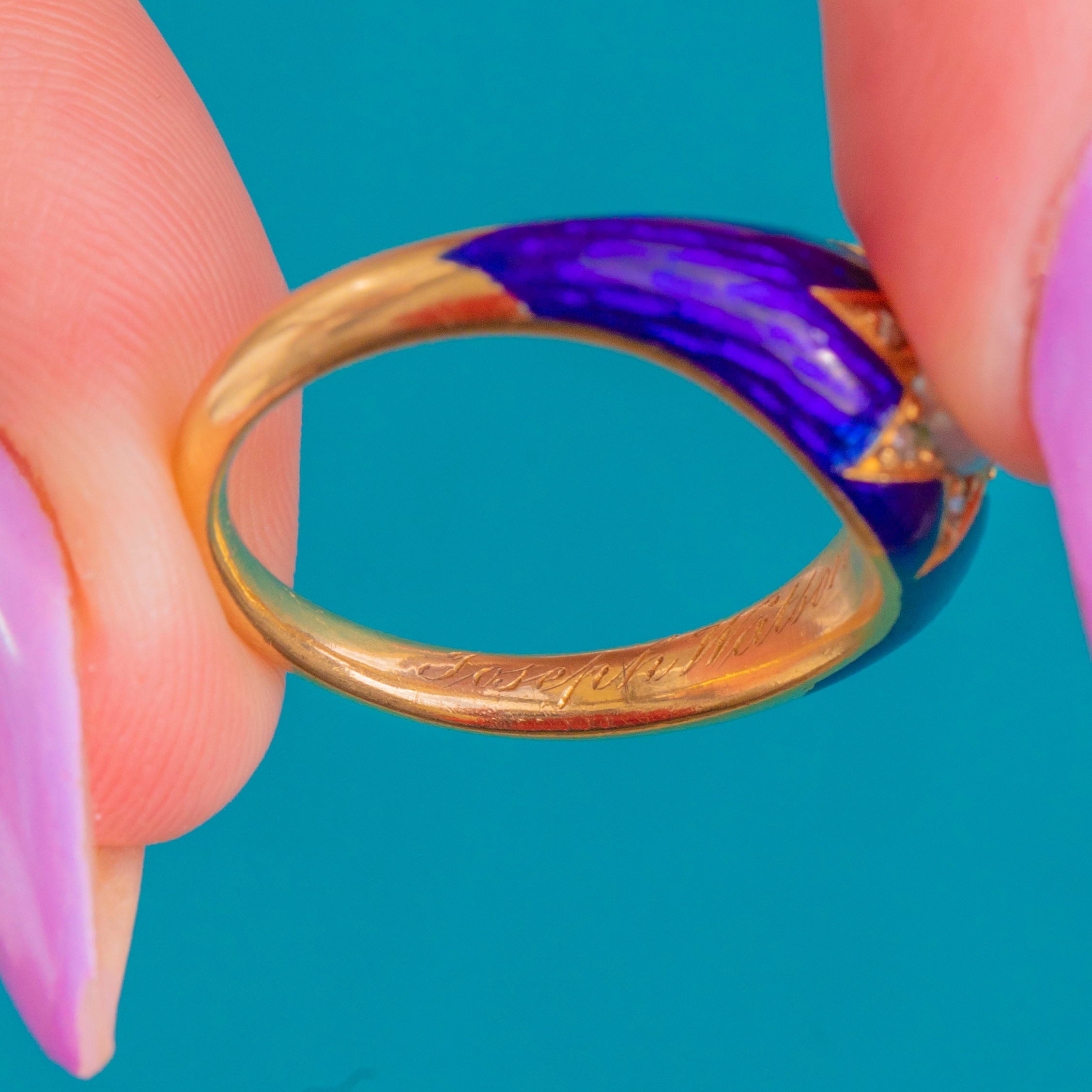 Victorianの感傷が溢れるこのリングには、“Joseph Wastson Esq Ob 14 Dec 1857 at 86”という当時の銘が刻まれており、その卓越したクラフツマンシップに歴史的な趣を添えています。エレガントで手触りも心地よく、絶妙な色調を持つ本作は、色彩と個性が響き合うジュエルです。