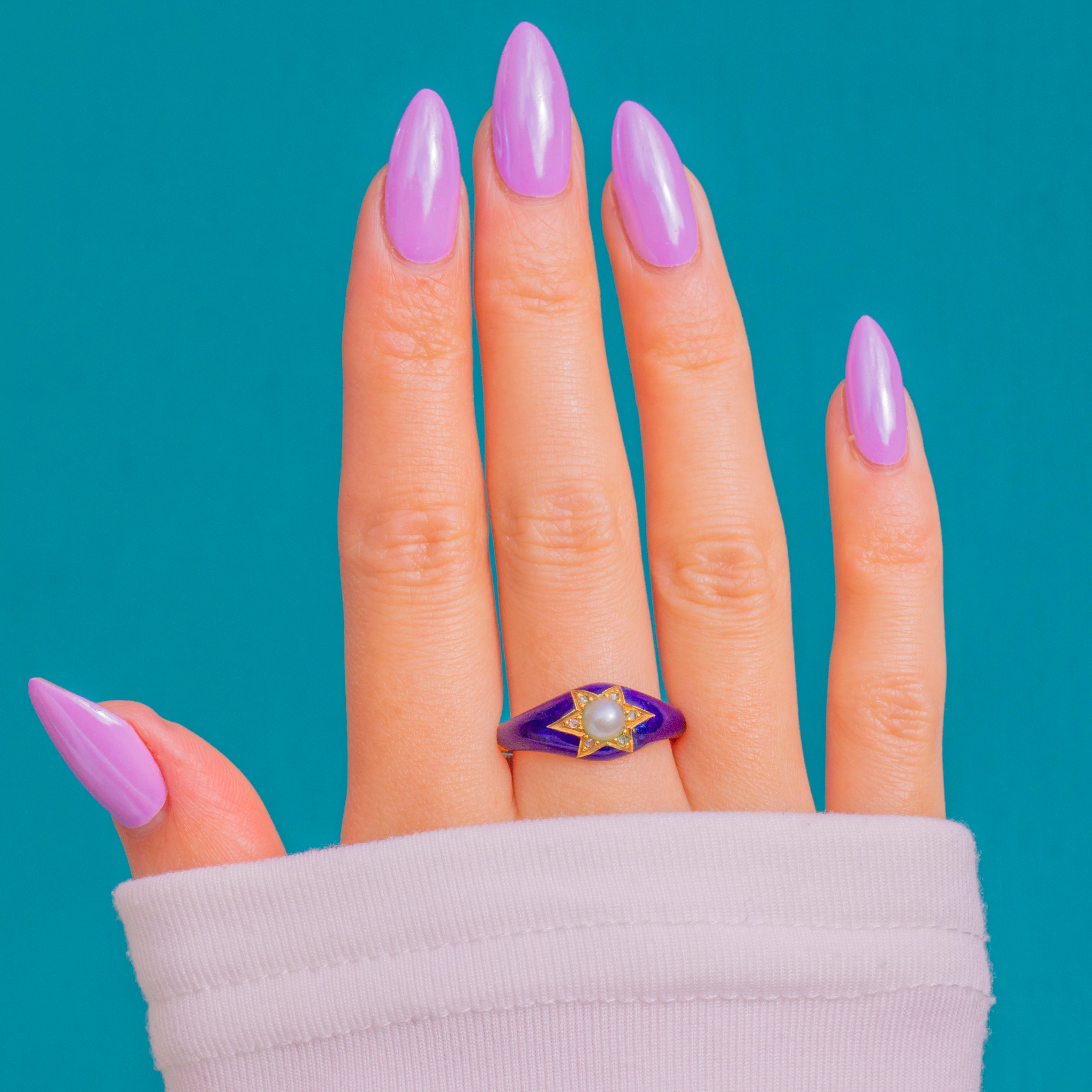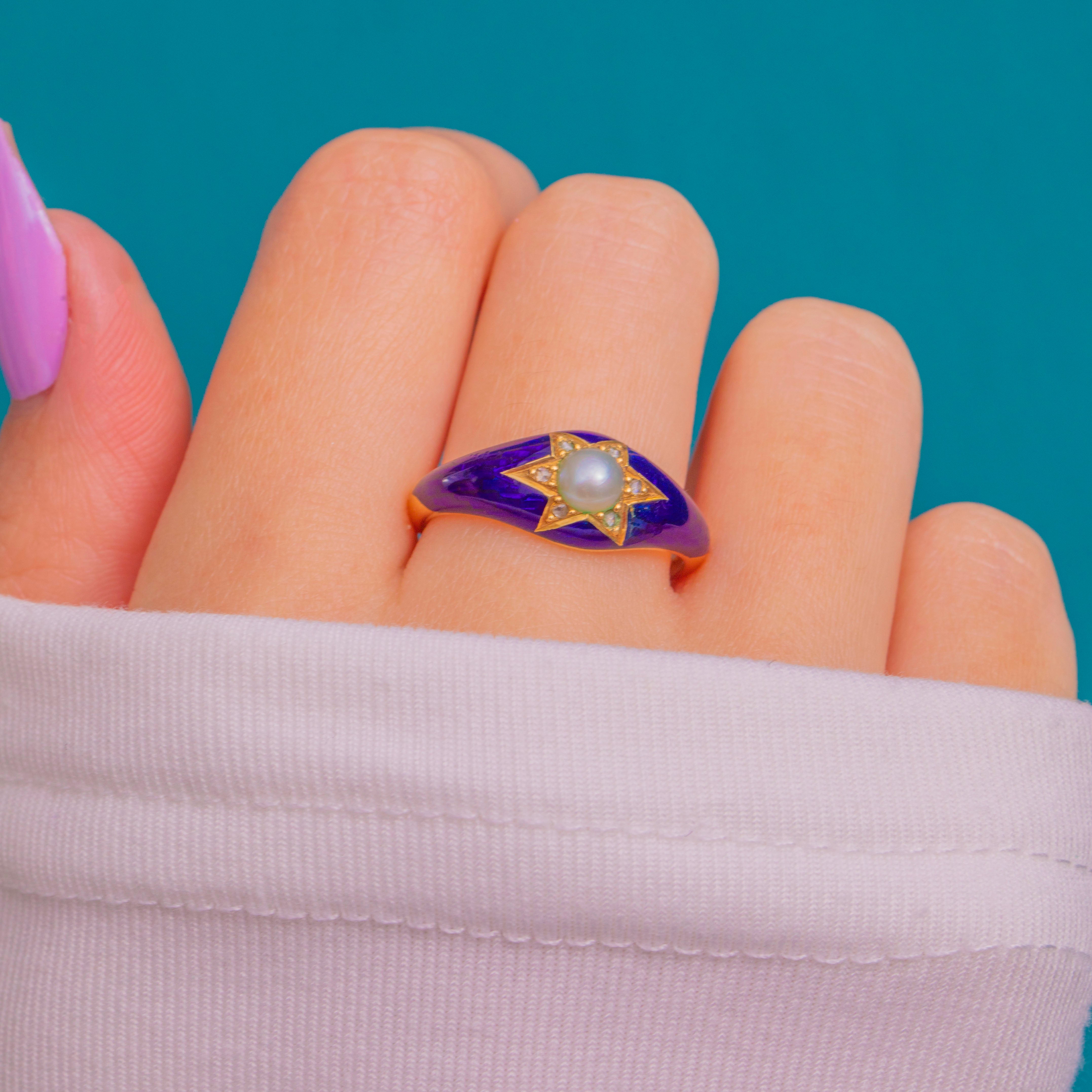 深みのあるロイヤルブルーのギロシェエナメルが舞台となり、18ctゴールドに施された六芒星が天上の輝きを放ちます。中央には艶やかなナチュラルパールが配され、周囲には繊細なローズカットダイヤモンドがきらめきを添えています。コンパクトながらも印象的で、柔らかなドーム型のフォルムと透き通るエナメルが美しく光を捉え、下地のエンジンターン模様を際立たせます。