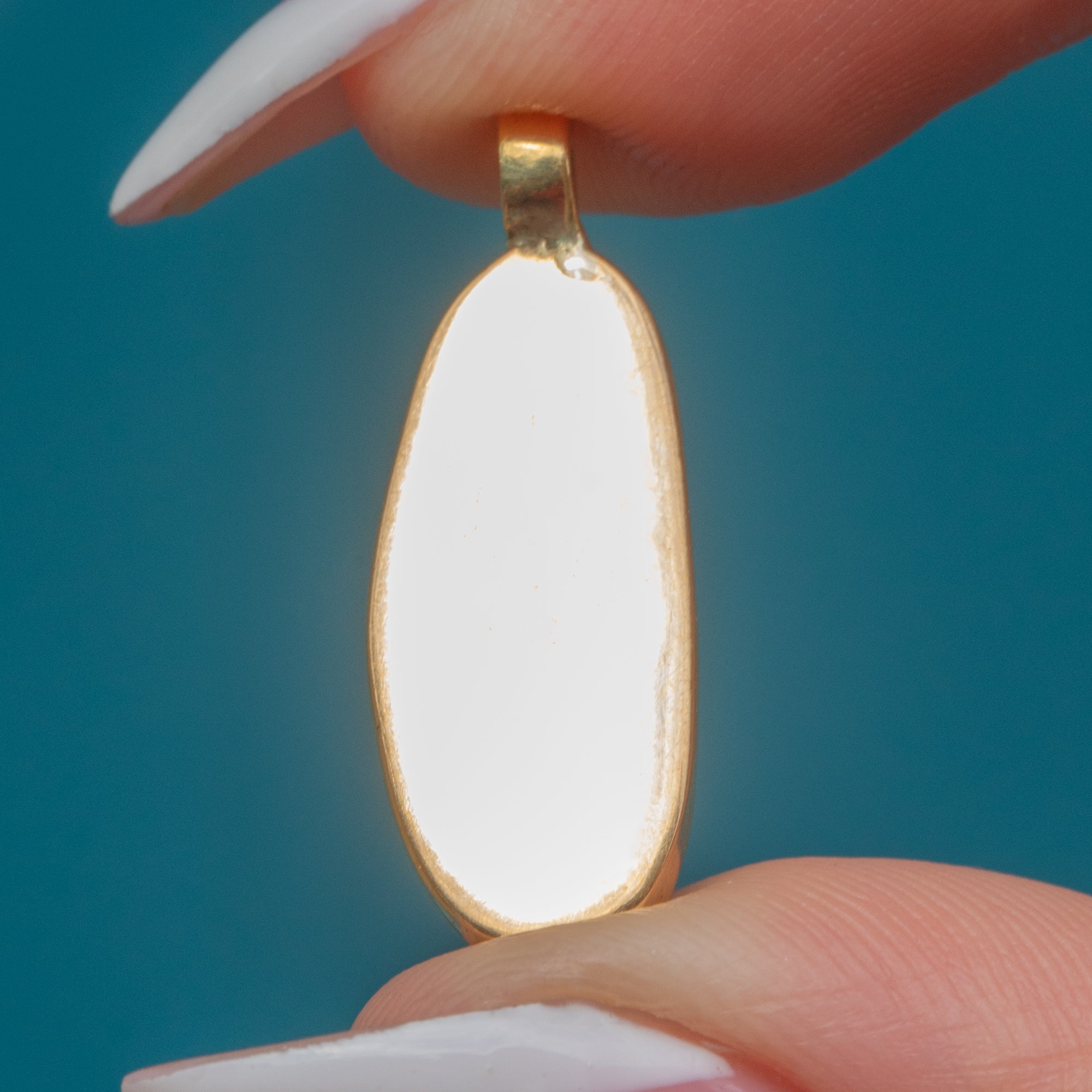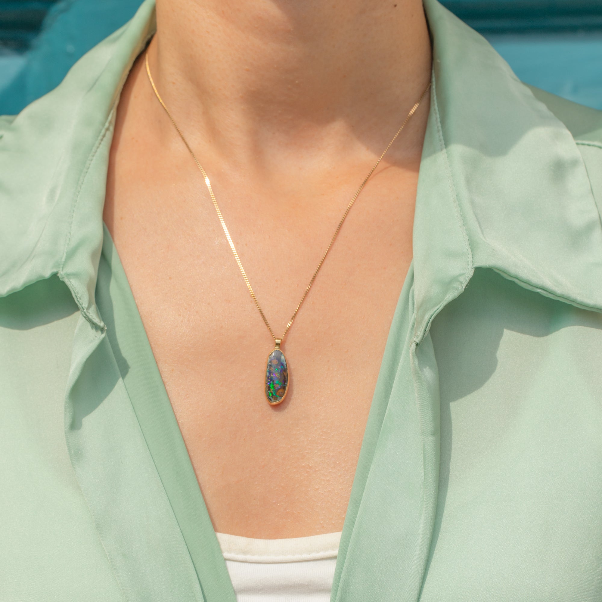 EXCELLENT: The Opal is radiant, free from any notable signs of wear, and is set securely. The Gold is bright and buttery, with the smooth back providing comfortable wear. With a securely soldered bale, this pendant can be worn with utmost confidence.