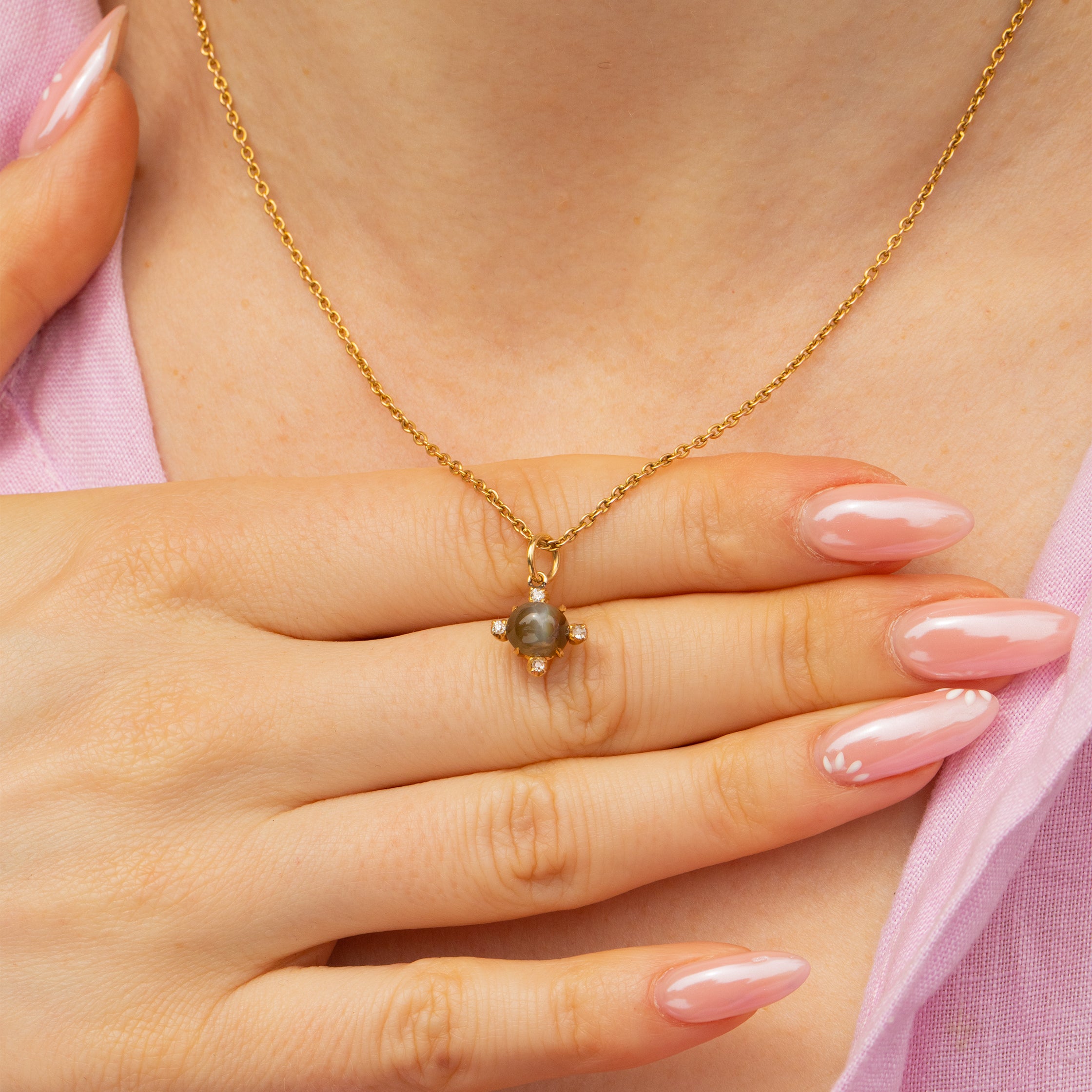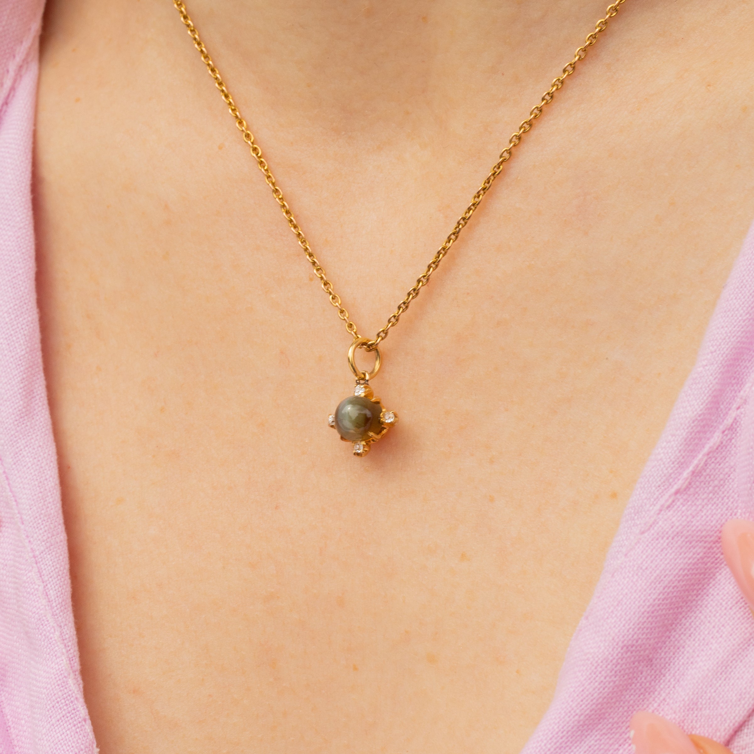This 18ct Gold charm might be petite, but it certainly packs a punch. The Cat's eye, or Chrysoberyl, has a gorgeous olive tone to it, and is adorned by four sparkly Diamonds for a twinkling flourish!