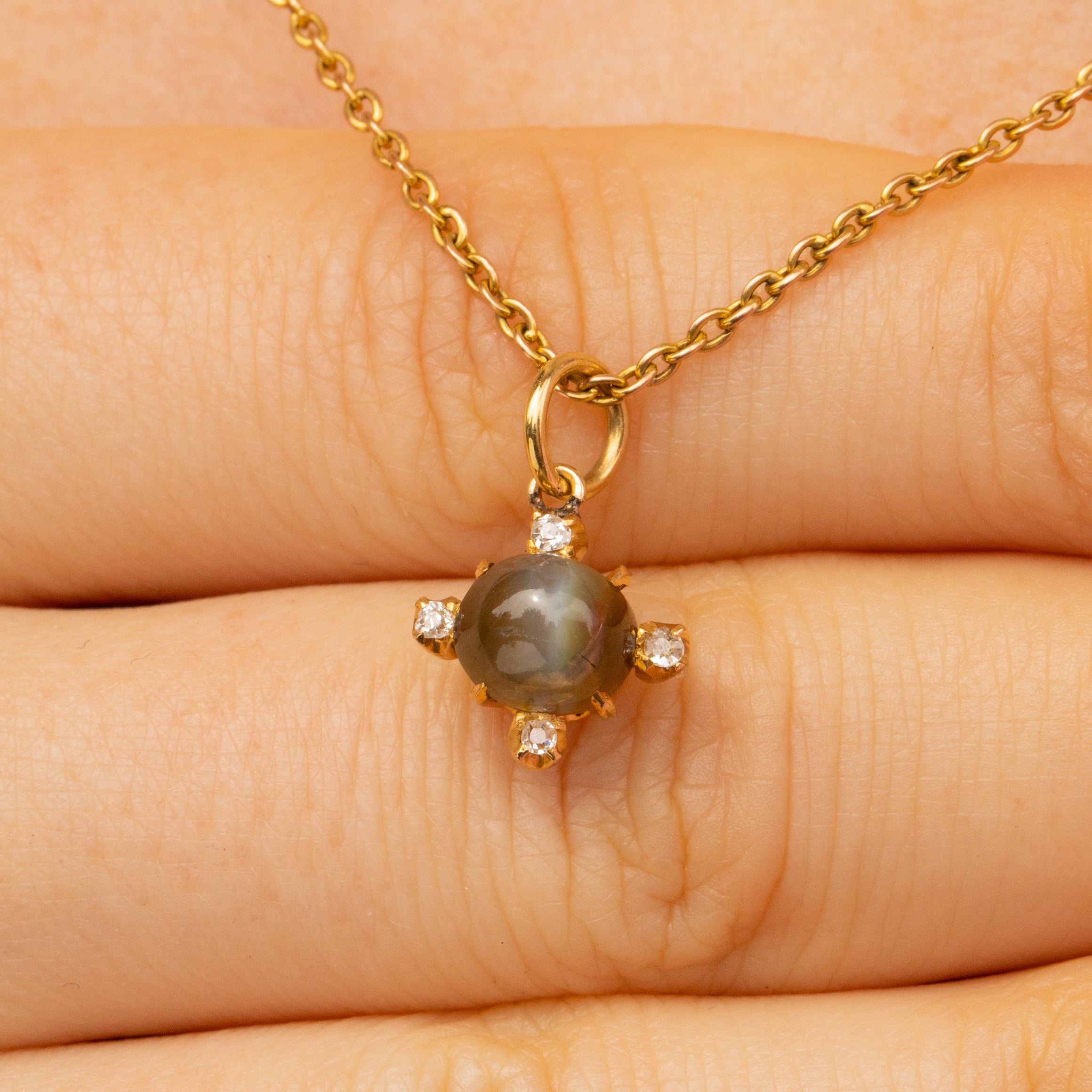VERY GOOD. This antique 18ct Gold cat's eye Agate Diamond charm is in very good condition. The gemstones are all secure, and they work beautifully in harmony together. The Cat's eye does has a scratch running across its surface, on the lower half, but this is only visible up close. We adore this pretty piece, perfect for being suspended from a Gold chain!