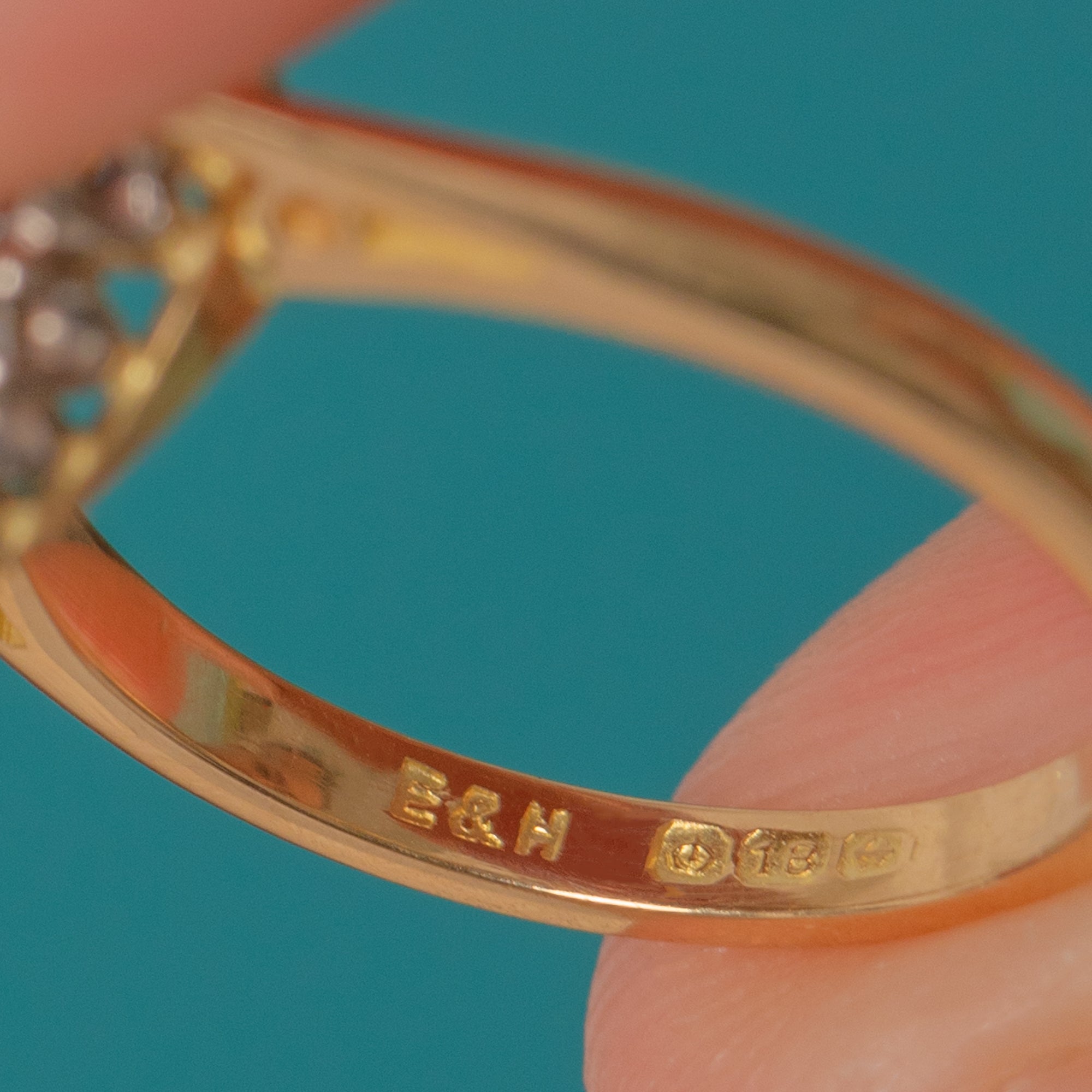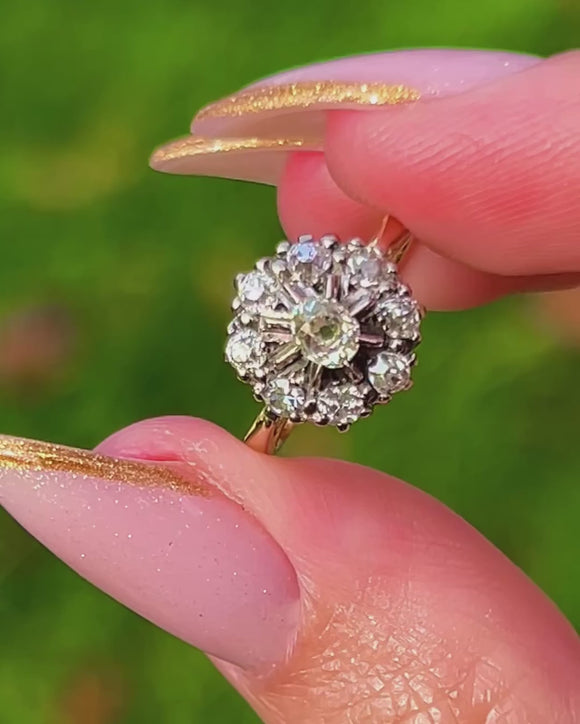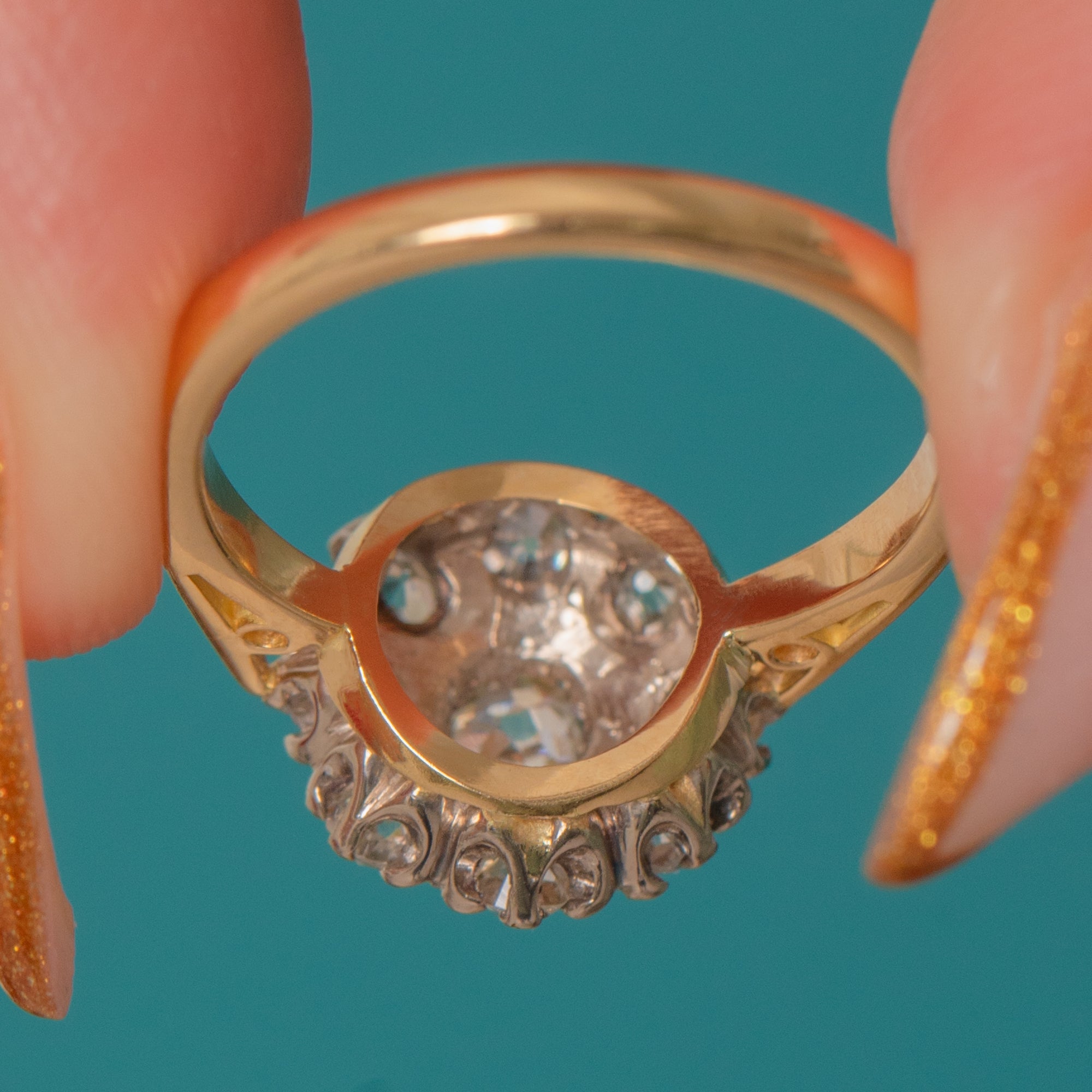 A sparkling antique cluster with wonderful early cuts: a bright Old Mine-cut Diamond at the centre within a halo of lively Old European-cut Diamonds. The Platinum -topped head contrasts beautifully with the warm 18ct Gold shank, giving that refined early-20th-century look collectors love.