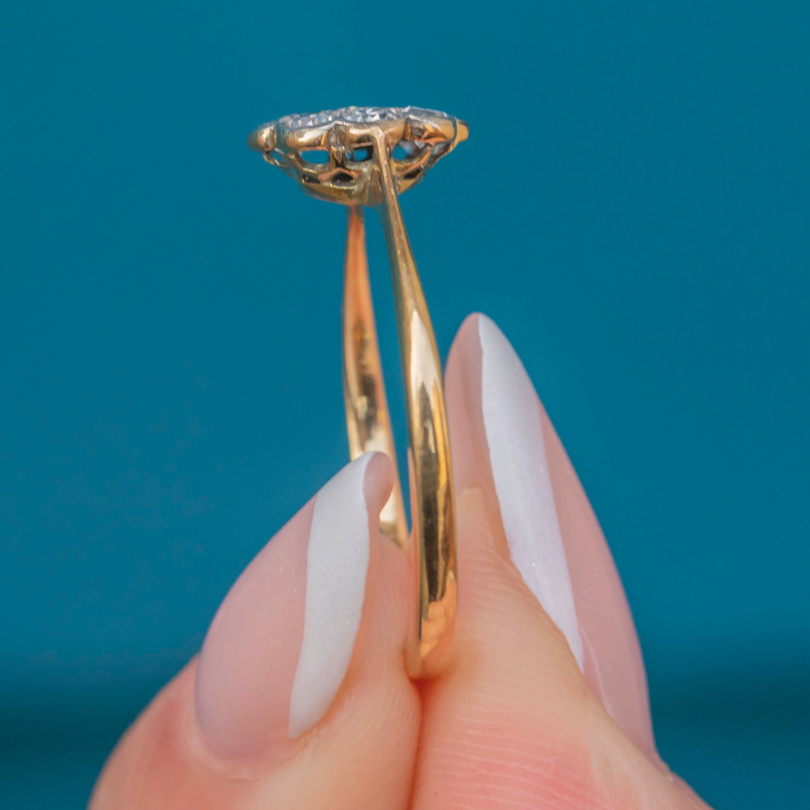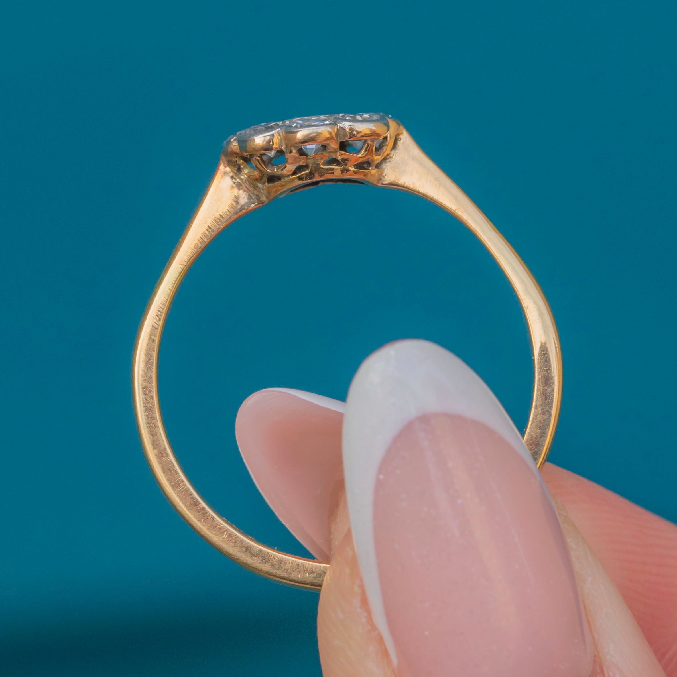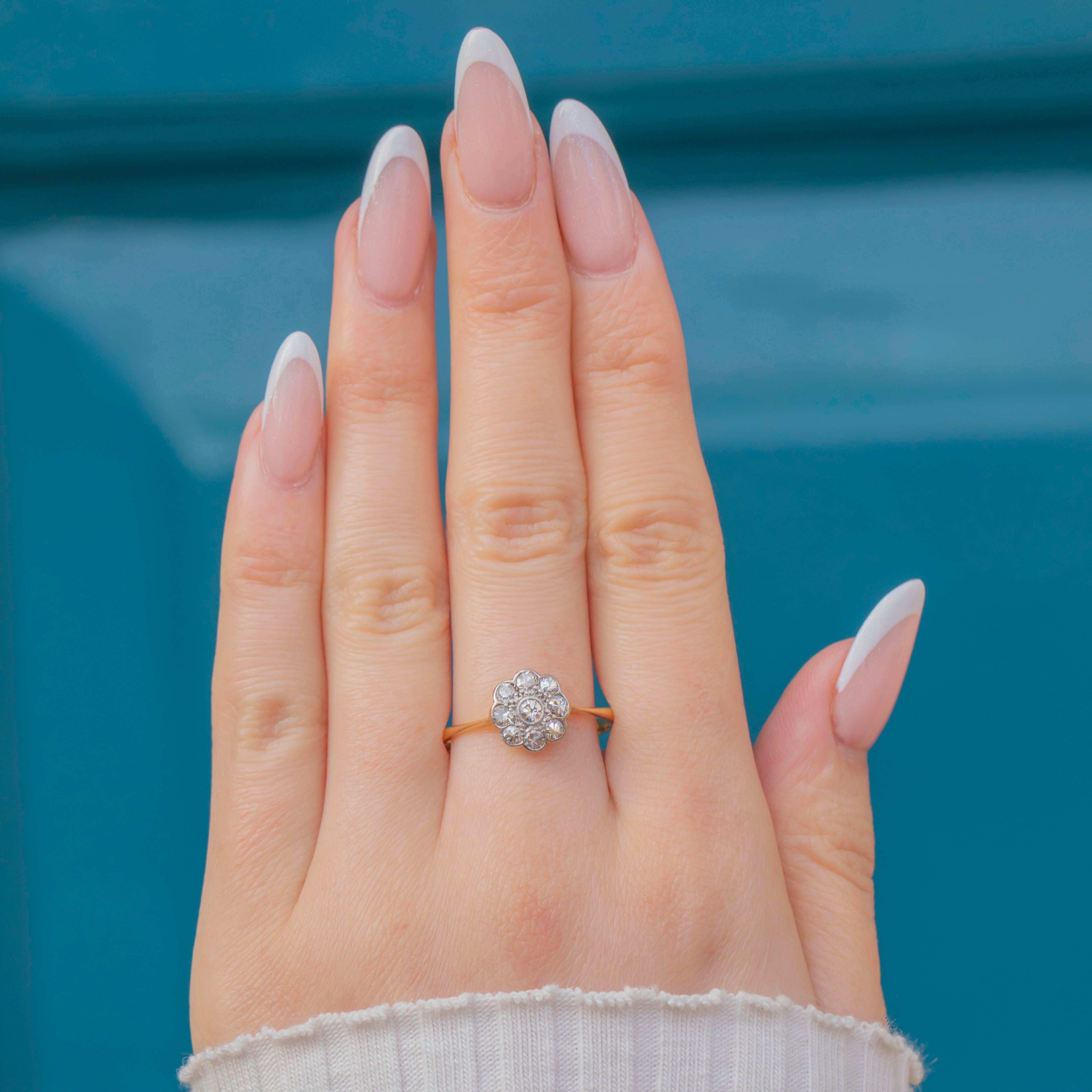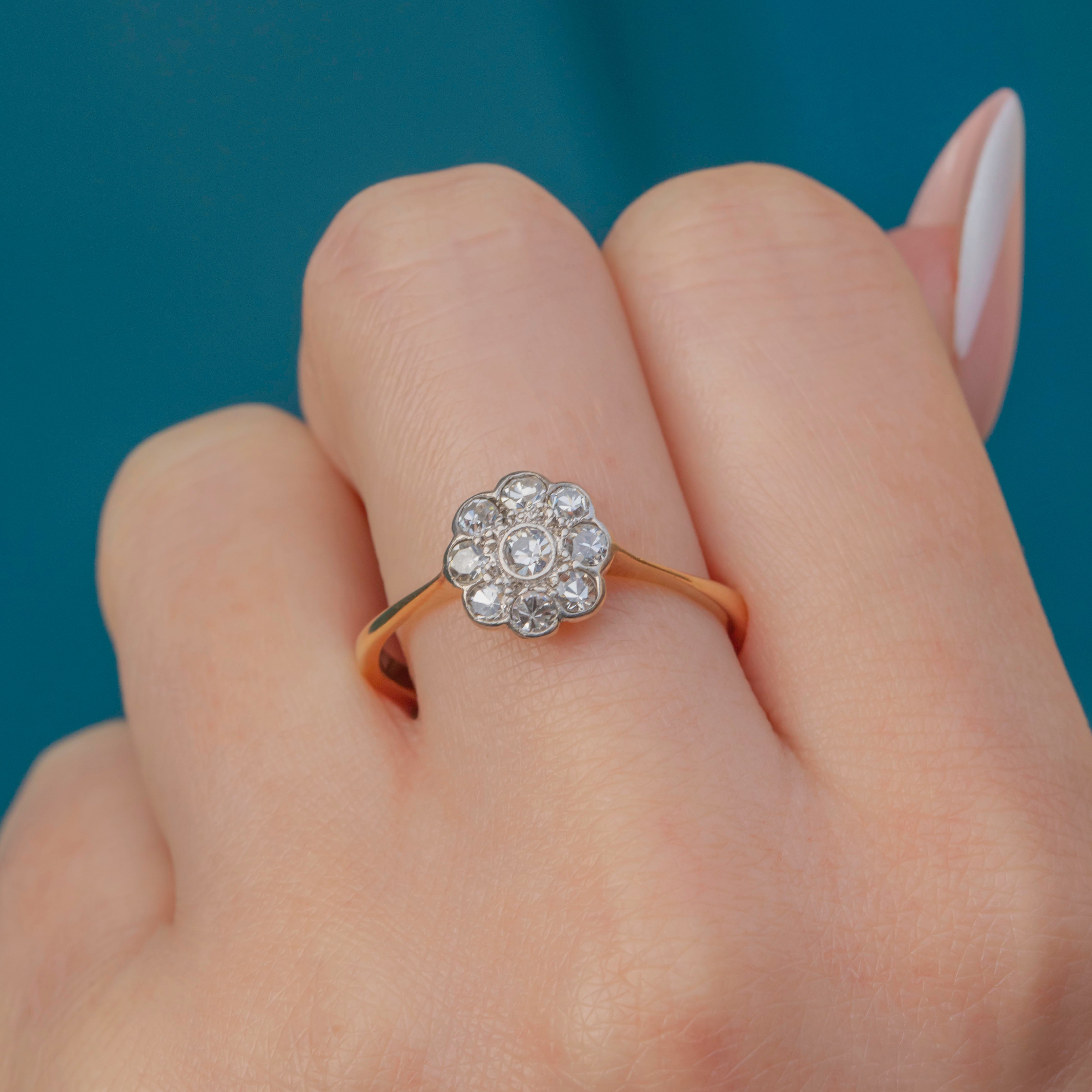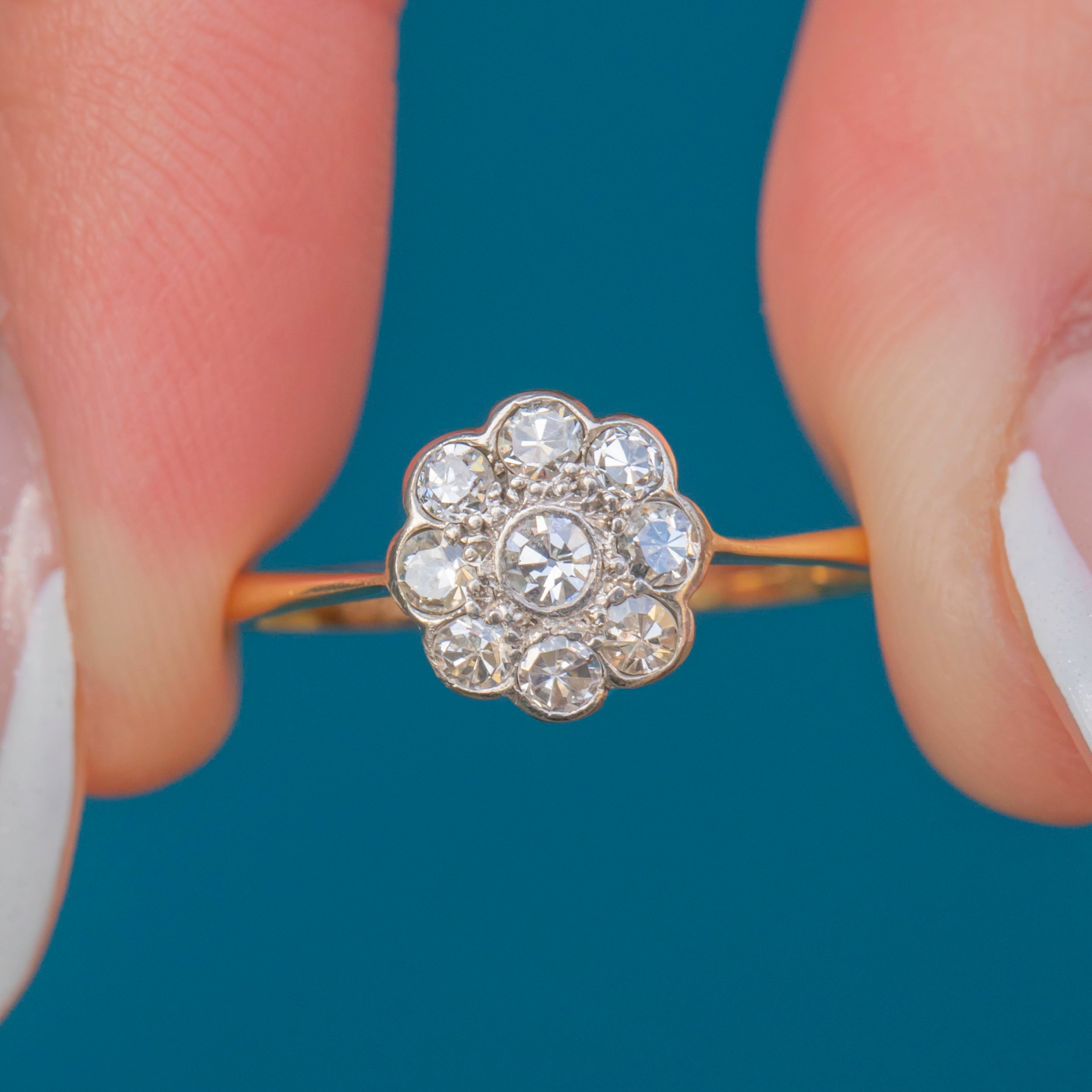 This gorgeous antique 18ct Gold Diamond daisy cluster ring has a timeless appeal, with her feminine floral cluster looking gorgeous on the finger!