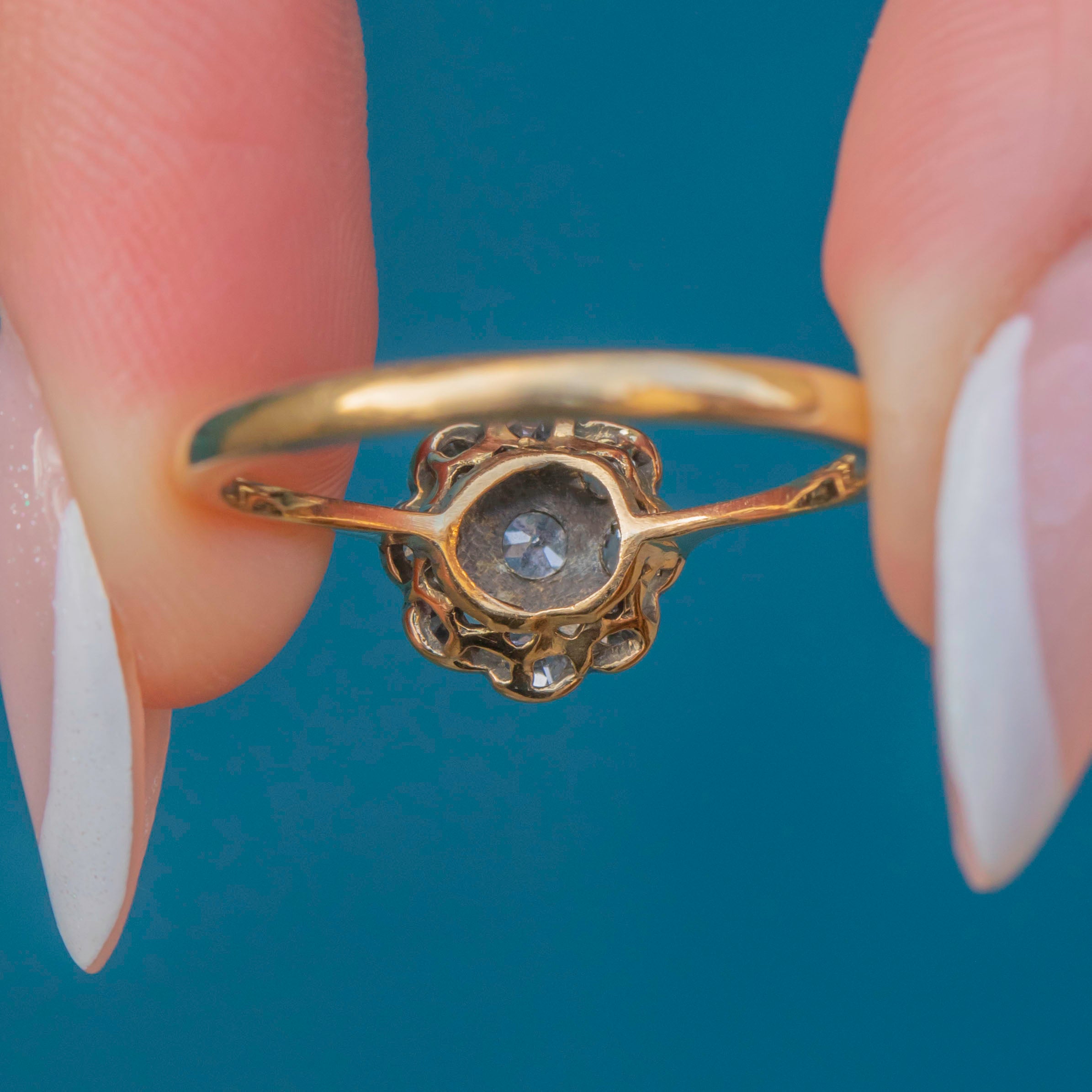 EXCELLENT: This antique 18ct Gold Diamond daisy cluster ring is in excellent condition! The Gold band is sleek and smooth, and the Diamonds are all secure and free from any wear. The ring is gorgeous, and the Diamonds sparkle beautifully!