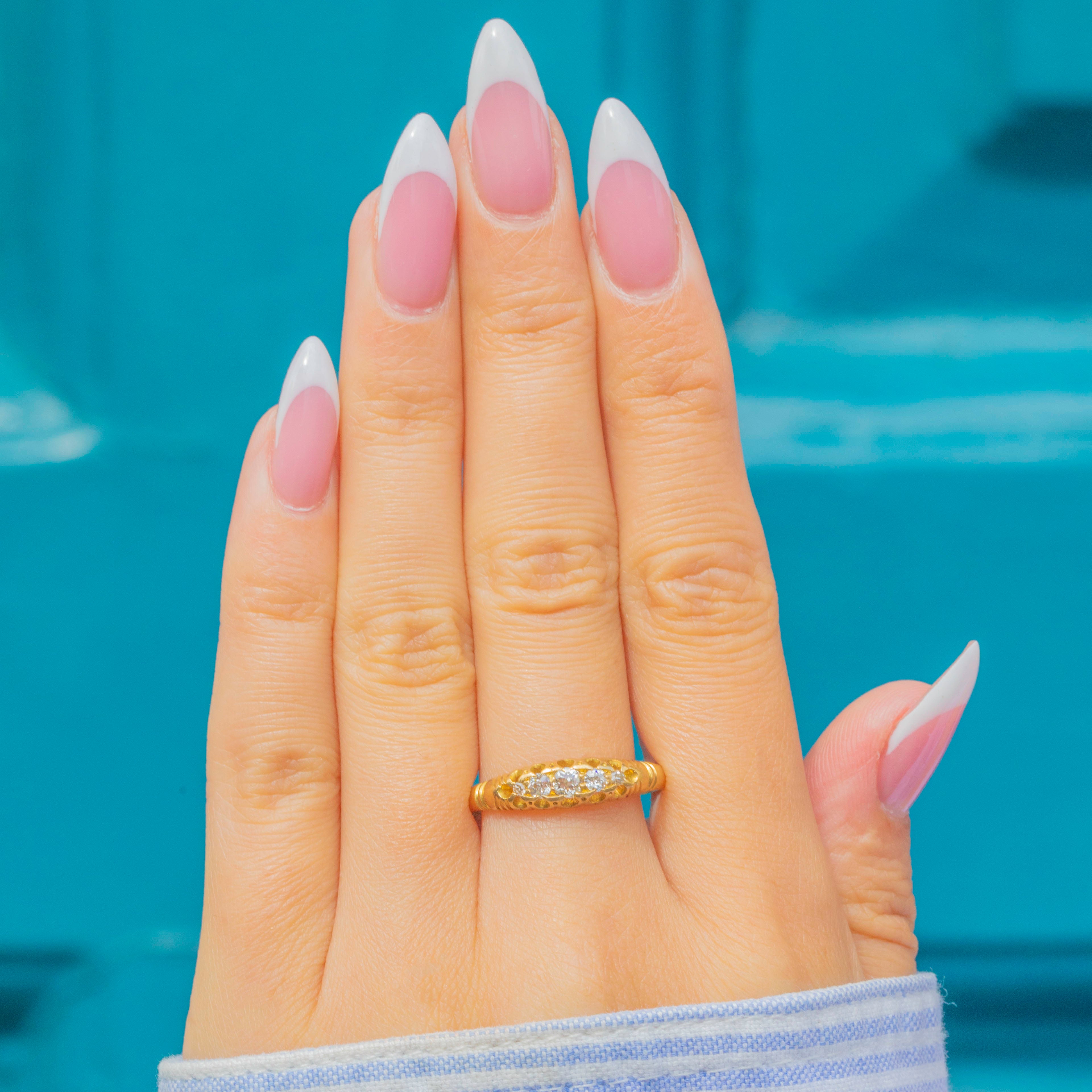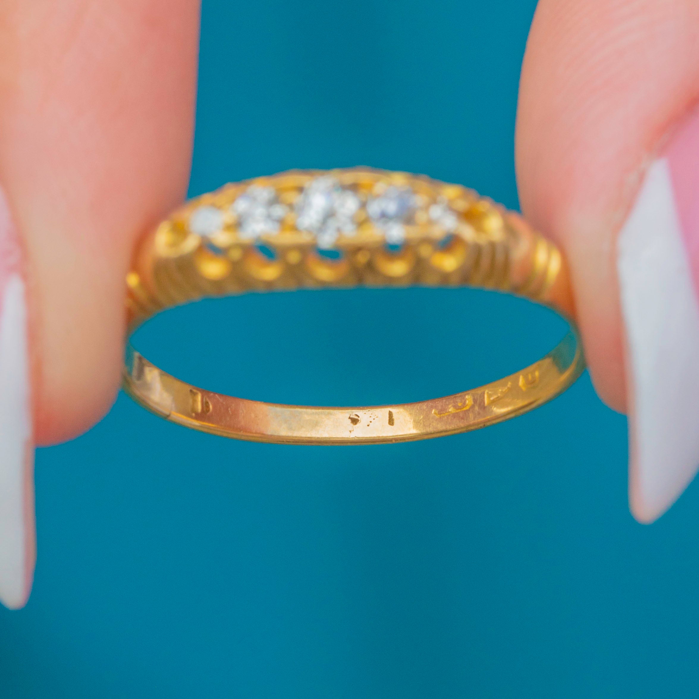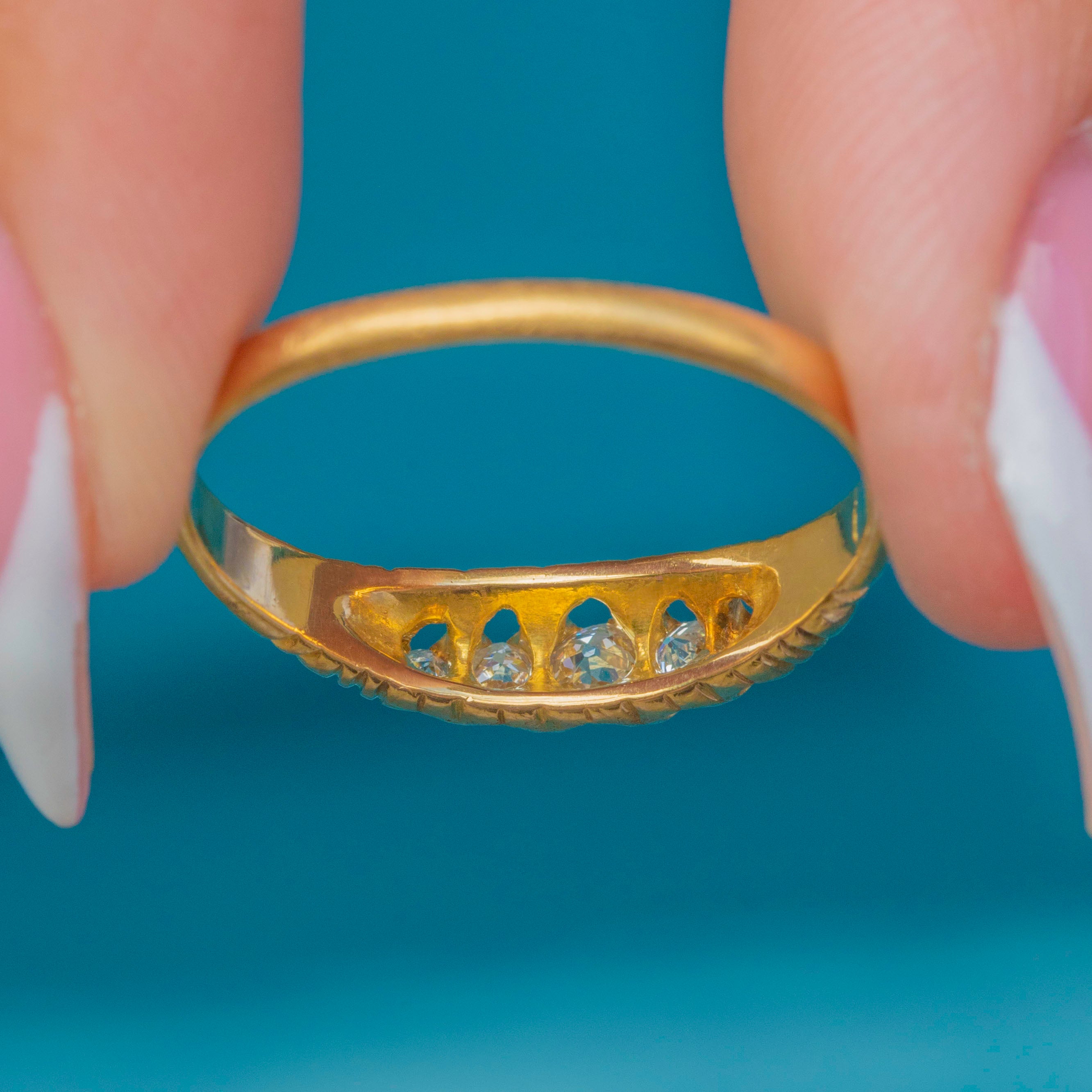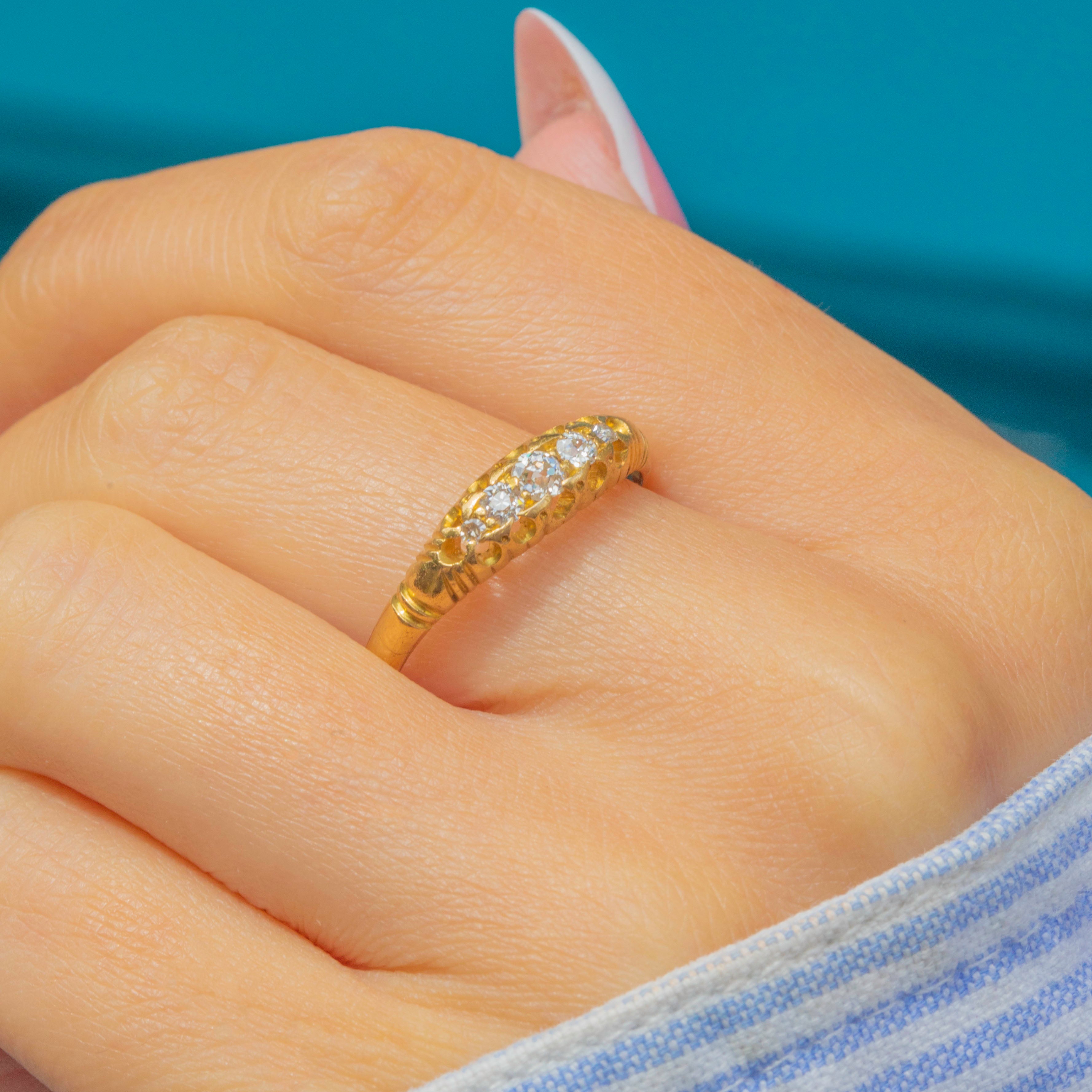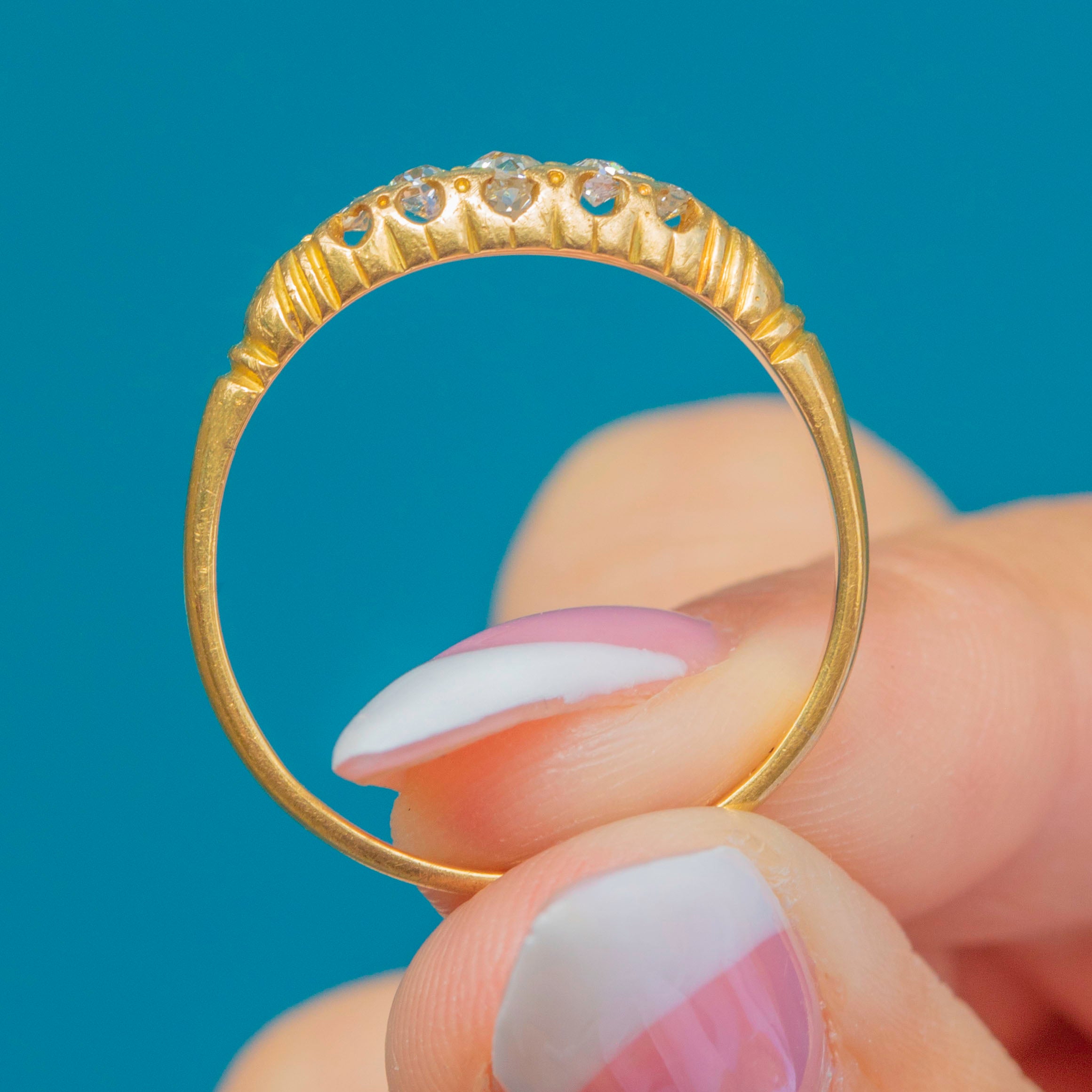 A charming Edwardian five-stone ring set in rich 18ct Gold, this antique treasure sparkles with Old European Cut Diamonds arranged in a tapered line. The sculpted, hand-detailed gallery and shoulders frame the Diamonds beautifully, giving lovely texture and classic period character.