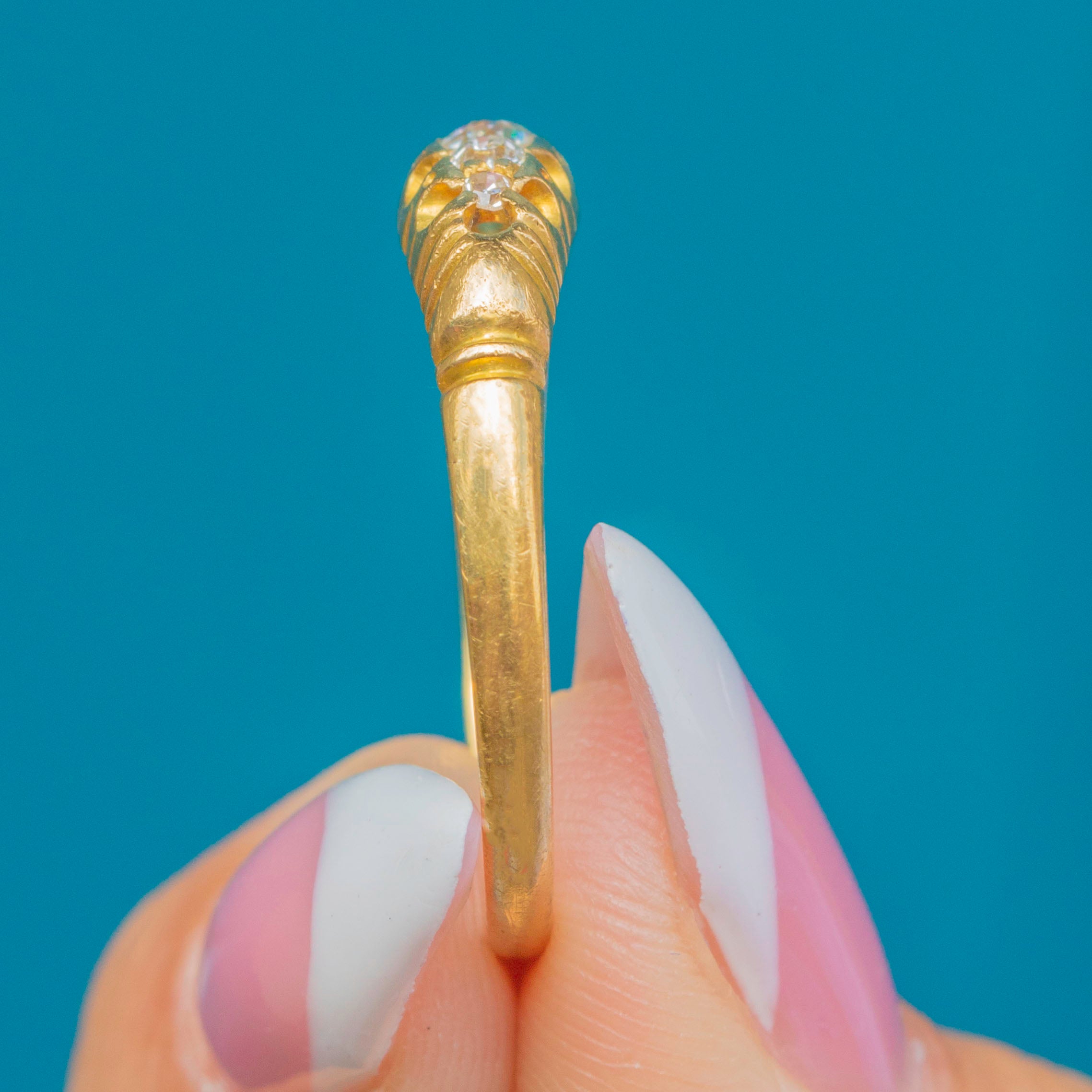 The Diamonds graduate gracefully across the finger from approximately 1.5mm to 3mm in diameter, offering bright, antique fire. Together they are noted at around 0.25ct, making this an elegant choice for everyday luxury or a meaningful stacker with authentic early 20th-century allure.