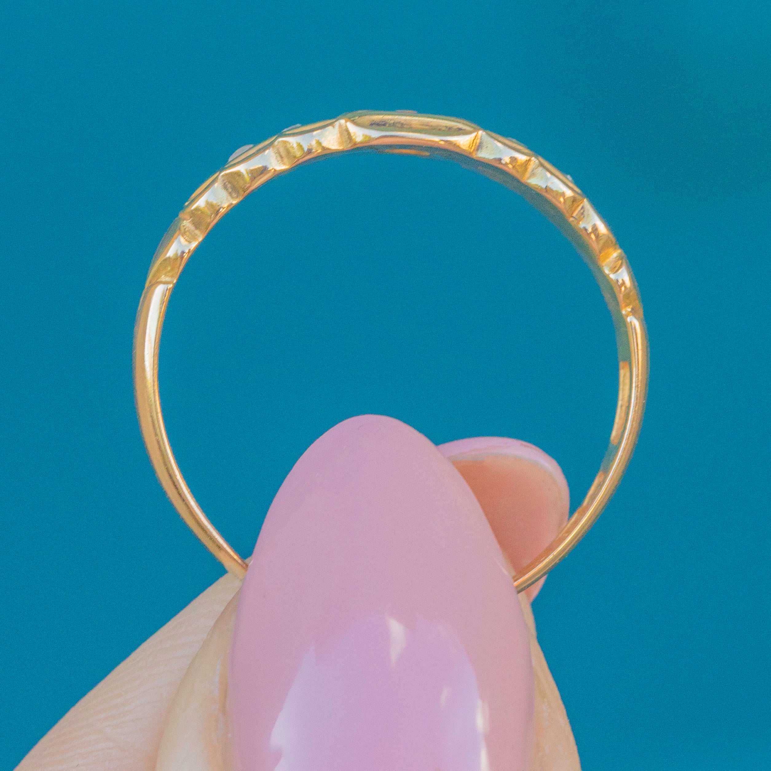 This Victorian Gold gypsy ring features five scintillating diamonds, giving her a celestial ambiance that will add a touch of elegance to any ring stack. With a full set of English hallmarks dating to 1900, this Victorian treasure will make a coveted addition to your collection!