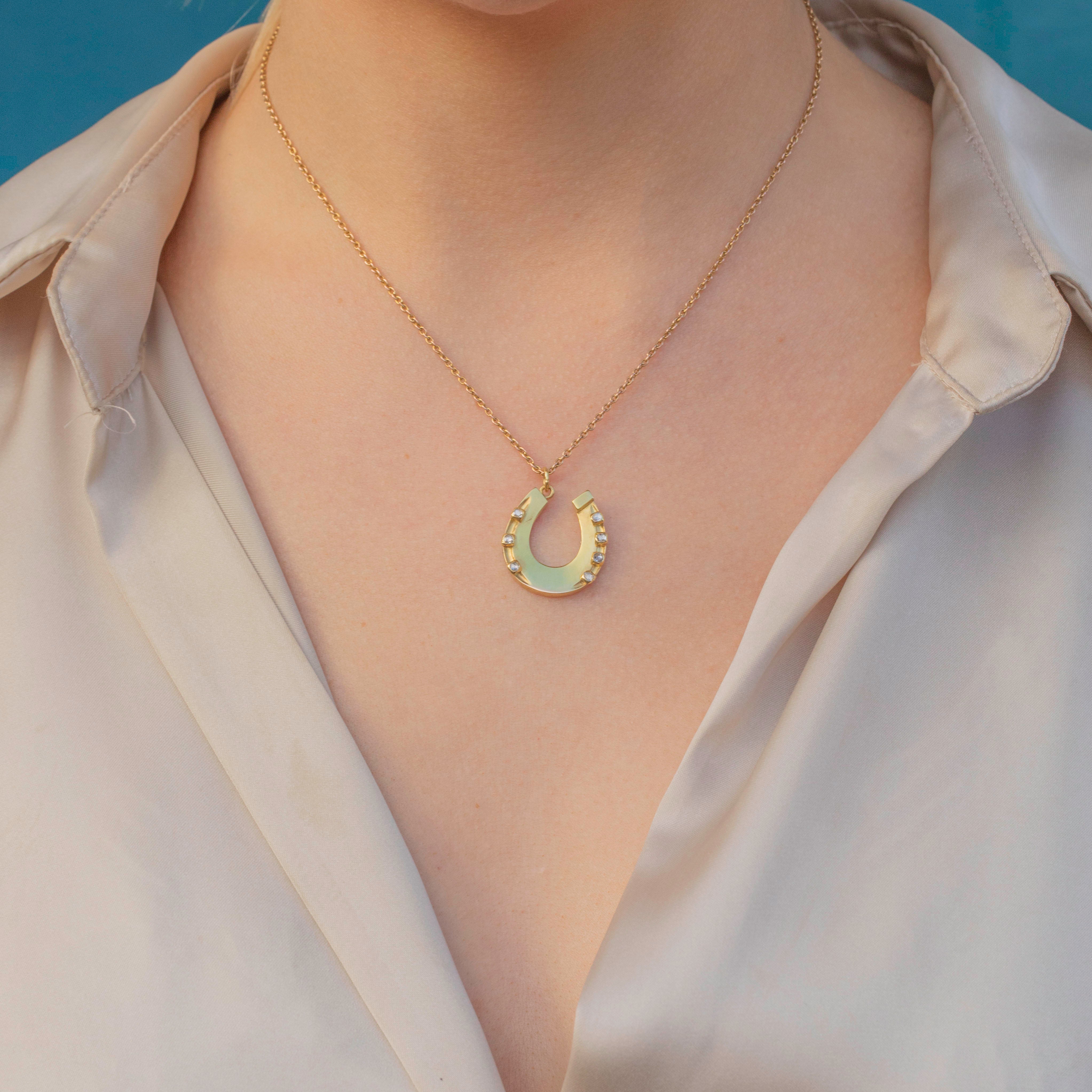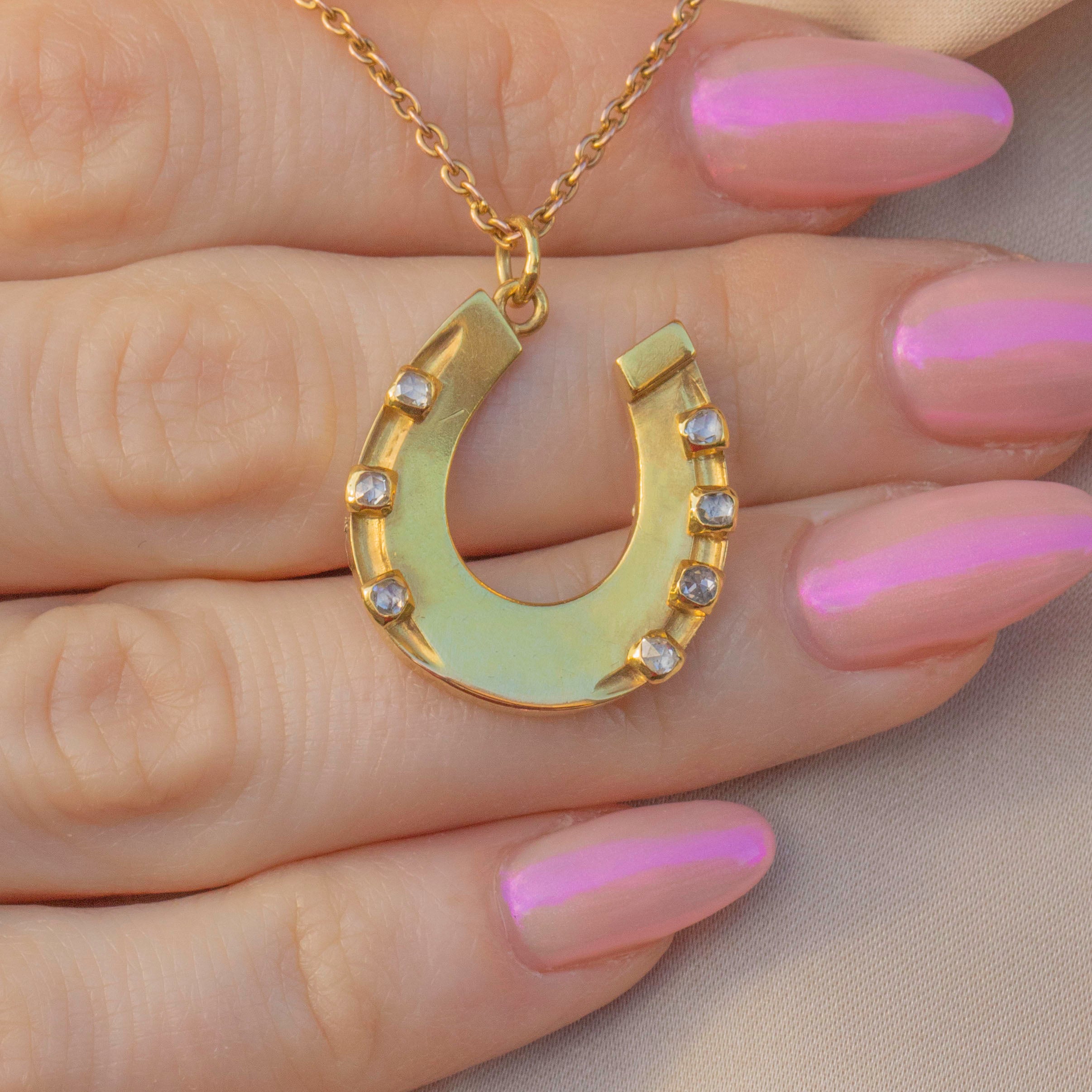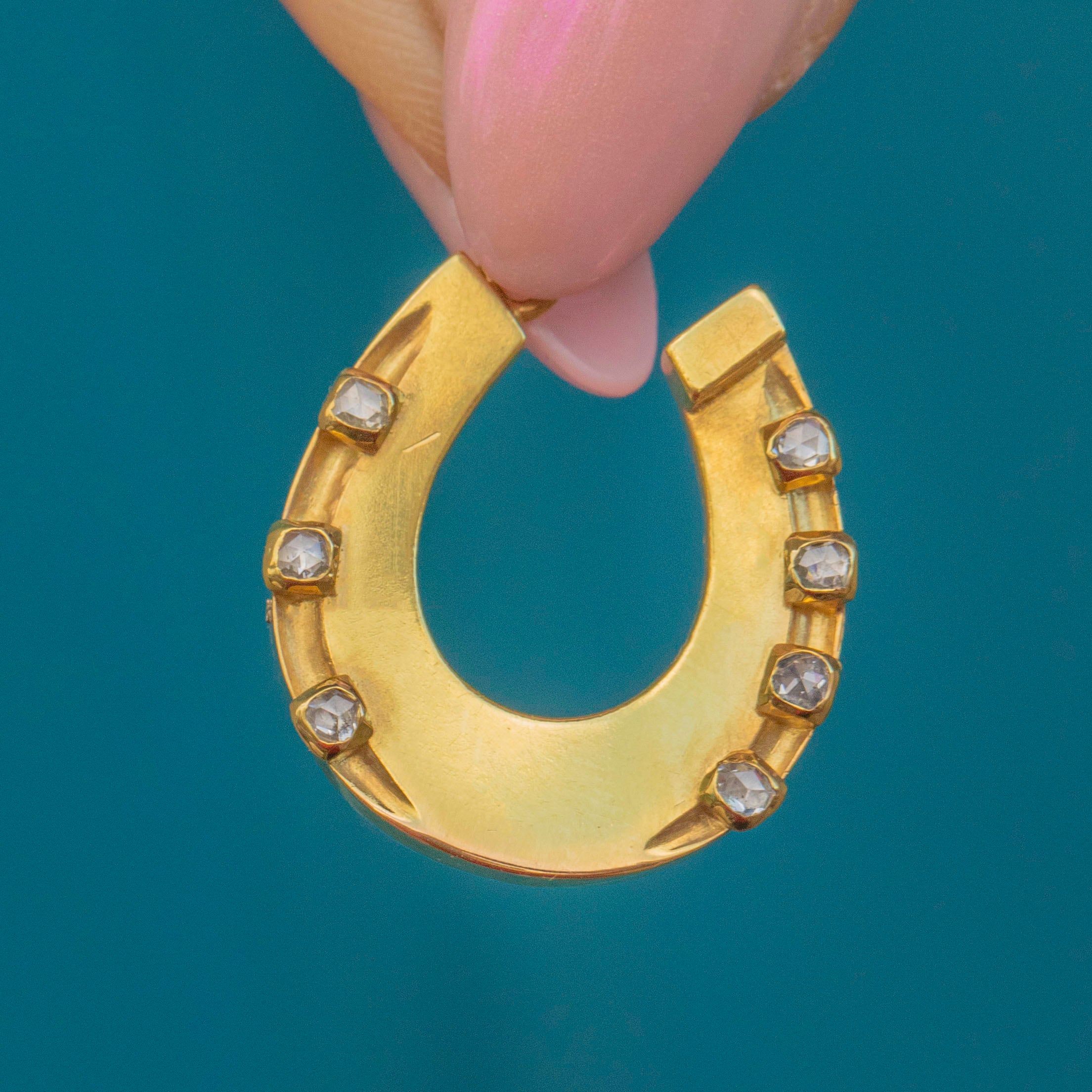 Crafted from brightly saturated 18ct Gold and studded with rose-cut Diamonds, this Victorian horseshoe pendant is a resplendent piece of antique jewellery!