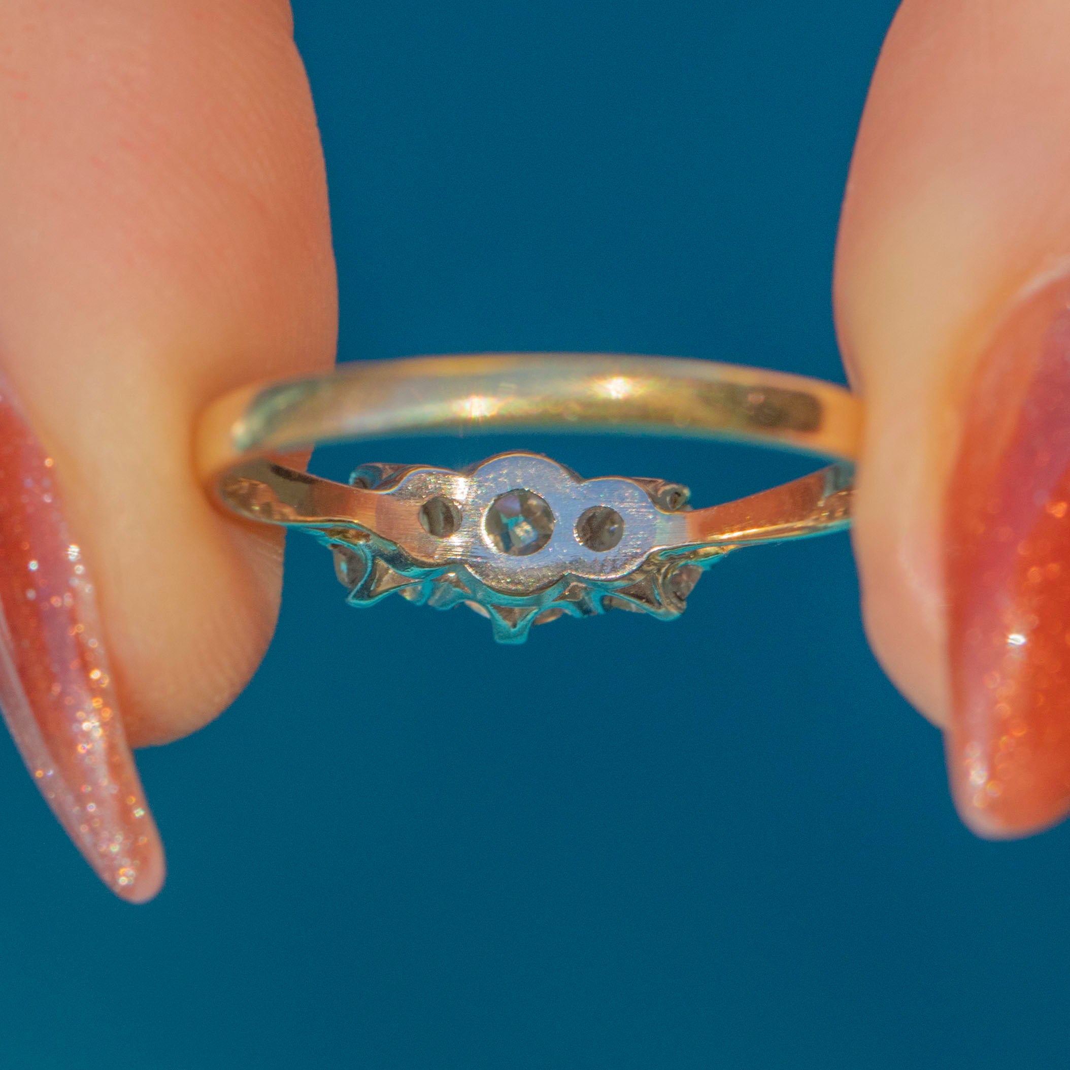 VERY GOOD-EXCELLENT. This antique 18ct Gold Diamond trilogy ring is in wonderful condition. Each Diamond is set securely and has a dazzling brilliance as they catch the light. There are some small fleabites to the Diamonds, however, this is commensurate with age and difficult to spot without a jeweller's loupe. In great condition, she is a must-have!