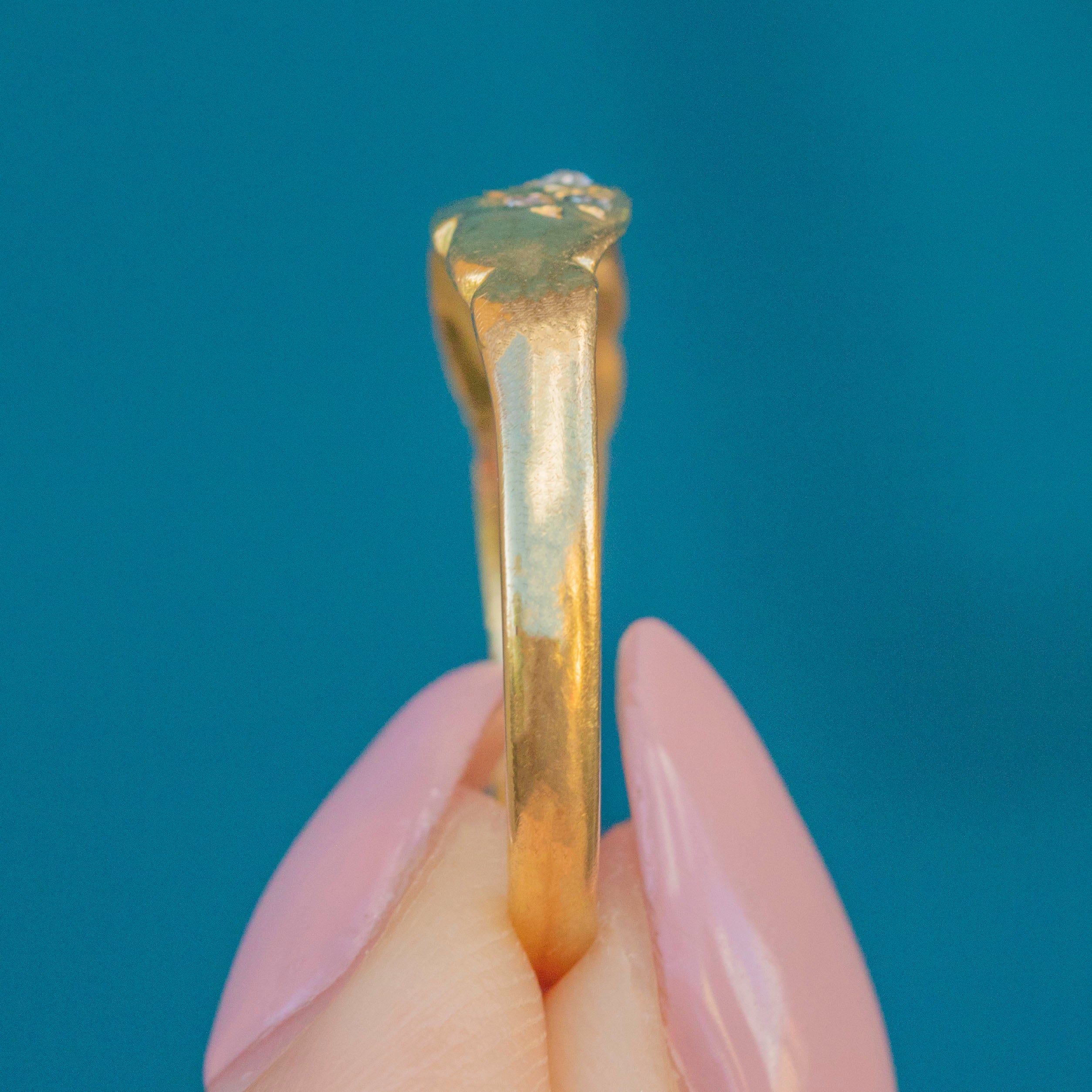 EXCELLENT. This lovely antique 18ct Gold Diamond twist ring is in perfect condition throughout. The Diamonds are clean and bright and set securely in tidy settings. The Gold is buttery and the band is smooth, feeling comfortable and robust.