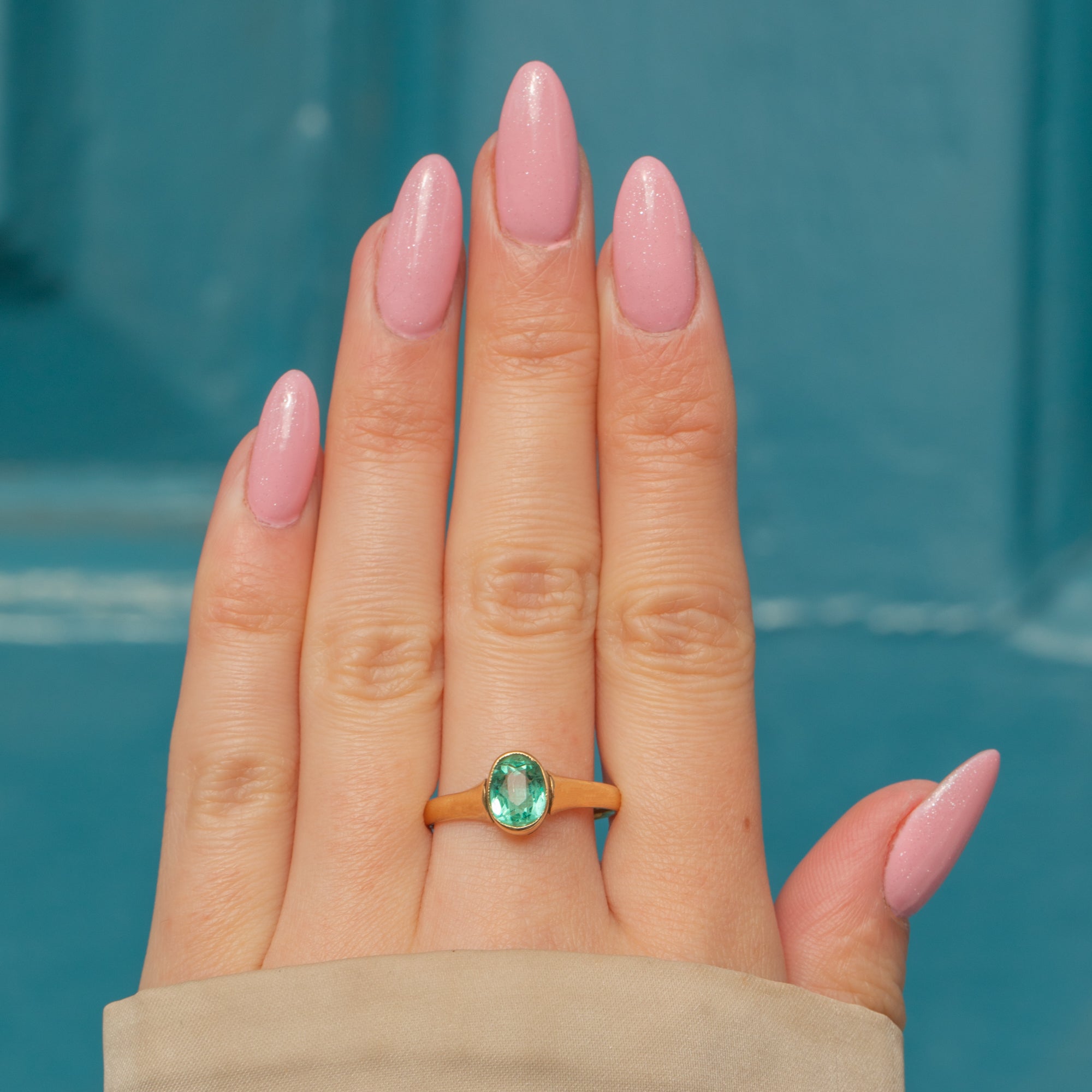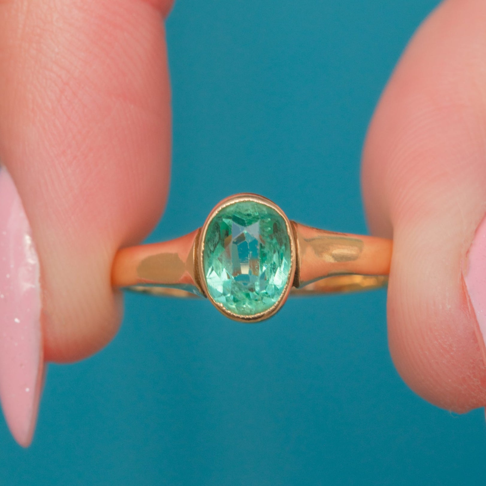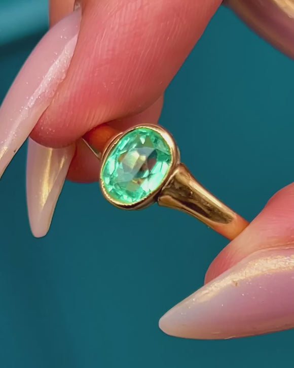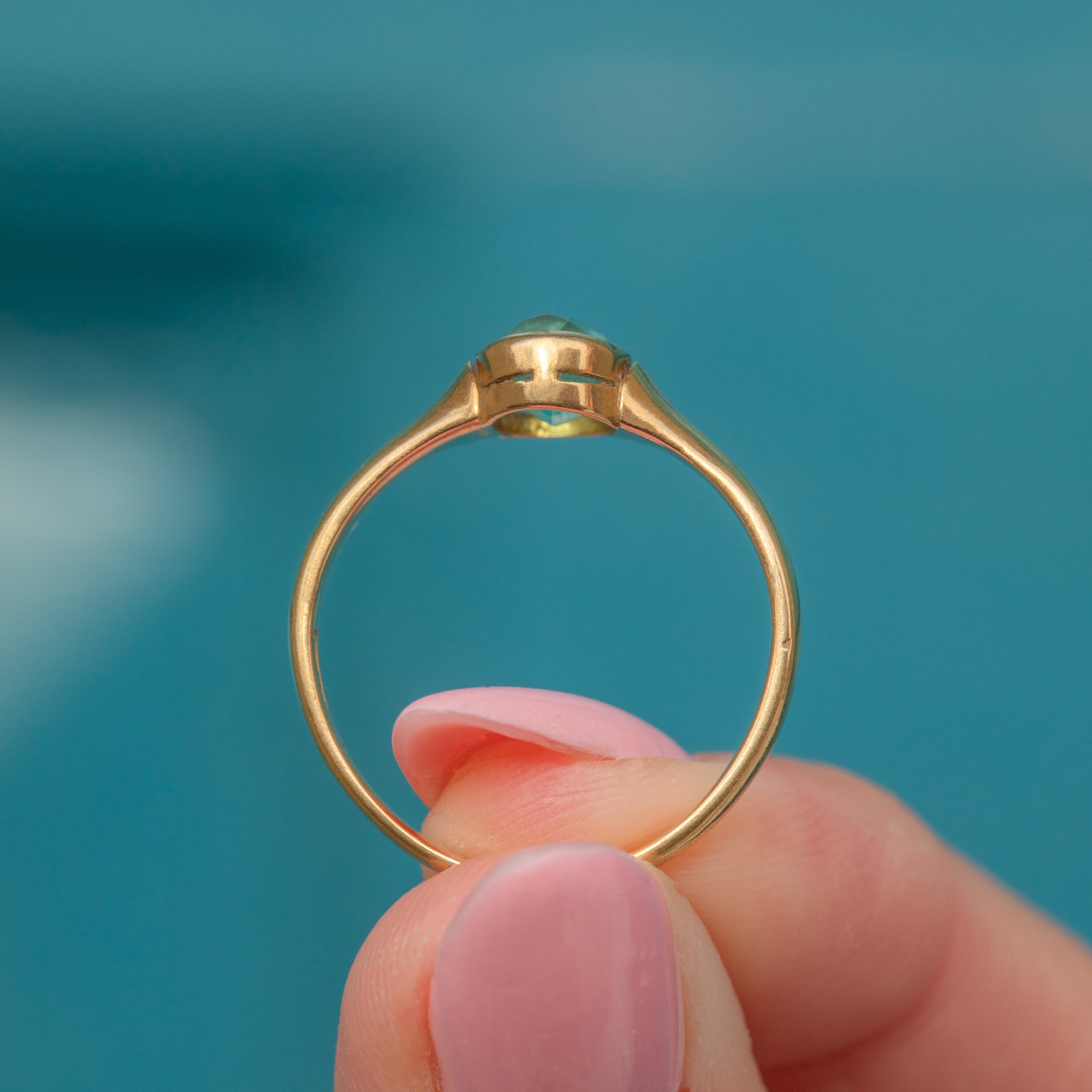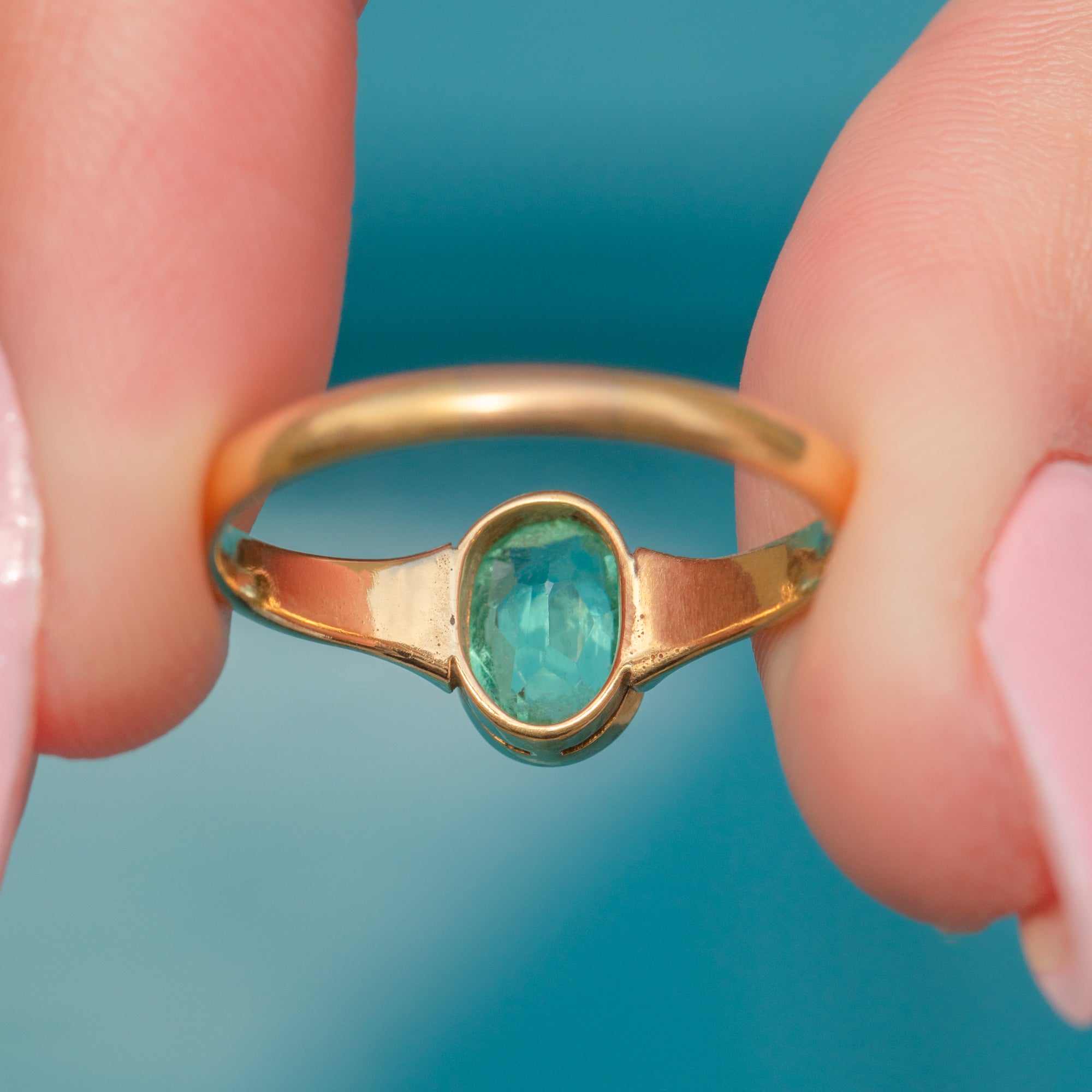 VERY GOOD: This antique 18ct Gold Emerald bezel-set ring is in very good condition. The Emerald is vibrant and free from chips, with only mild surface wear visible under the inspection of a jeweller's loupe. There is some wear to the bezel, but this does not impact the integrity of the piece, and the Emerald remains securely set. The 18ct Gold is brightly saturated and smooth, free from dings or scuffs. There is some evidence of a resize at the back, this is not particularly noticeable unless closely inspected. With proper care and maintenance, this ring will last for generations to come!