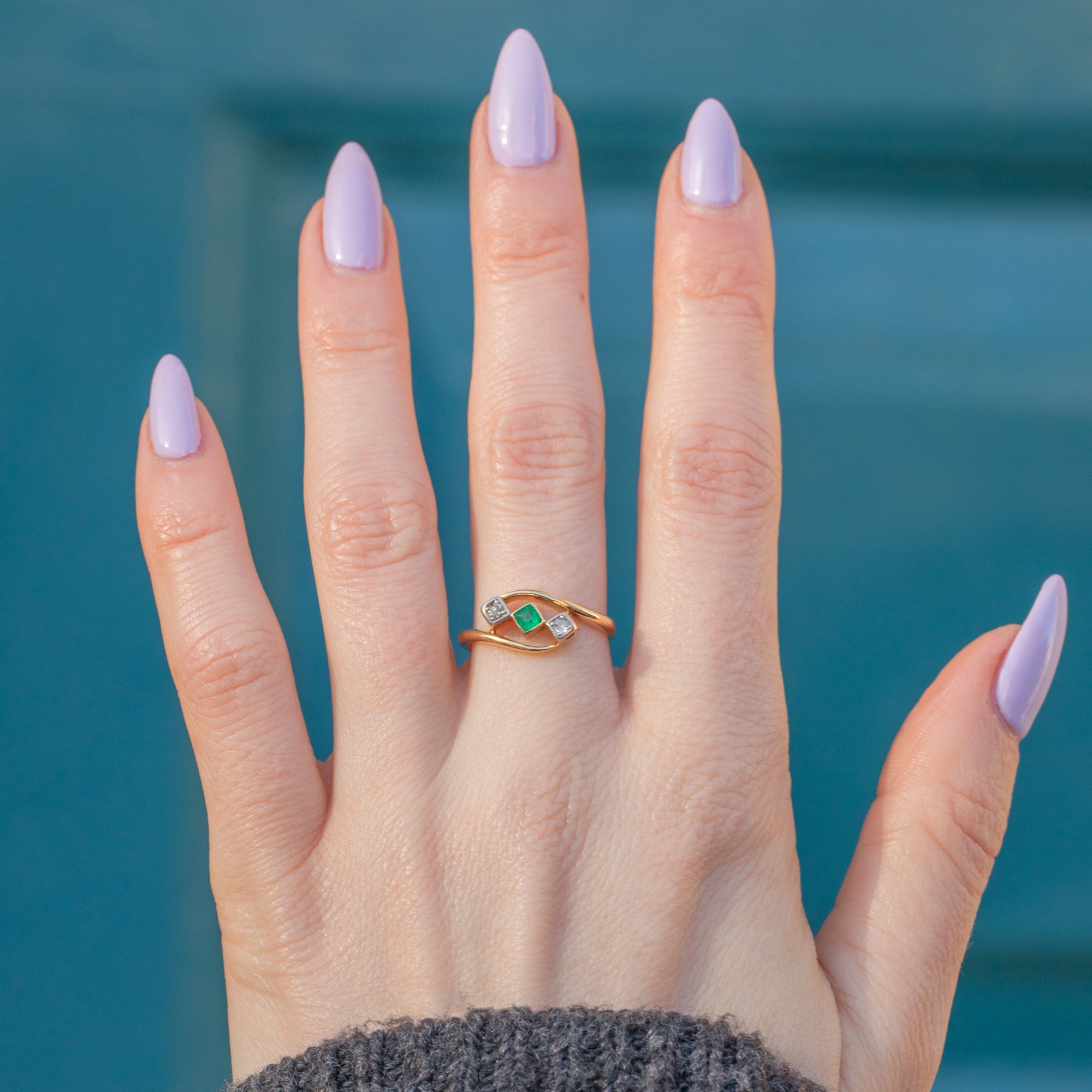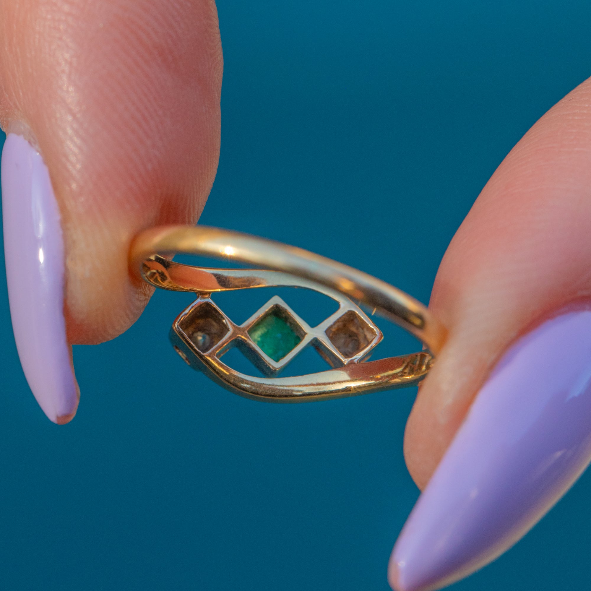 Antique 18ct Gold Emerald Diamond Bypass Ring