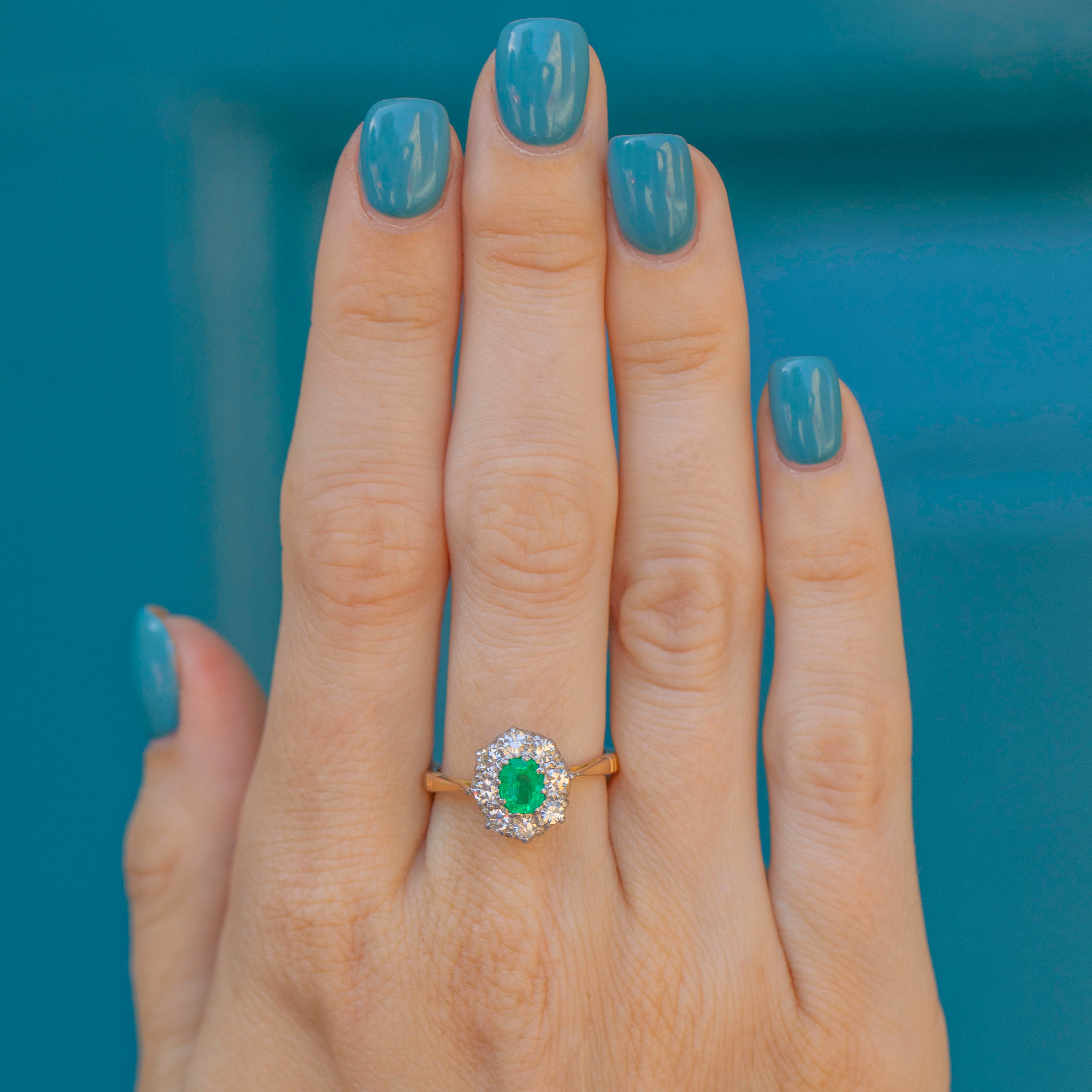 We are swooning over this antique 18ct Gold Emerald and Diamond cluster ring! This incredible ring is home to a 0.60ct Emerald with a vibrant grass-green hue, surrounded by a halo of crisp Diamonds with a satisfying scintillation.