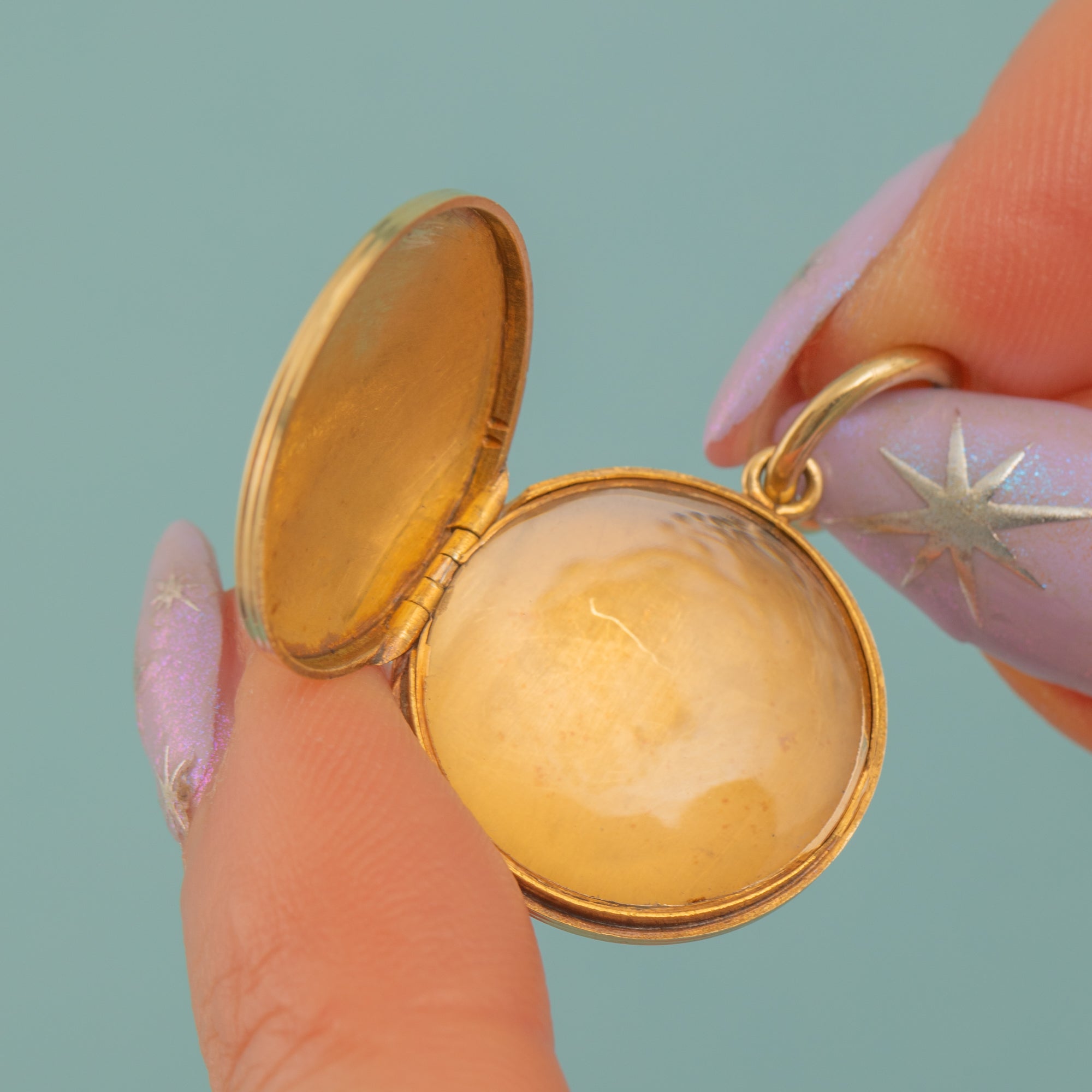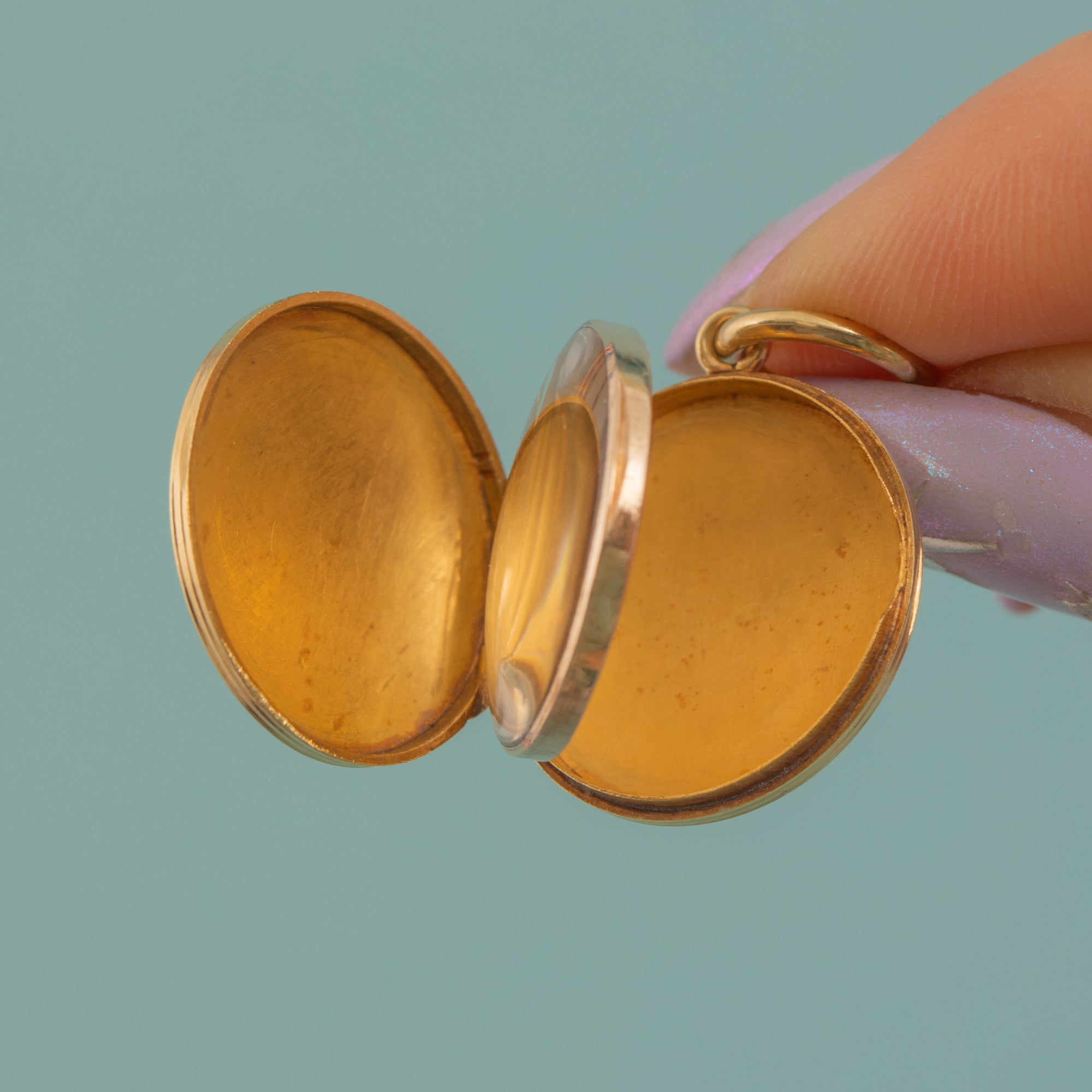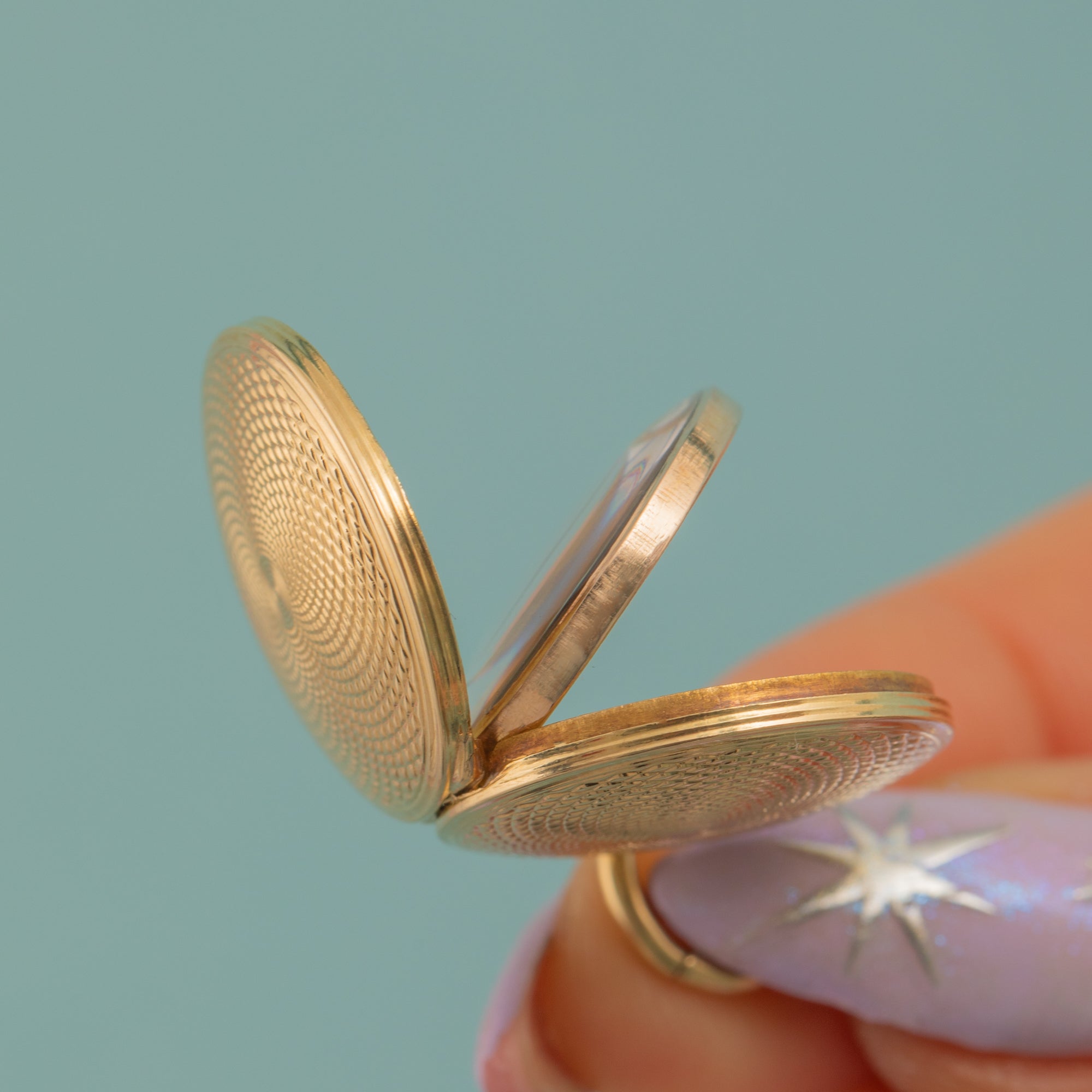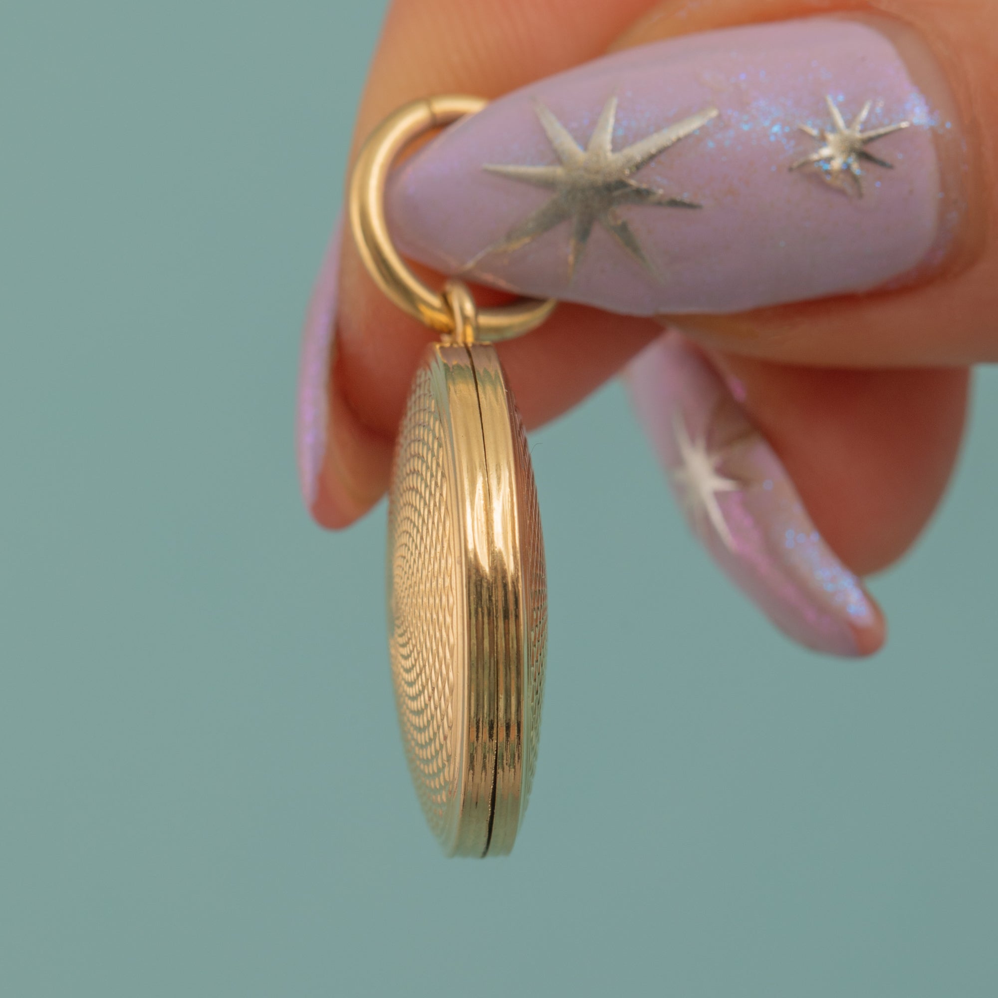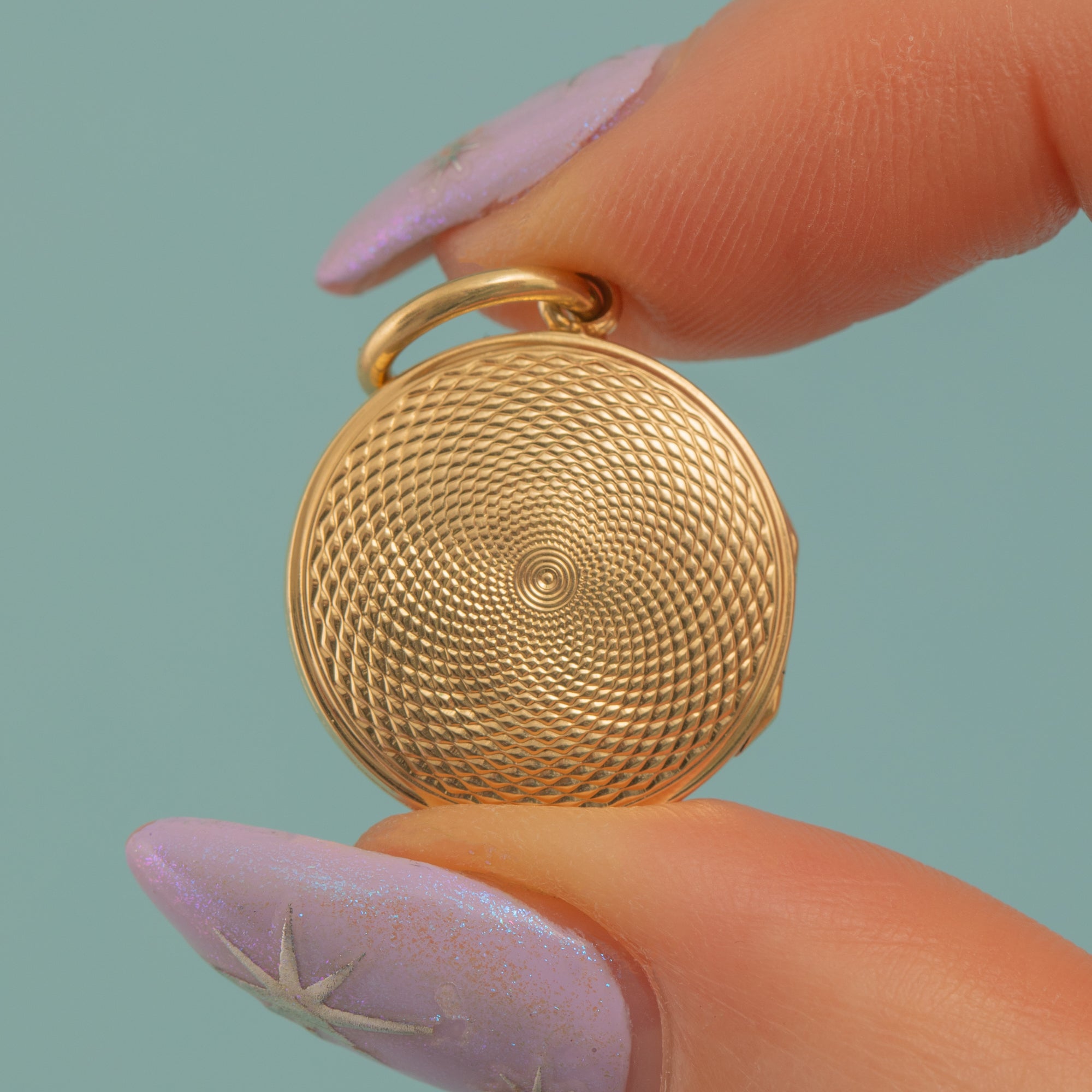 VERY GOOD. This antique 18ct Gold engine turned round locket is in very good condition. The Gold is bright and the engine turned details have remained defined with no surface wear. The locket does require a firm push to open, but it closes securely and the glass-panelled door will keep your chosen photo or keepsake securely inside. Complete with a generously sized jump ring, you can easily pair this antique Gold locket with your chain of choice!