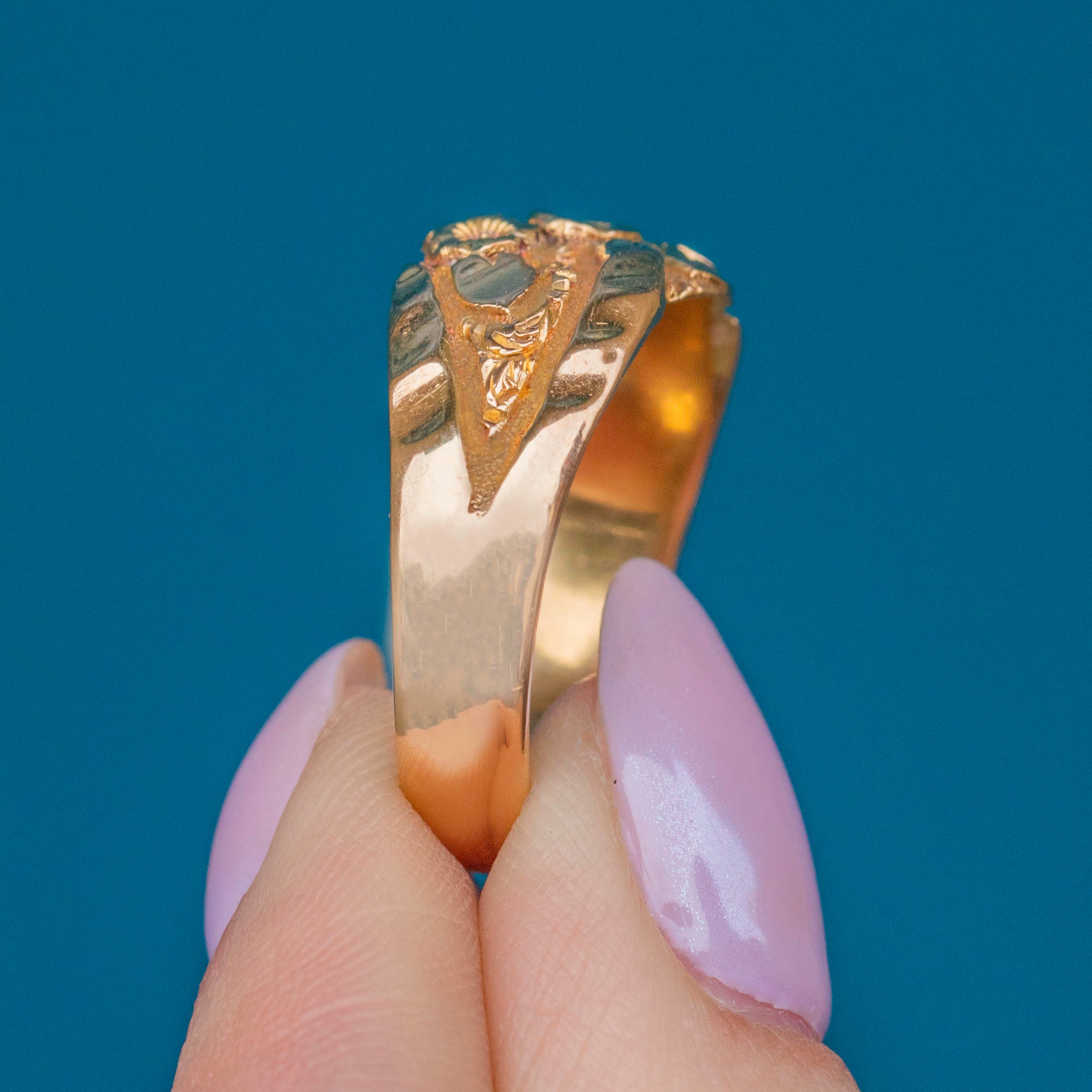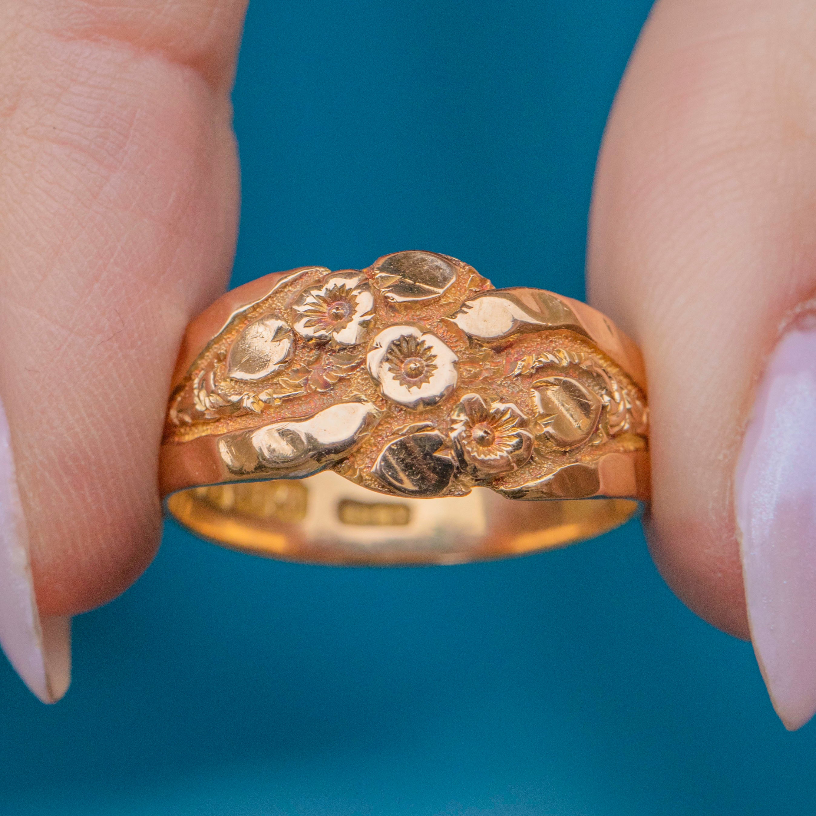 This beautiful antique 18ct Gold engraved heart forget-me-not keeper ring is bursting with romantic sentiment! Crafted from a sumptuous 18ct Gold, this Edwardian ring features sweet floral engravings symbolising everlasting love making her the perfect love token.