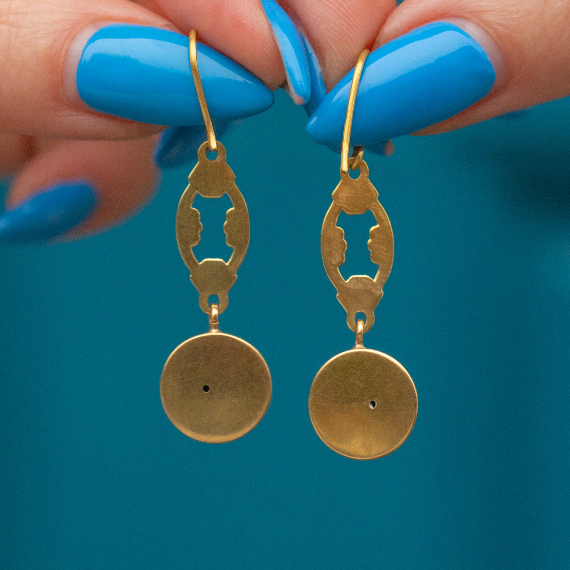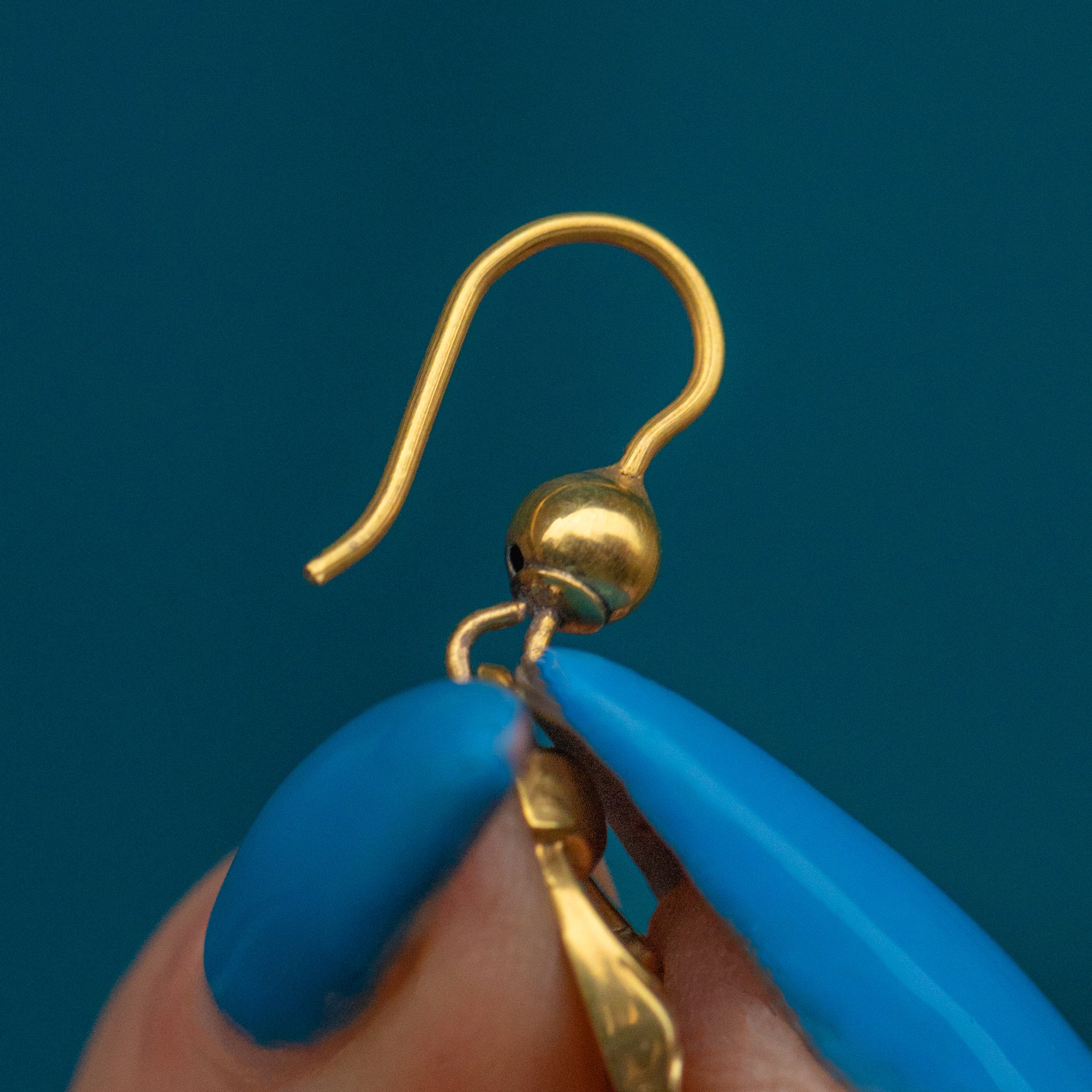 EXCELLENT. These antique 18ct Gold fancy drop earrings are in excellent condition. The earrings have gorgeous shape, and the finish is lovely, almost brushed. These earrings can be love and adored for decades more!