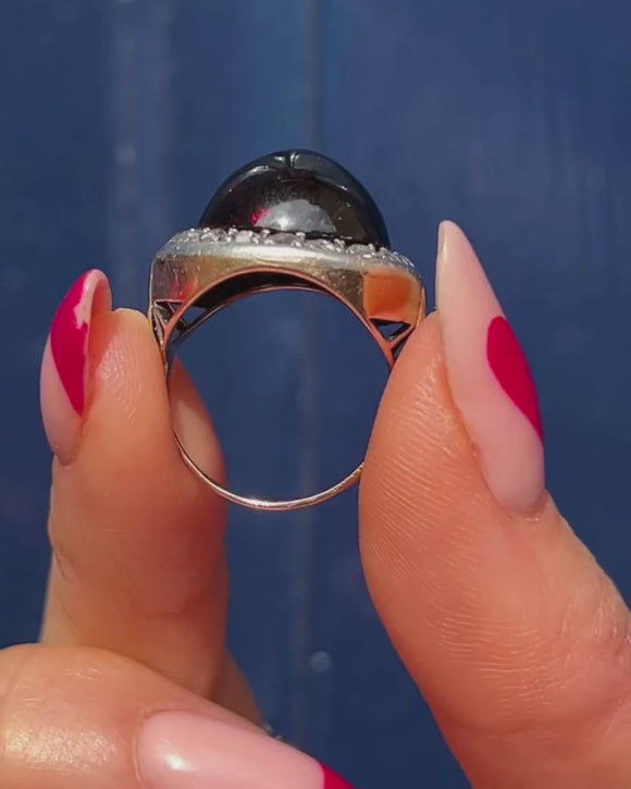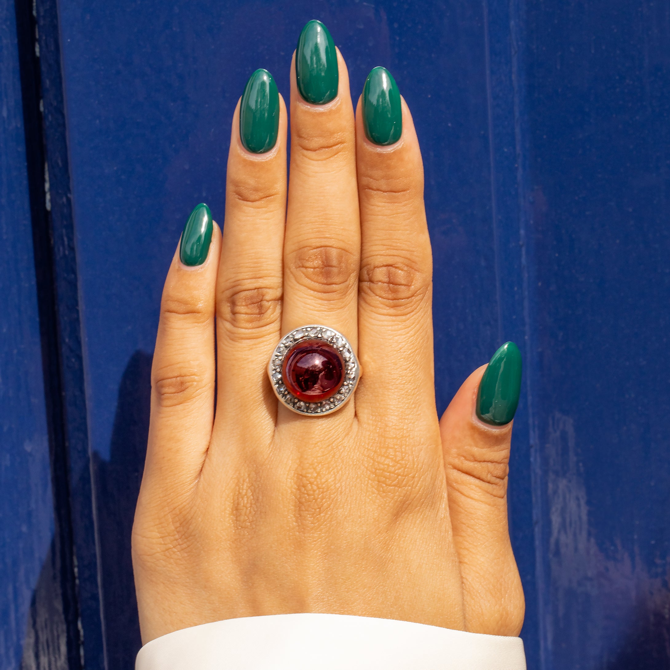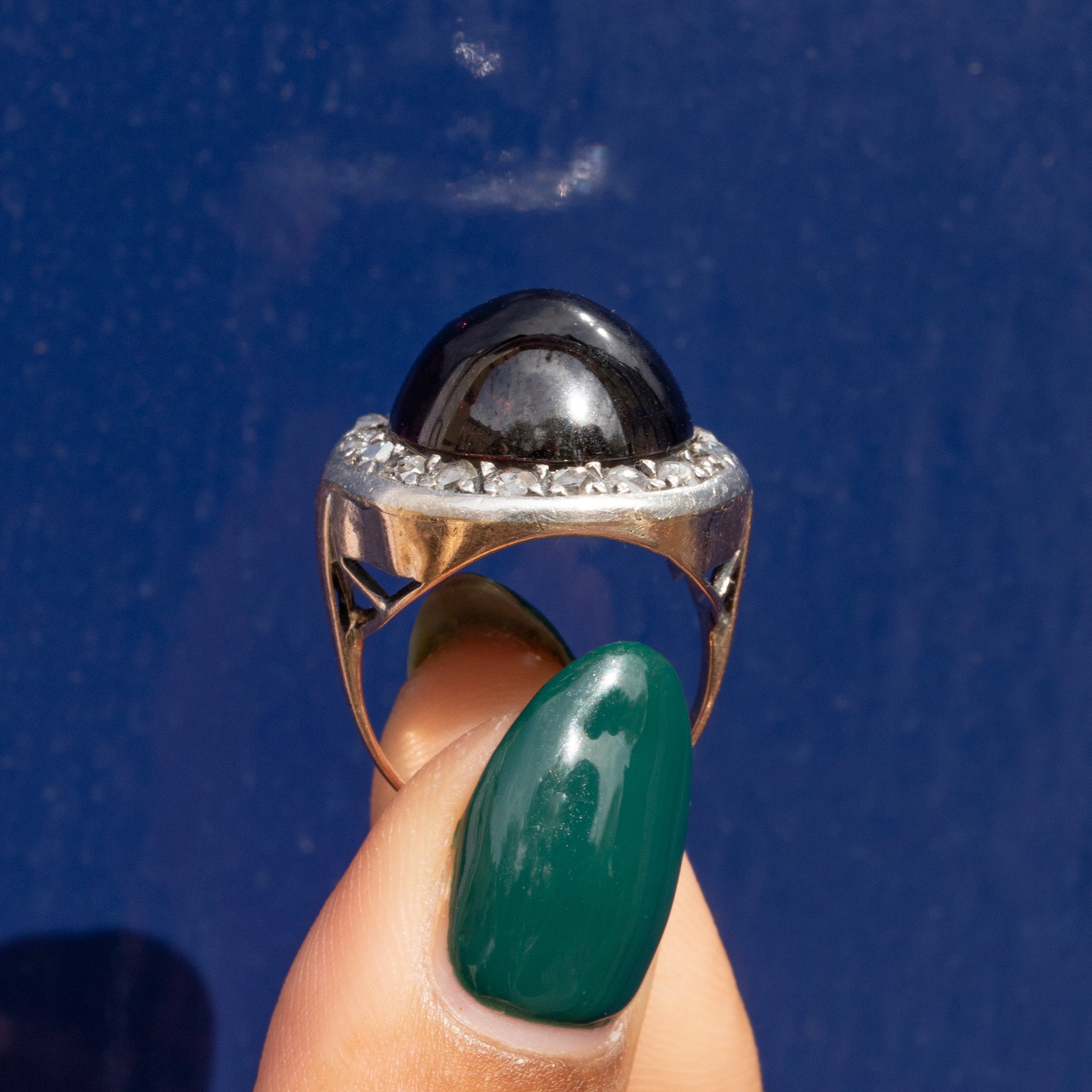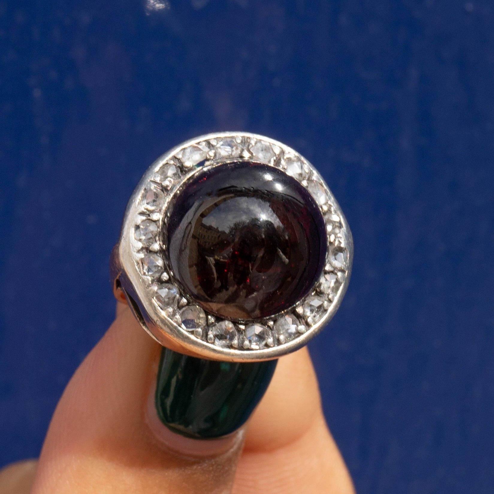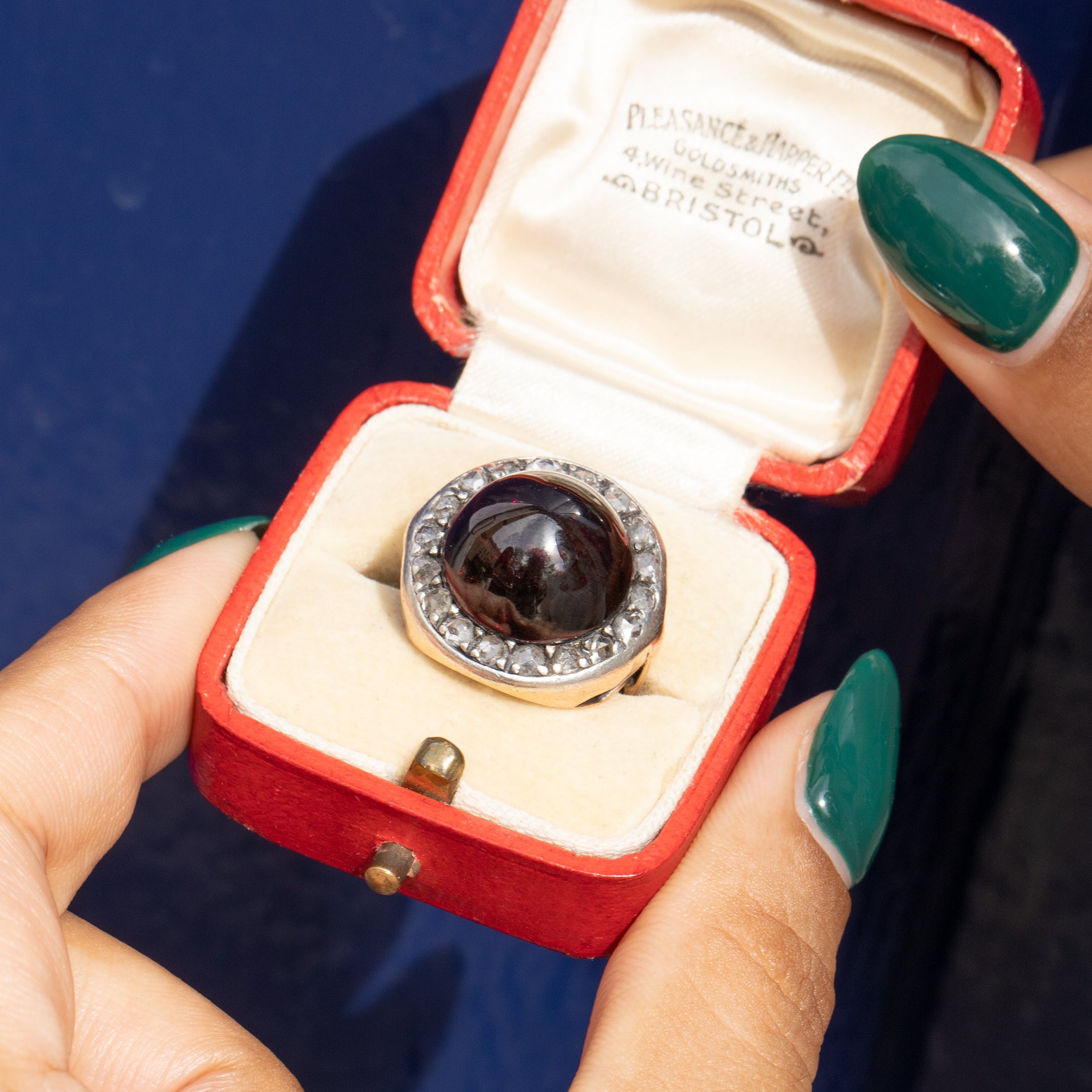 アンティーク 18ct ゴールド ガーネット カボション ダイヤモンド クラスター リング、31.19ct ガーネット