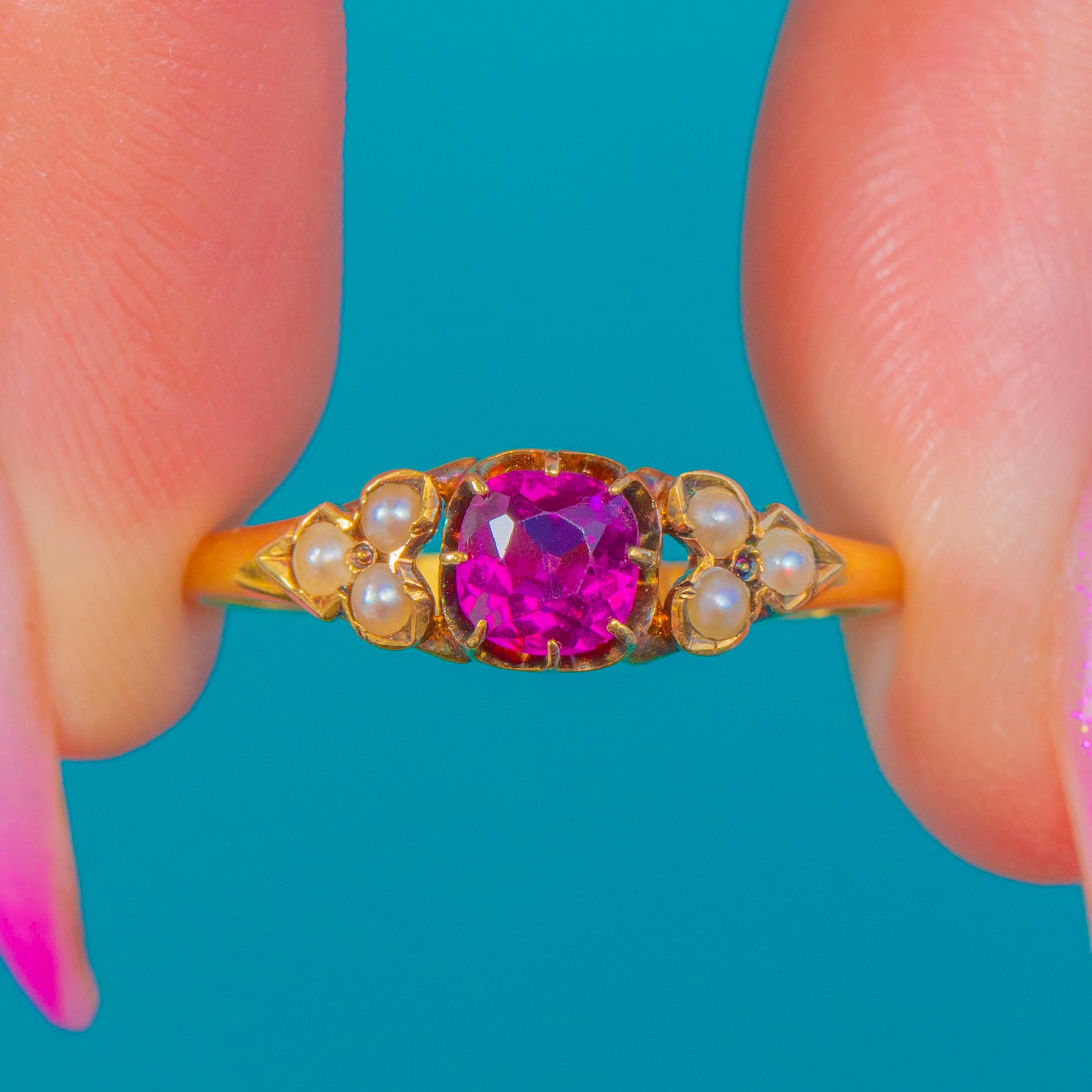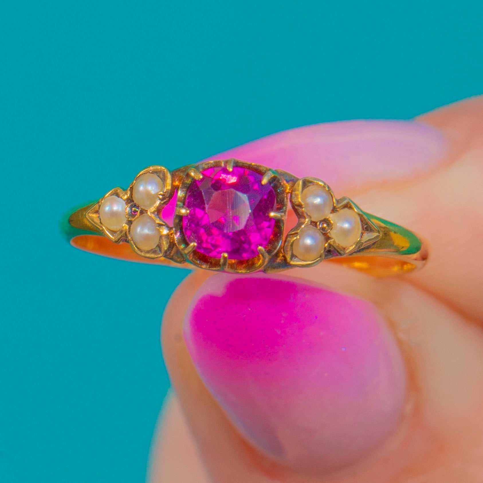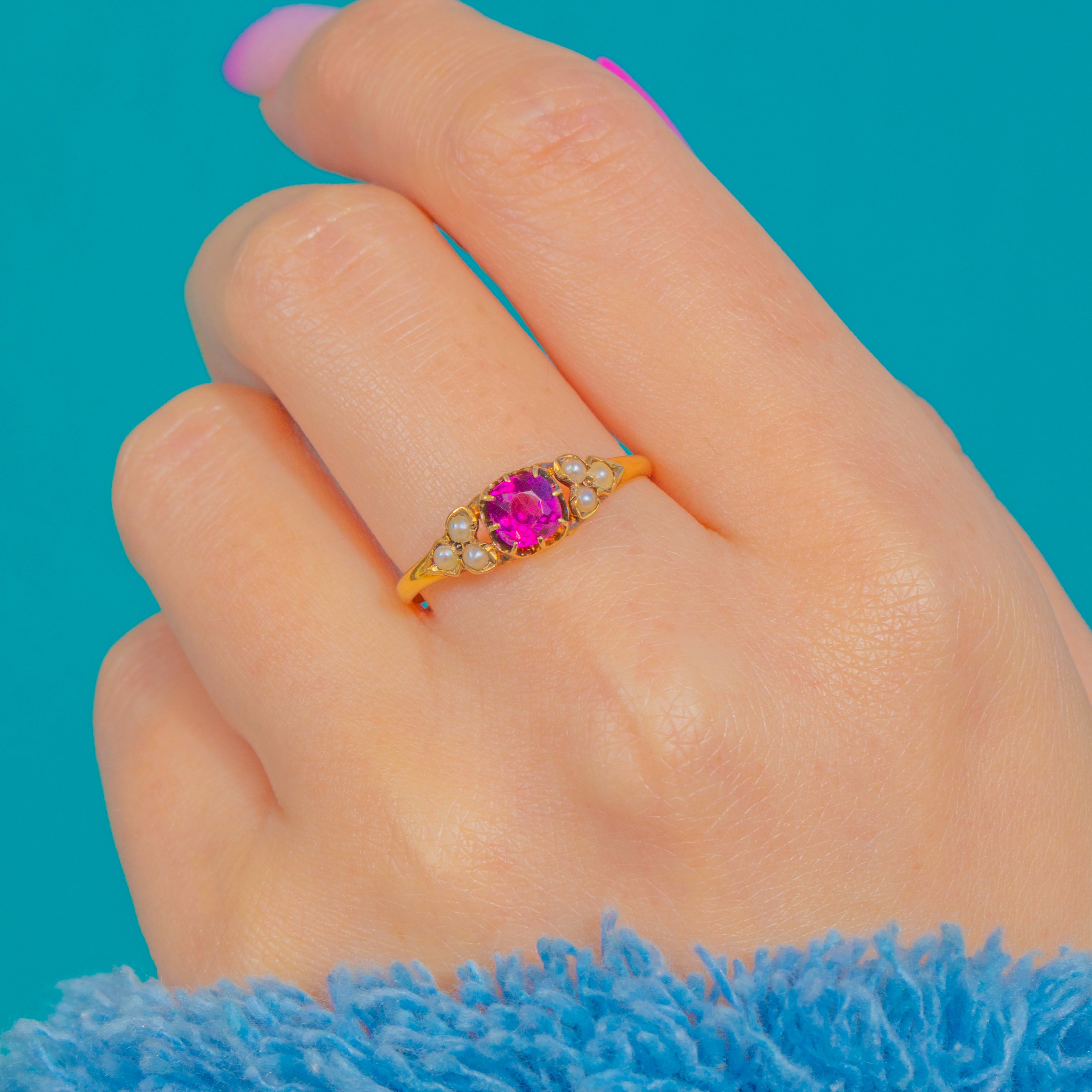 可憐な花束のような佇まいを持つこのVictorian 18ctゴールドリングは、鮮やかなマゼンタピンクのガーネットを中央に配し、両肩にはクリーミーなシードパールの三つ葉クラスターが優美に寄り添います。繊細でロマンティックなデザインは、低めのセッティングと細くテーパードしたシャンクによって、手元に美しいシルエットを描きます。