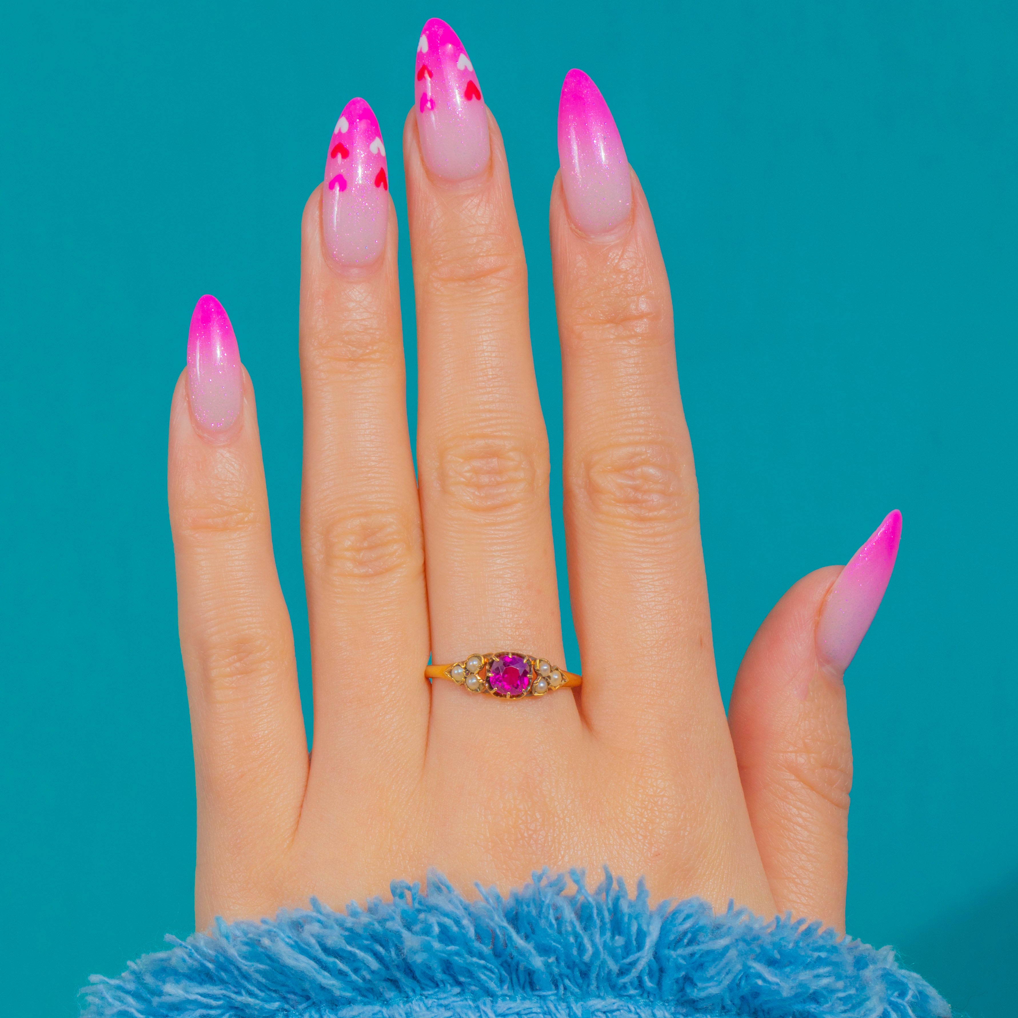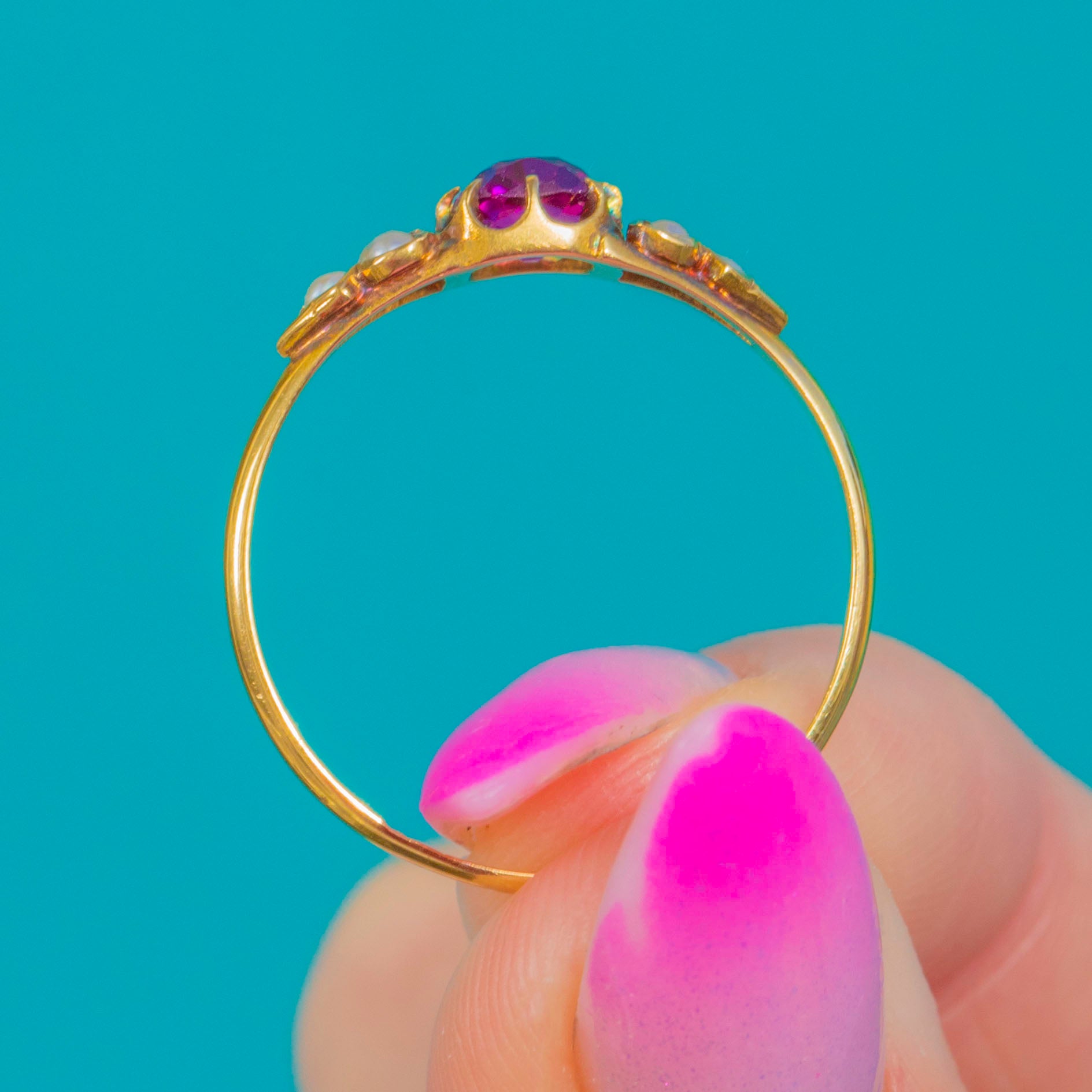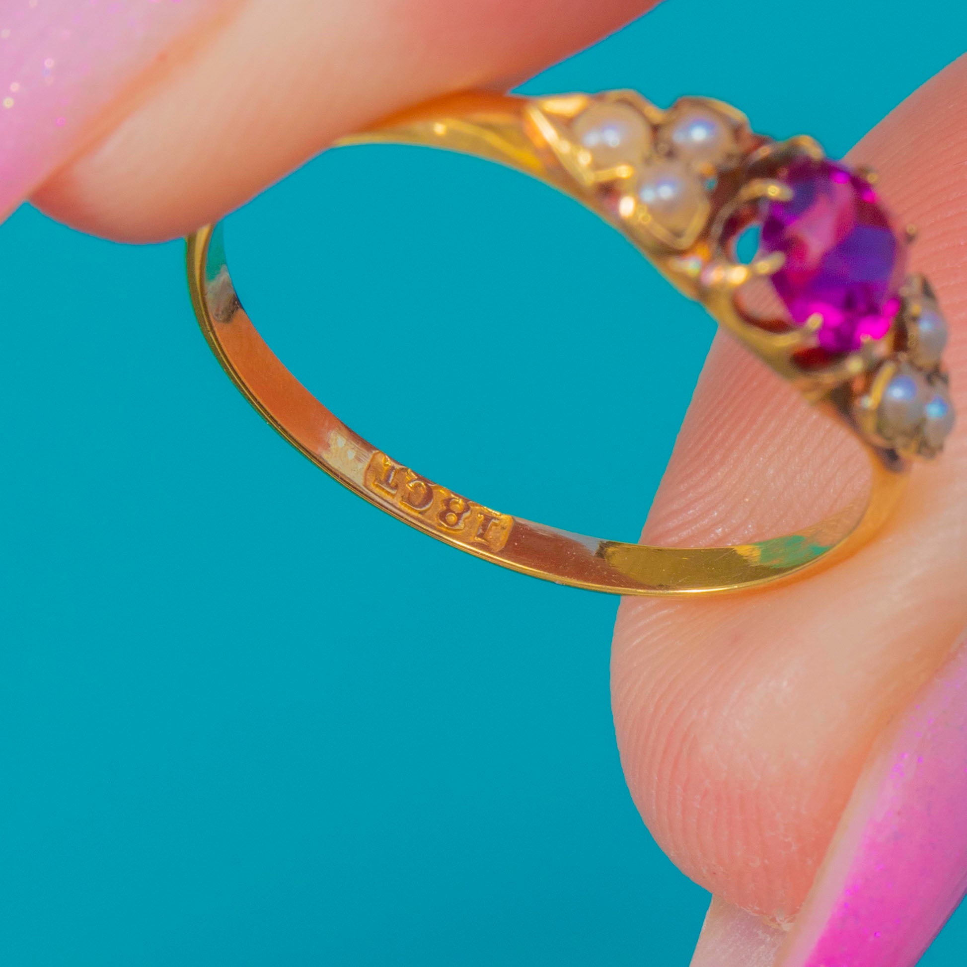 可憐な花束のような佇まいを持つこのVictorian 18ctゴールドリングは、鮮やかなマゼンタピンクのガーネットを中央に配し、両肩にはクリーミーなシードパールの三つ葉クラスターが優美に寄り添います。繊細でロマンティックなデザインは、低めのセッティングと細くテーパードしたシャンクによって、手元に美しいシルエットを描きます。