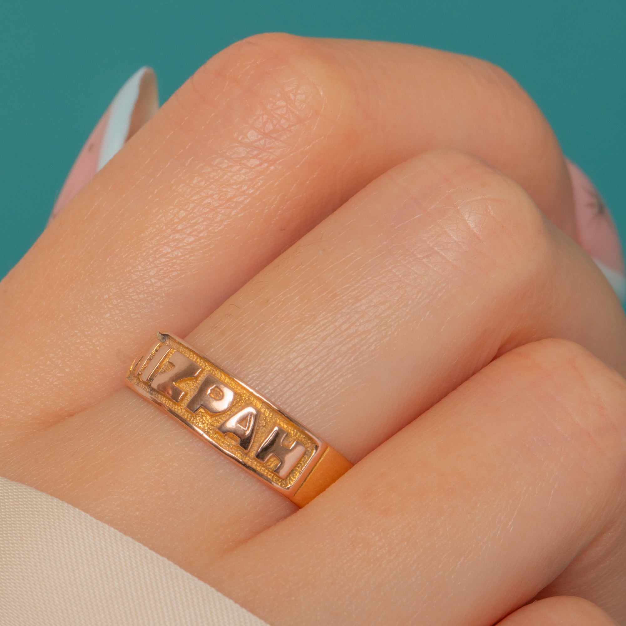 A classic Victorian “MIZPAH” ring in rich 18ct Gold, the word picked out in bold raised letters against a recessed, textured panel. The shoulders taper to a smooth, comfortable shank, creating a clean, graphic silhouette that feels both sentimental and striking.