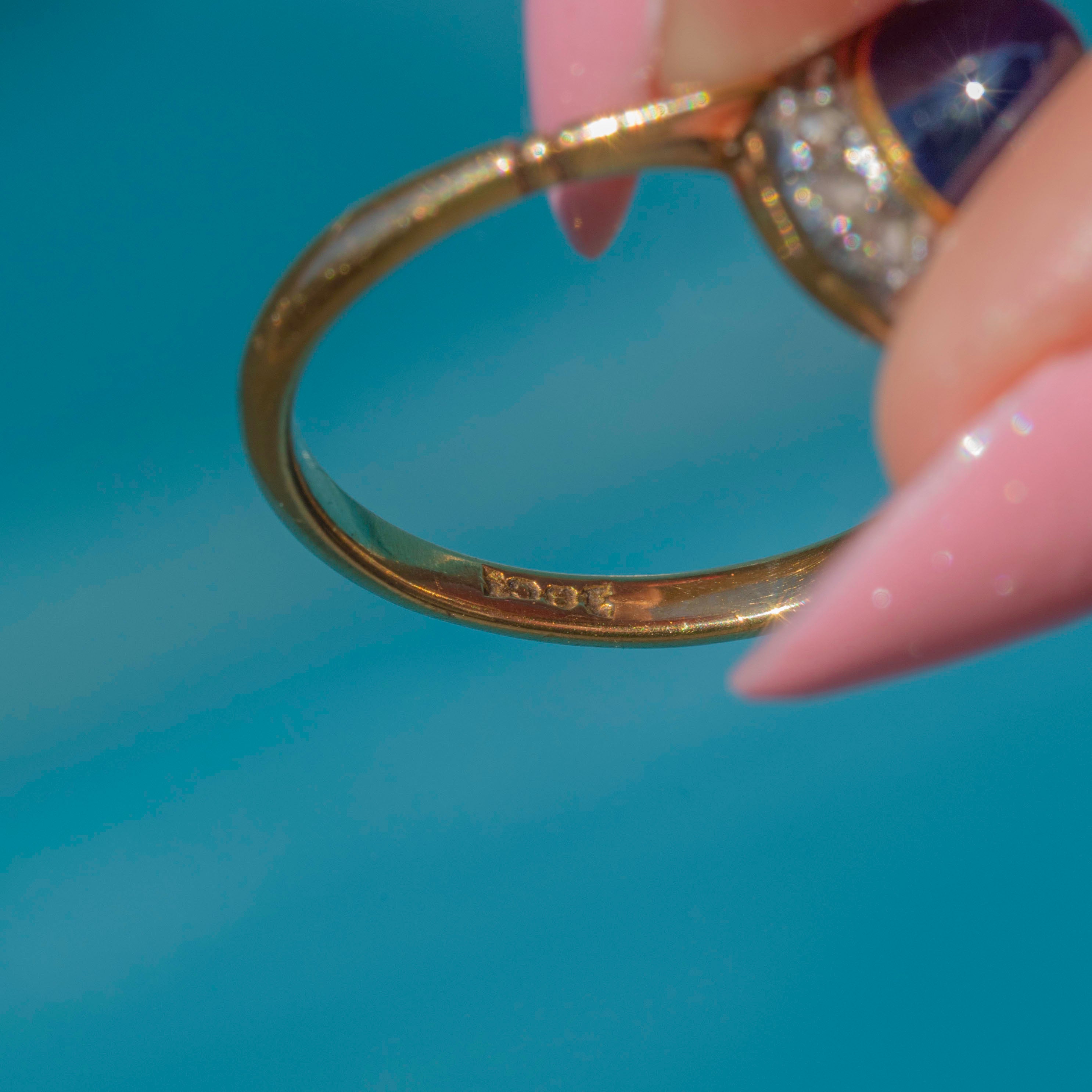 EXCELLENT: This antique 18ct Gold Natural Sapphire cabochon Diamond cluster ring is a truly gorgeous choice for your collection. This treasure has a large cabochon-cut Sapphire at its centre, which has a smooth, almost sugarloaf dome and is free from chips or scuffs. The Diamonds are all secure in their settings and sparkle beautifully. Her 18ct Gold is bright and saturated, with only mild age-related wear to her band. Crafted from robust materials, this exquisite Edwardian ring would make a fabulous choice for a unique engagement ring!