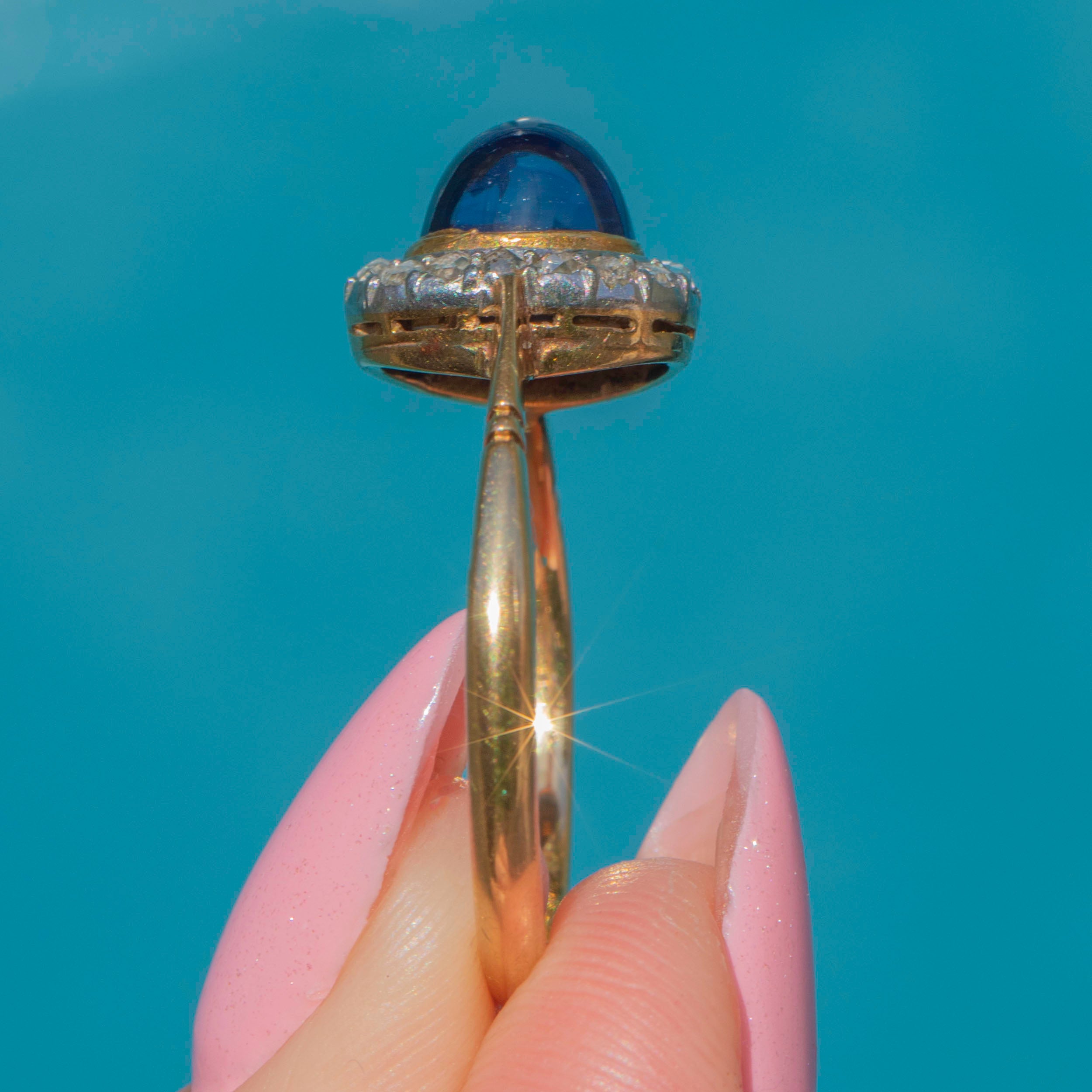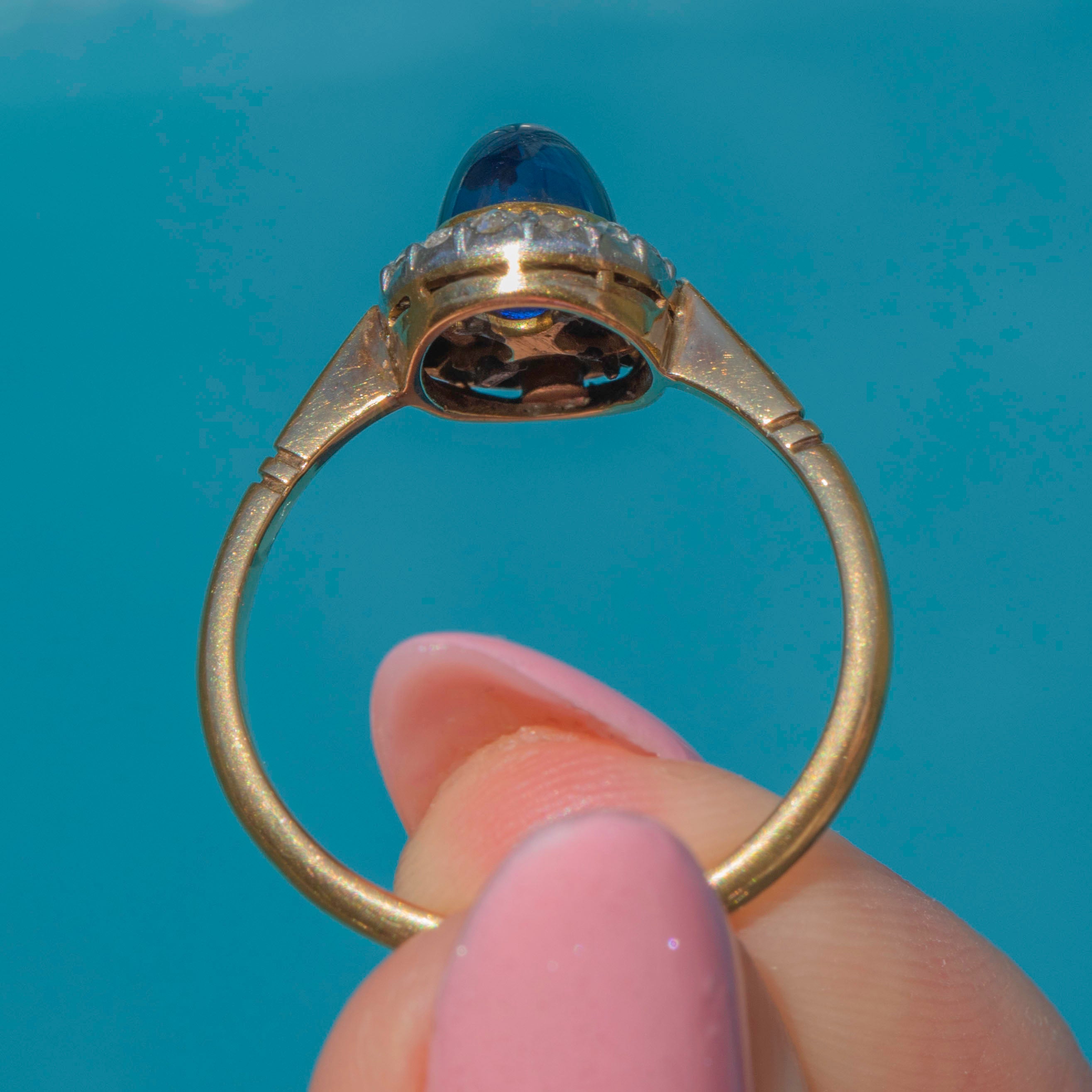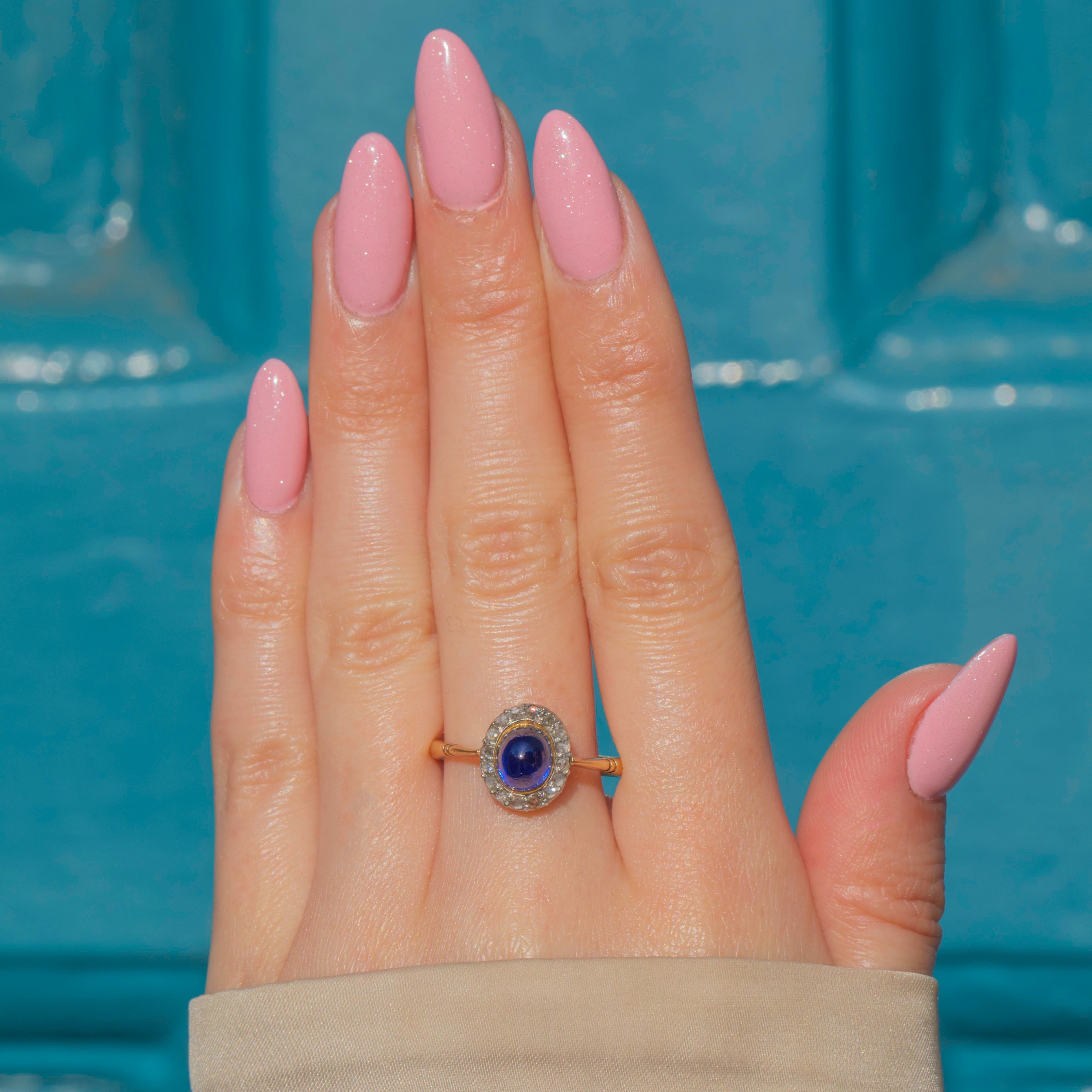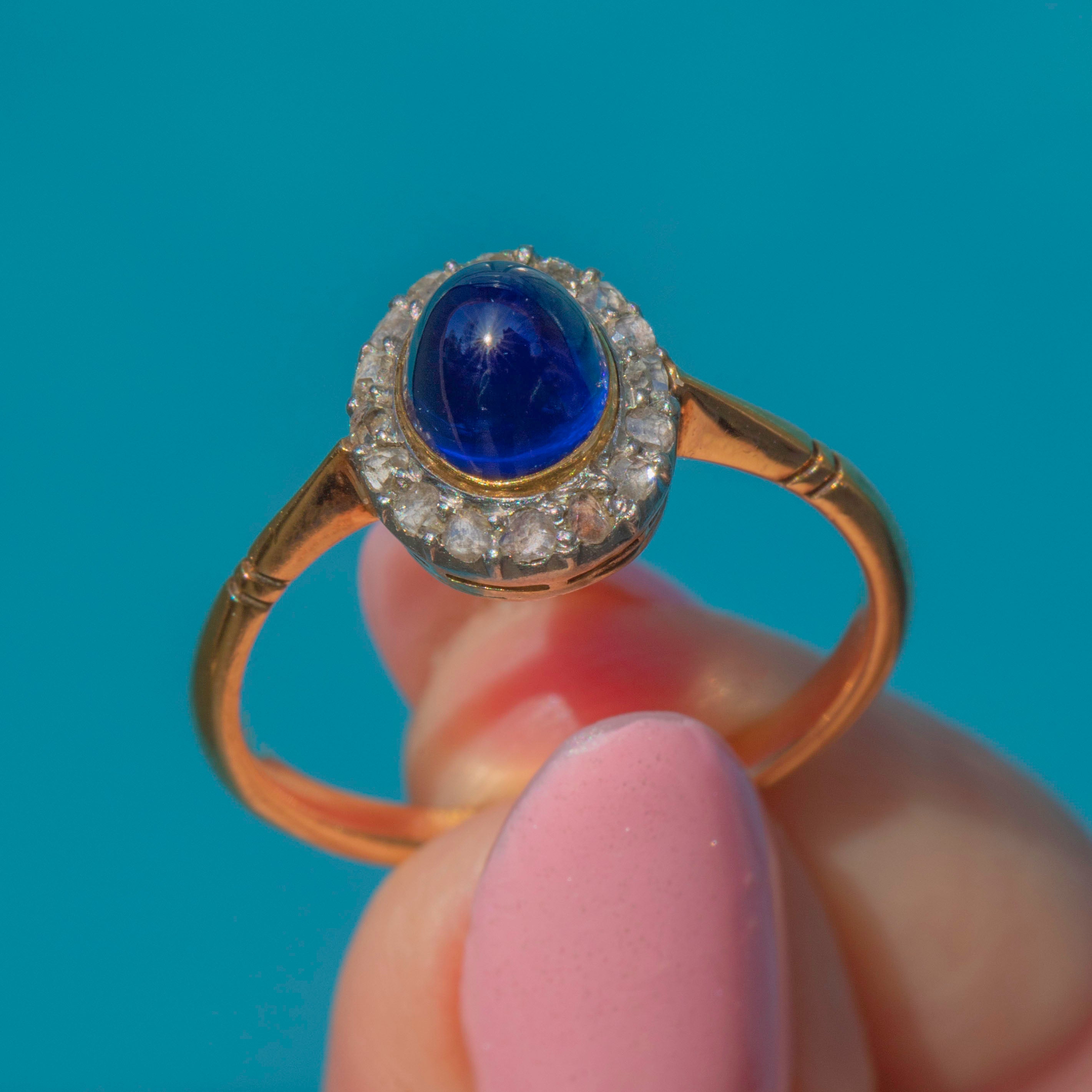 Antique 18ct Gold Natural Sapphire Cabochon Diamond Cluster Ring, 1.36ct Sapphire