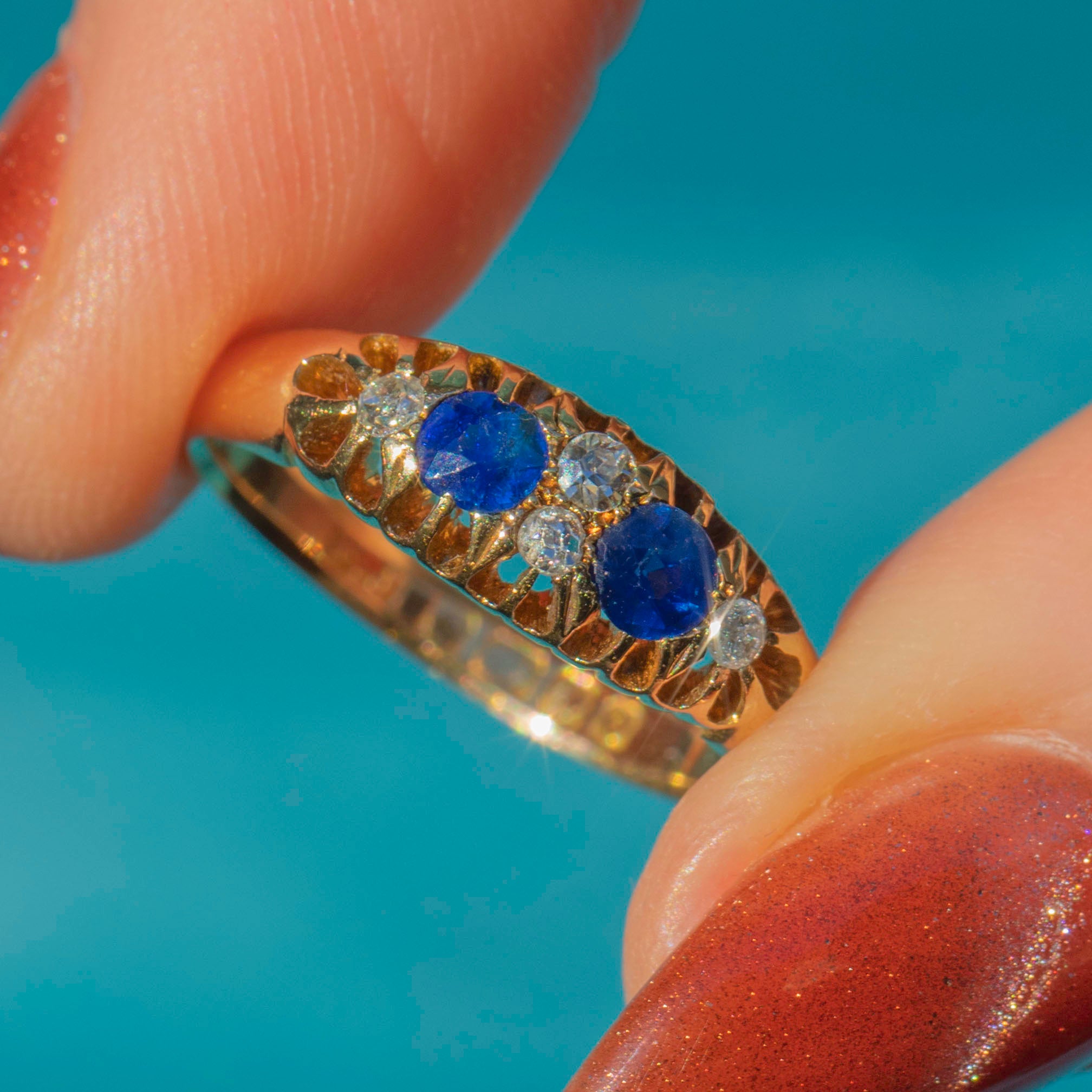 The band is crafted from saturated and luxurious 18ct Gold, the perfect backdrop for the sweet Sapphires and dazzling Diamonds. With a full set of English hallmarks dating to 1913, this antique Sapphire Diamond ring will make a coveted addition to your collection!