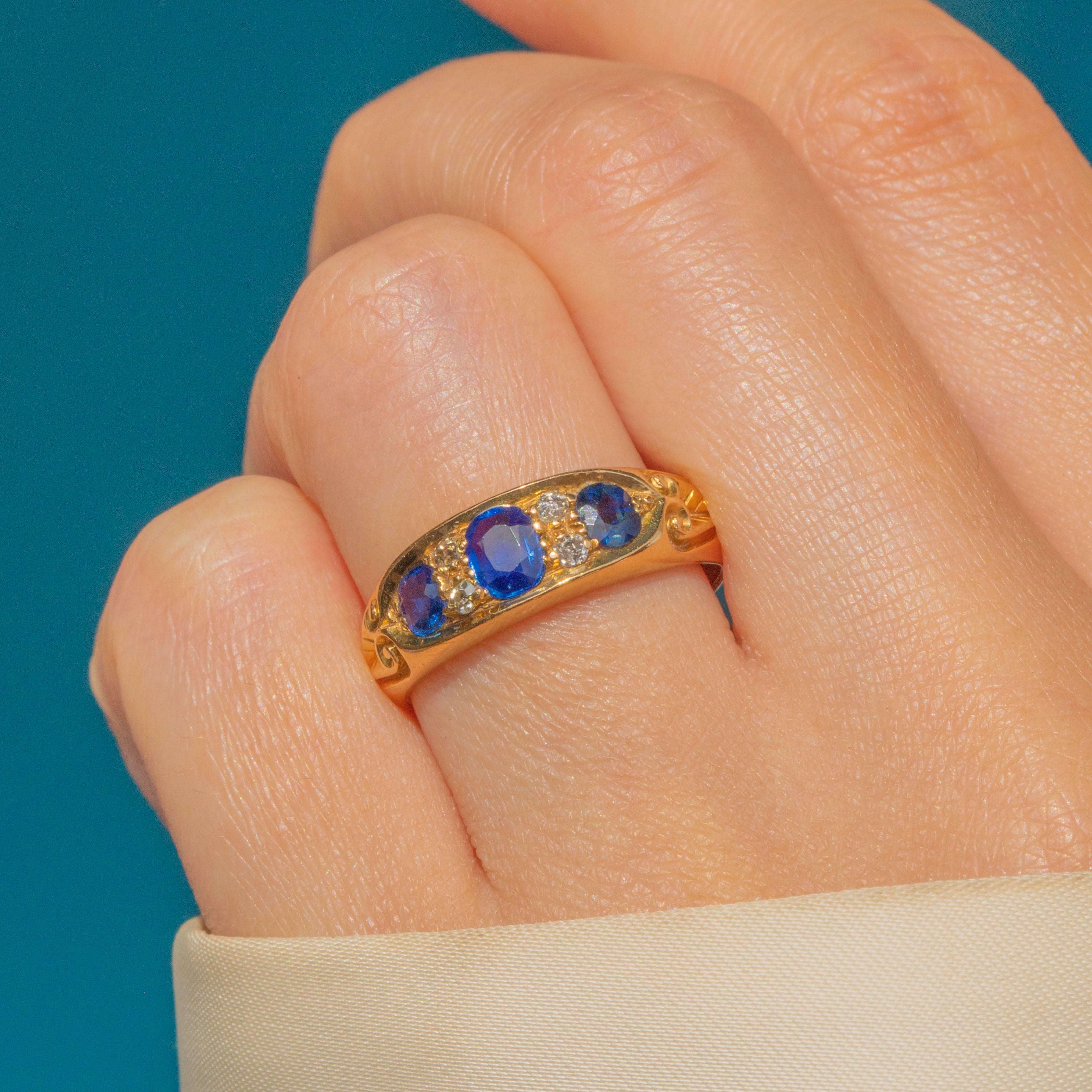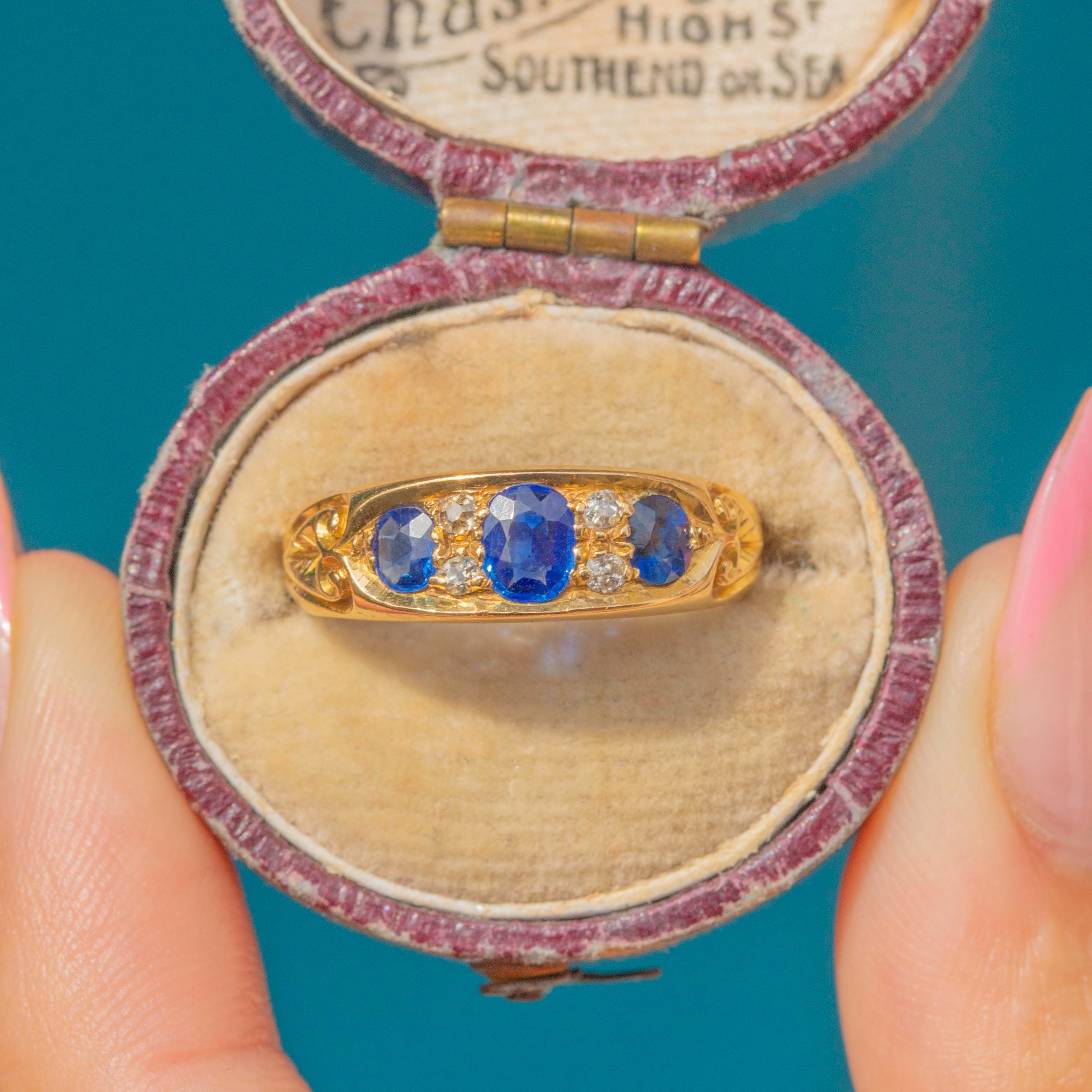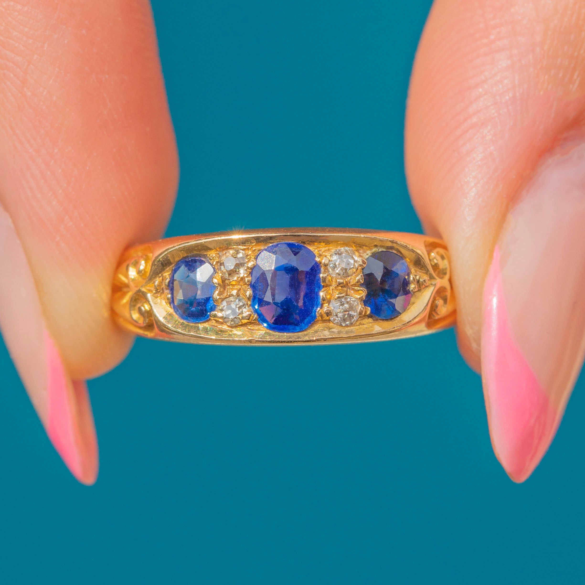 The classic boat design of this Edwardian ring displays a resplendent combination of gems, with 0.36cts of royal blue Sapphires offset by bright Diamonds. The gemstones glimmer and glint under the light, flanked by ornately engraved shoulders adding a decorative finish.