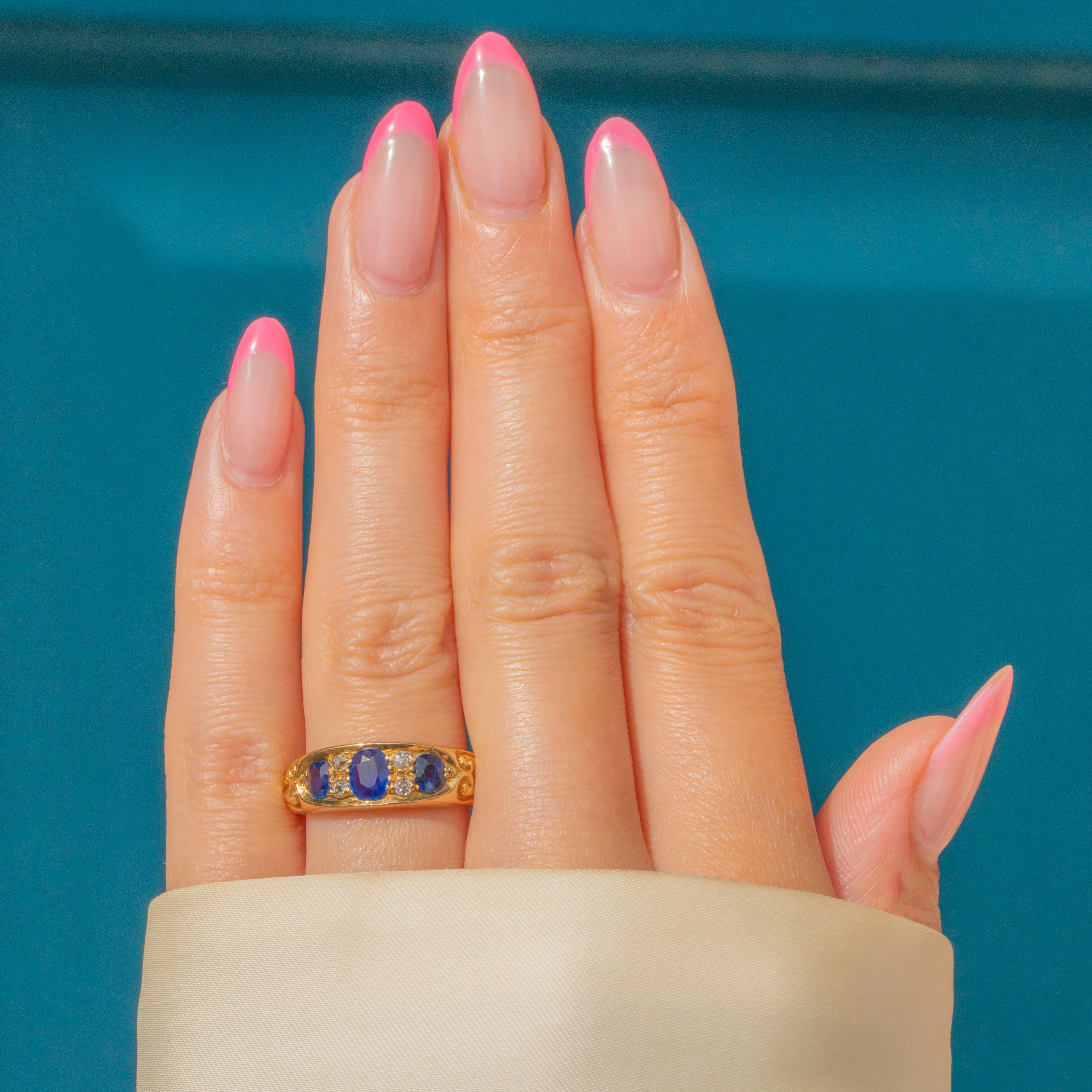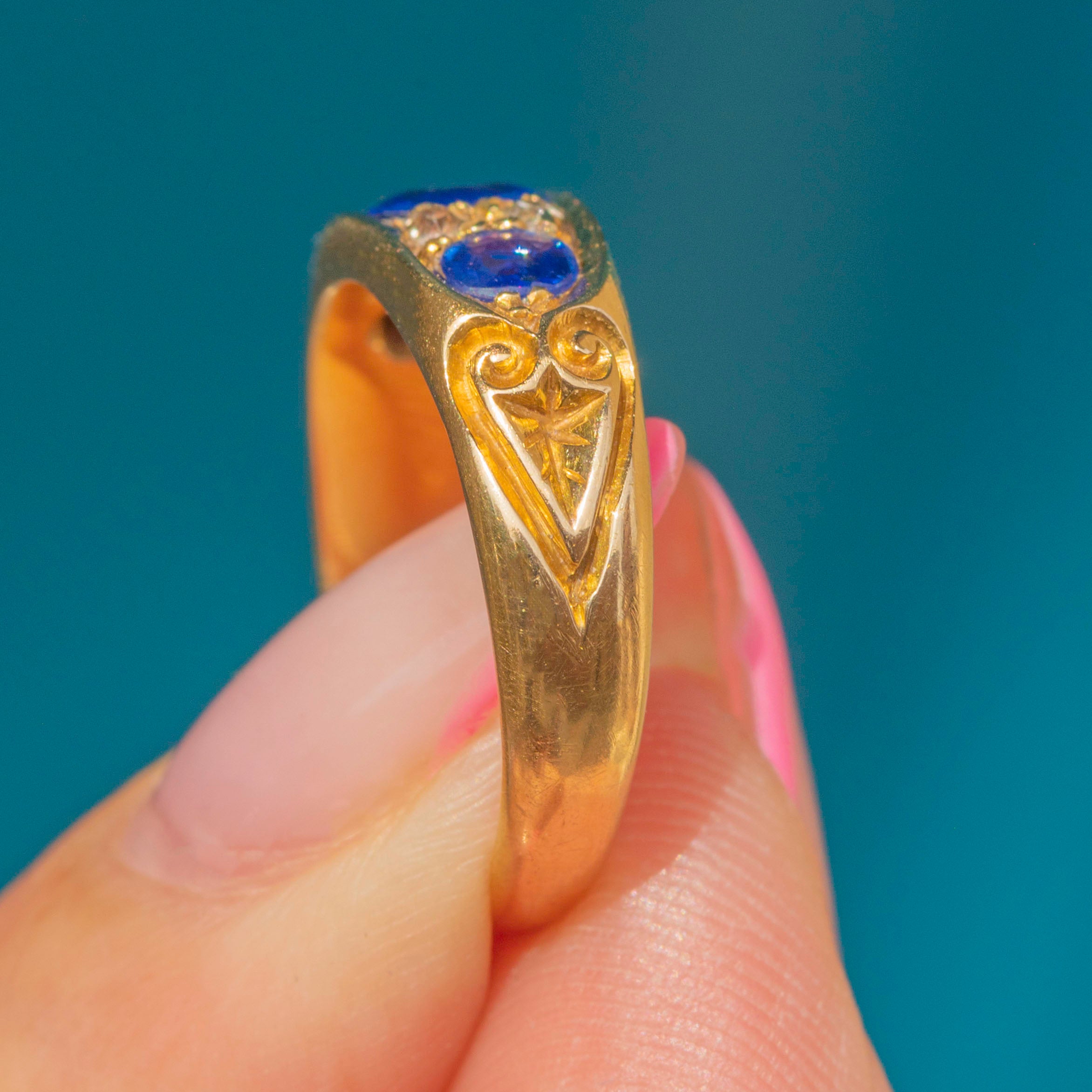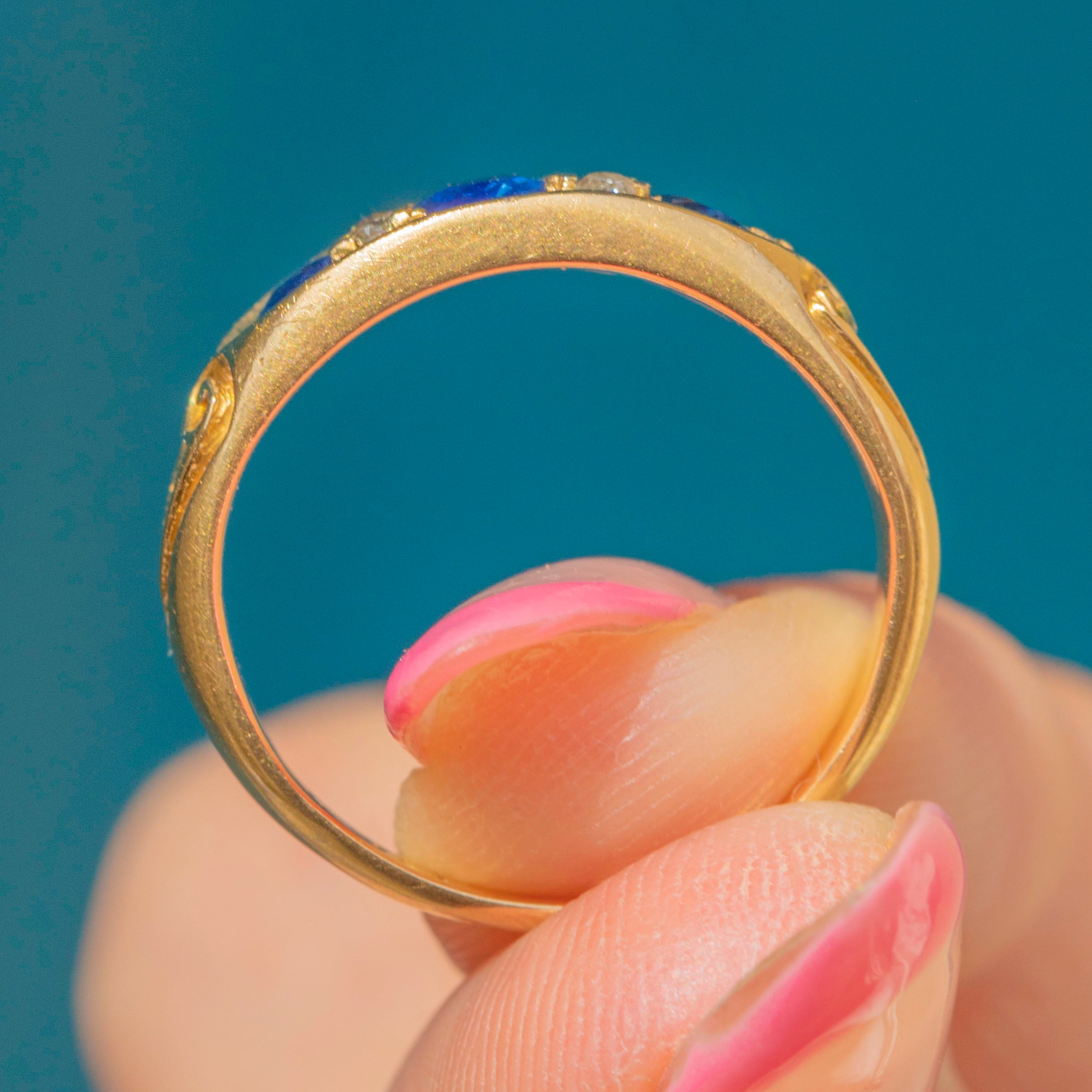 The classic boat design of this Edwardian ring displays a resplendent combination of gems, with 0.36cts of royal blue Sapphires offset by bright Diamonds. The gemstones glimmer and glint under the light, flanked by ornately engraved shoulders adding a decorative finish.