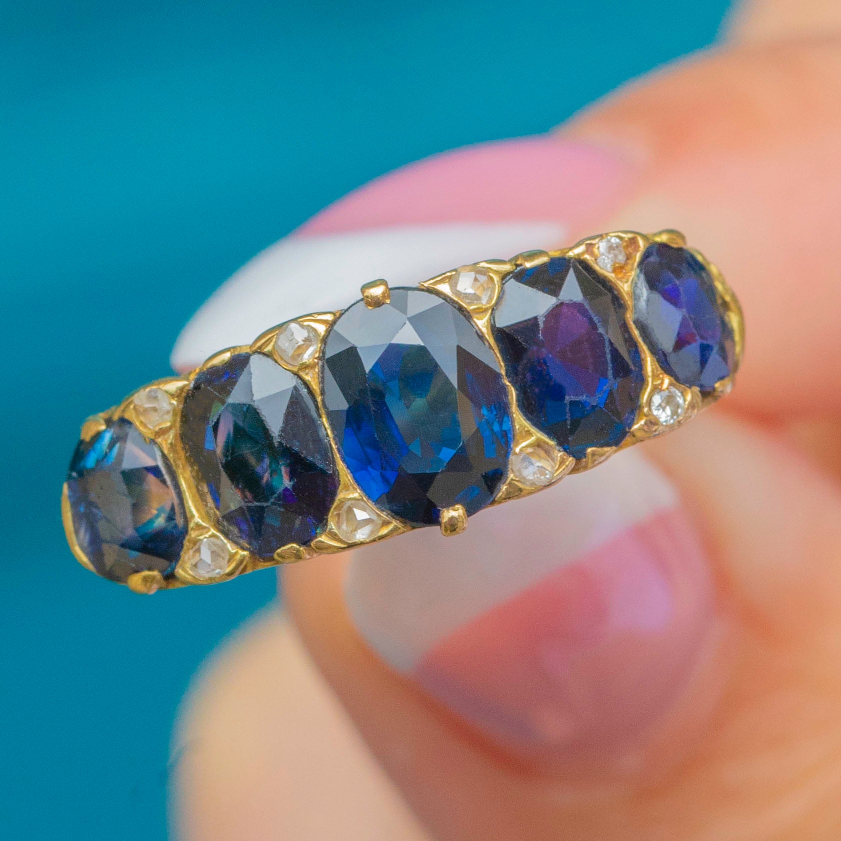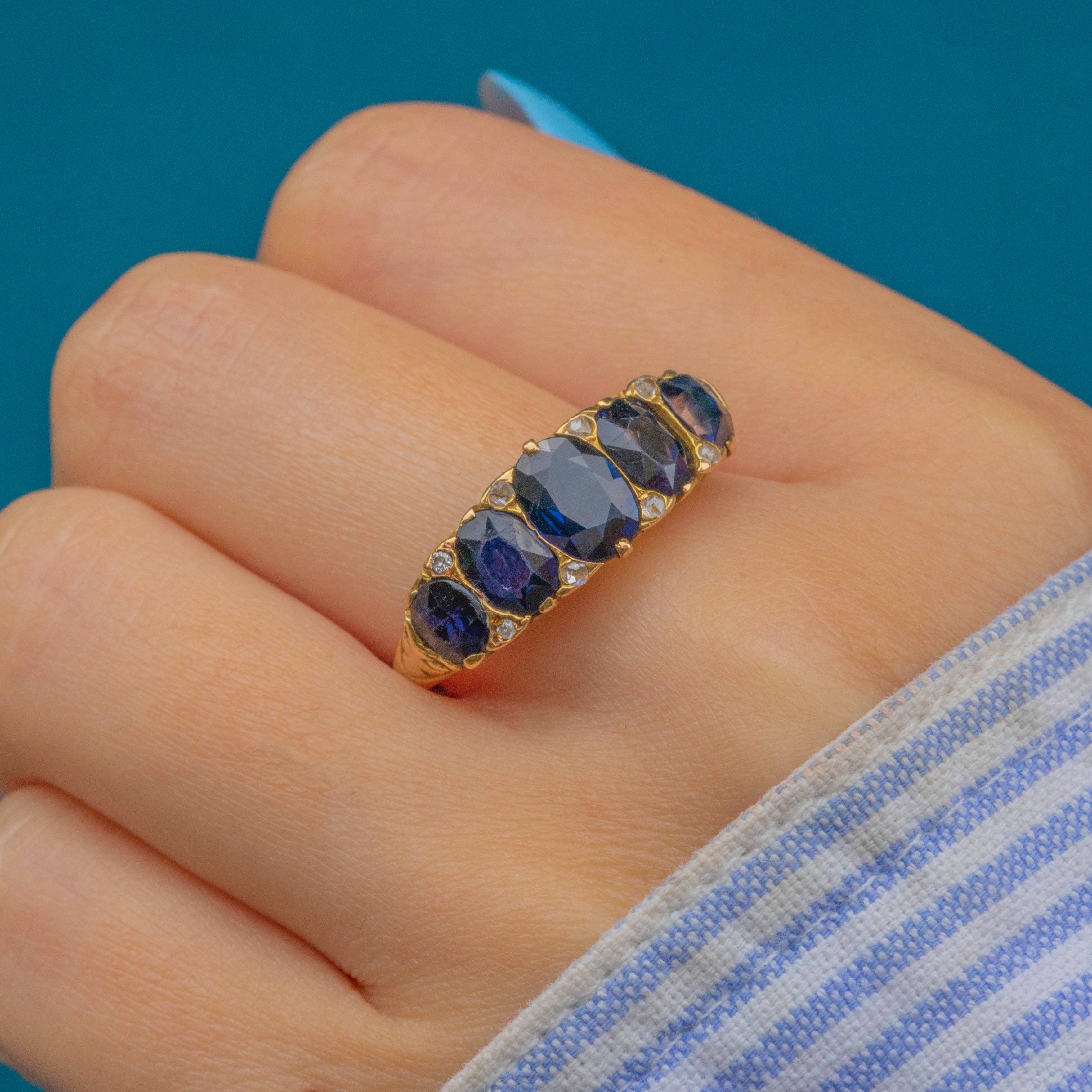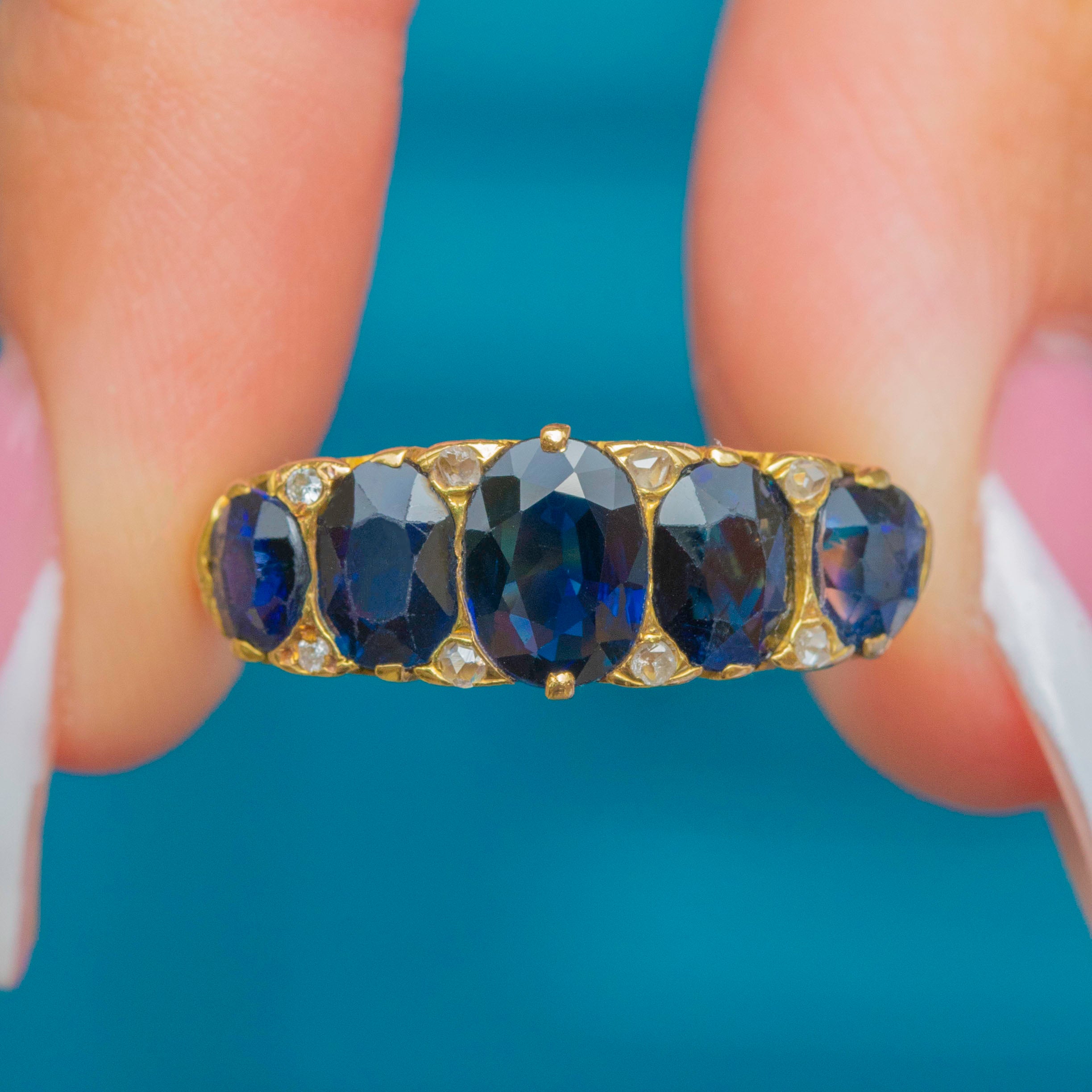 This Victorian five stone ring displays resplendent graduating natural Sapphires across its face, each radiating deep midnight blue hues from their crisp facets.