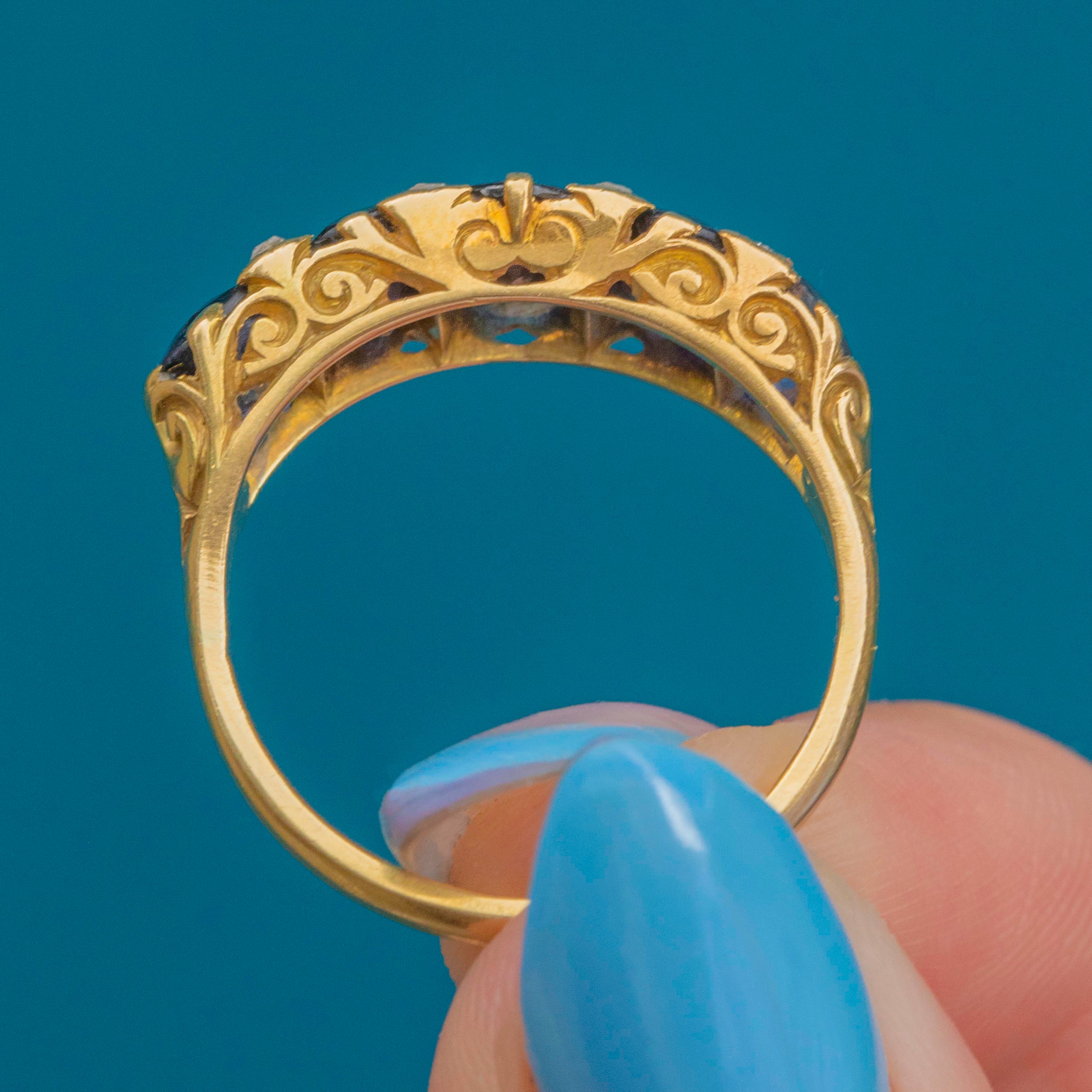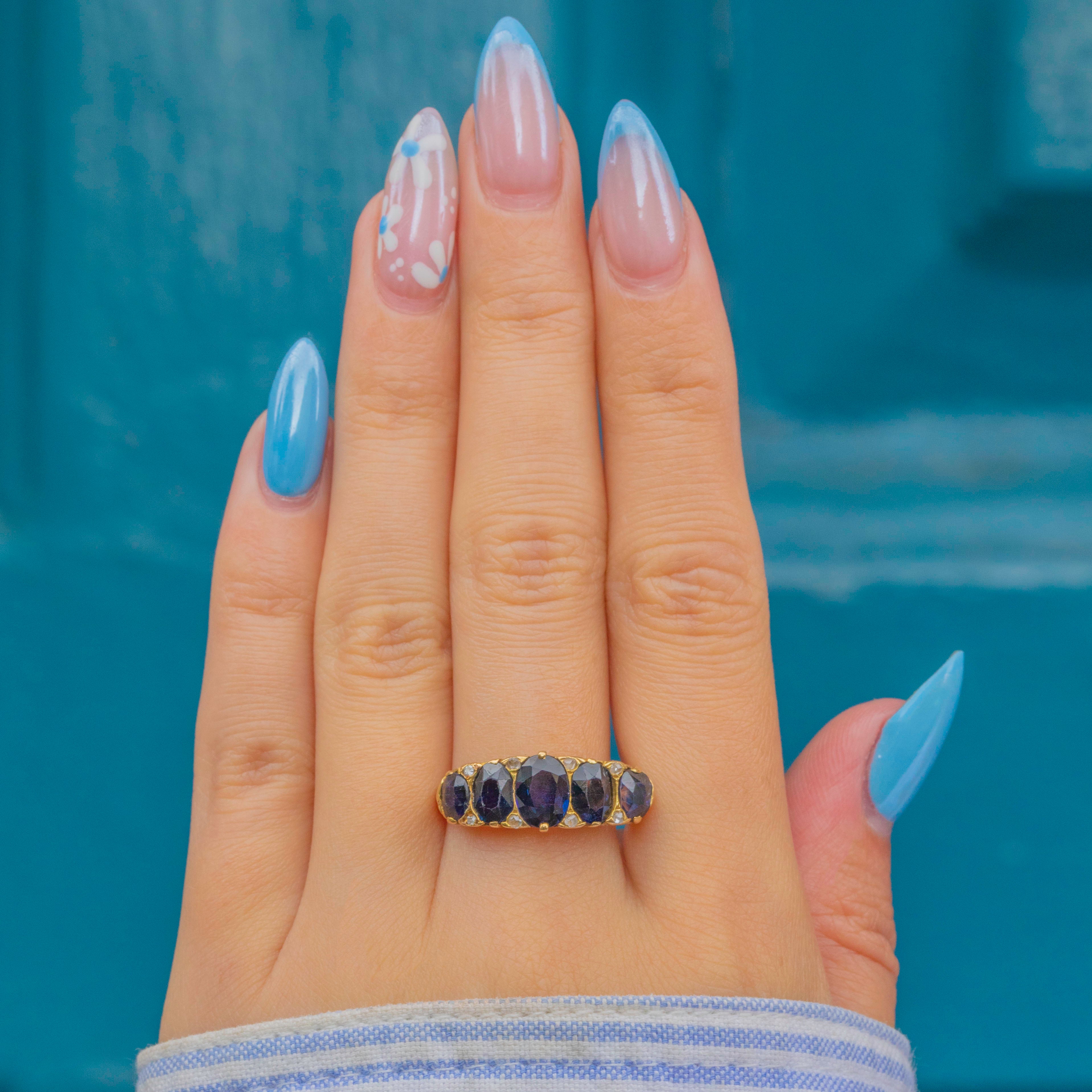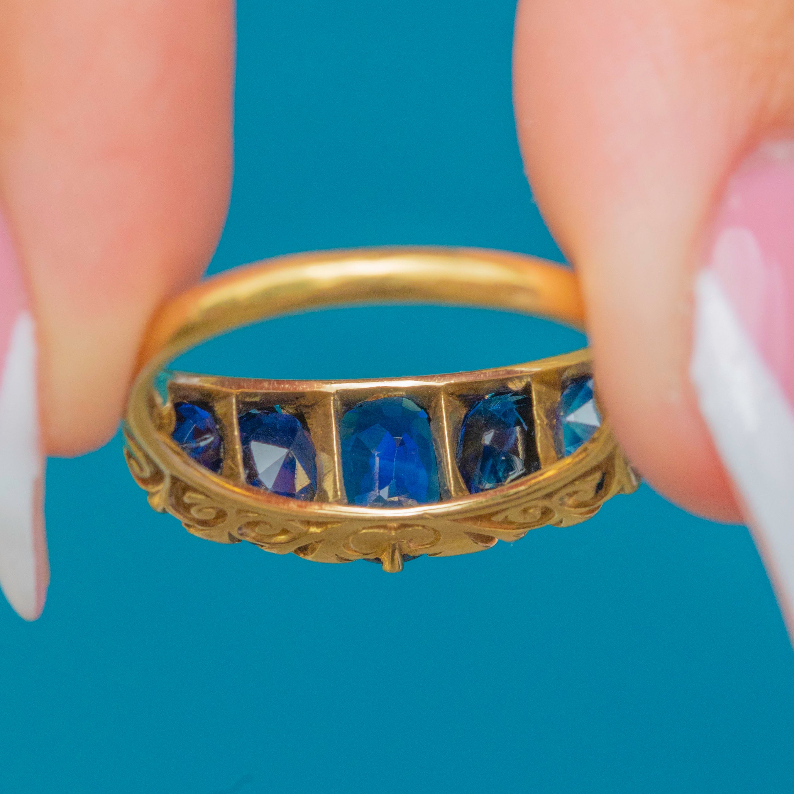 This Victorian five stone ring displays resplendent graduating natural Sapphires across its face, each radiating deep midnight blue hues from their crisp facets.