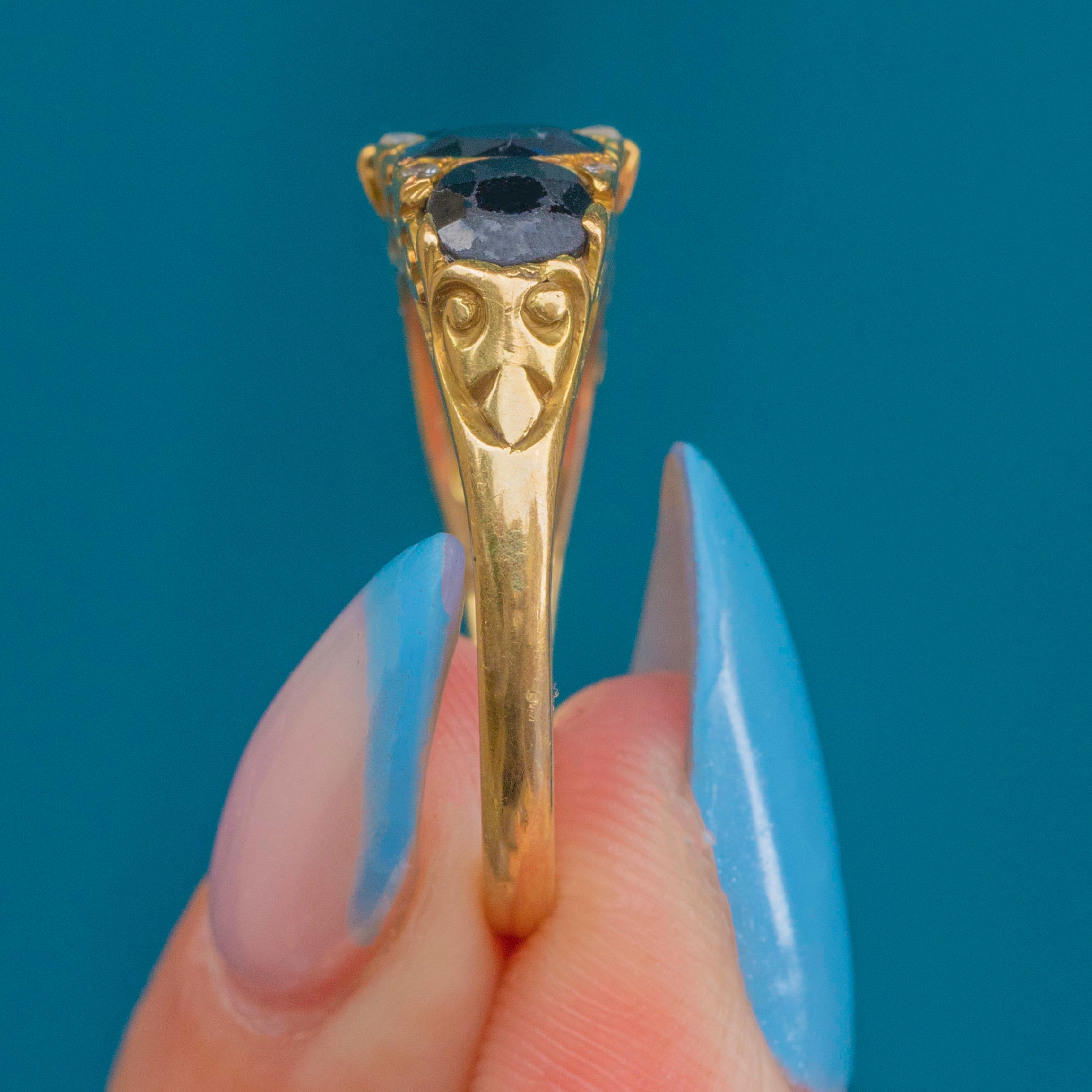 The 2.25 carats of Sapphires are adorned by scintillating rose-cut Diamond spacers, set in an ornate gallery crafted from bright and buttery 18ct Gold. Providing wonderful finger coverage, this antique Sapphire ring would make an exquisite choice for a unique engagement ring!