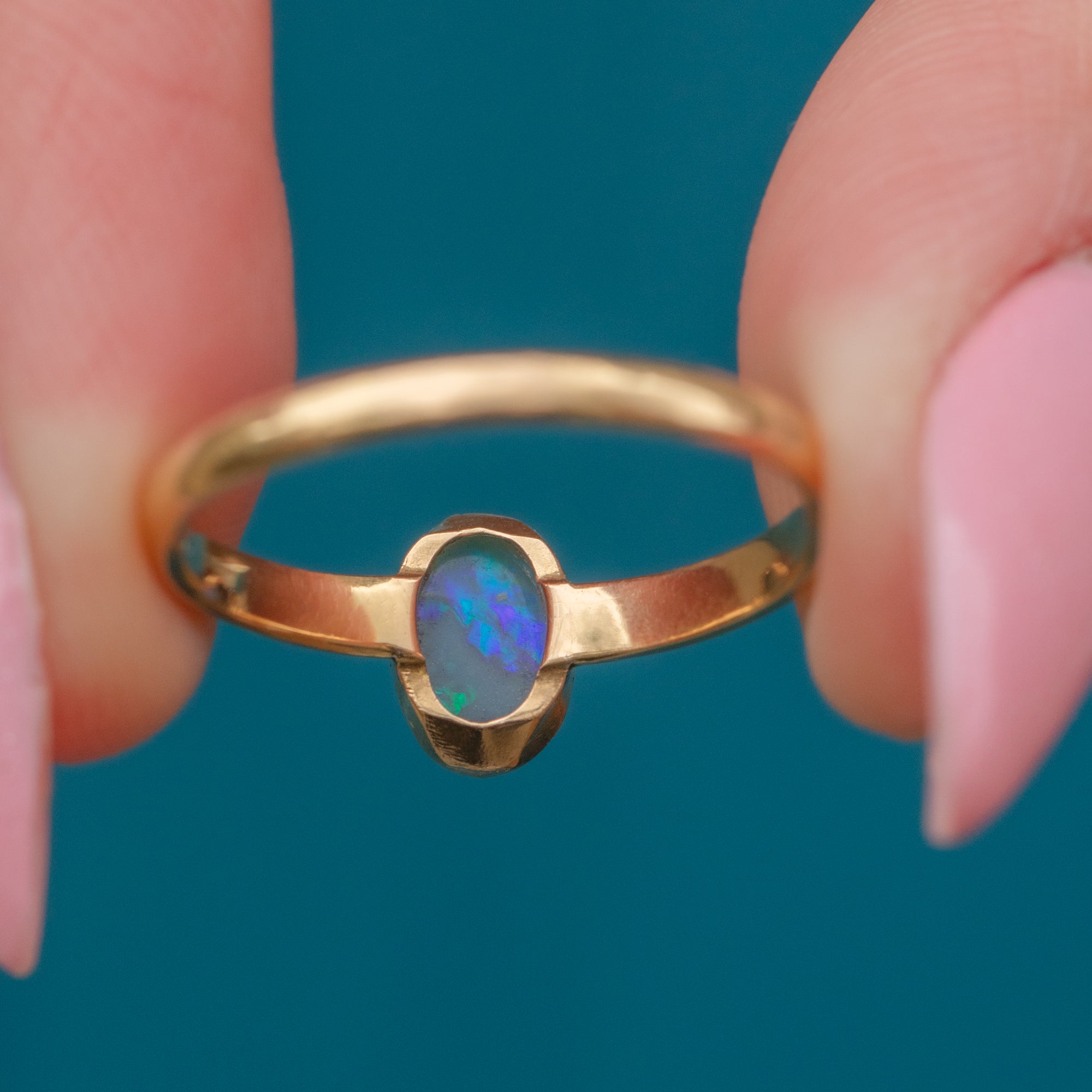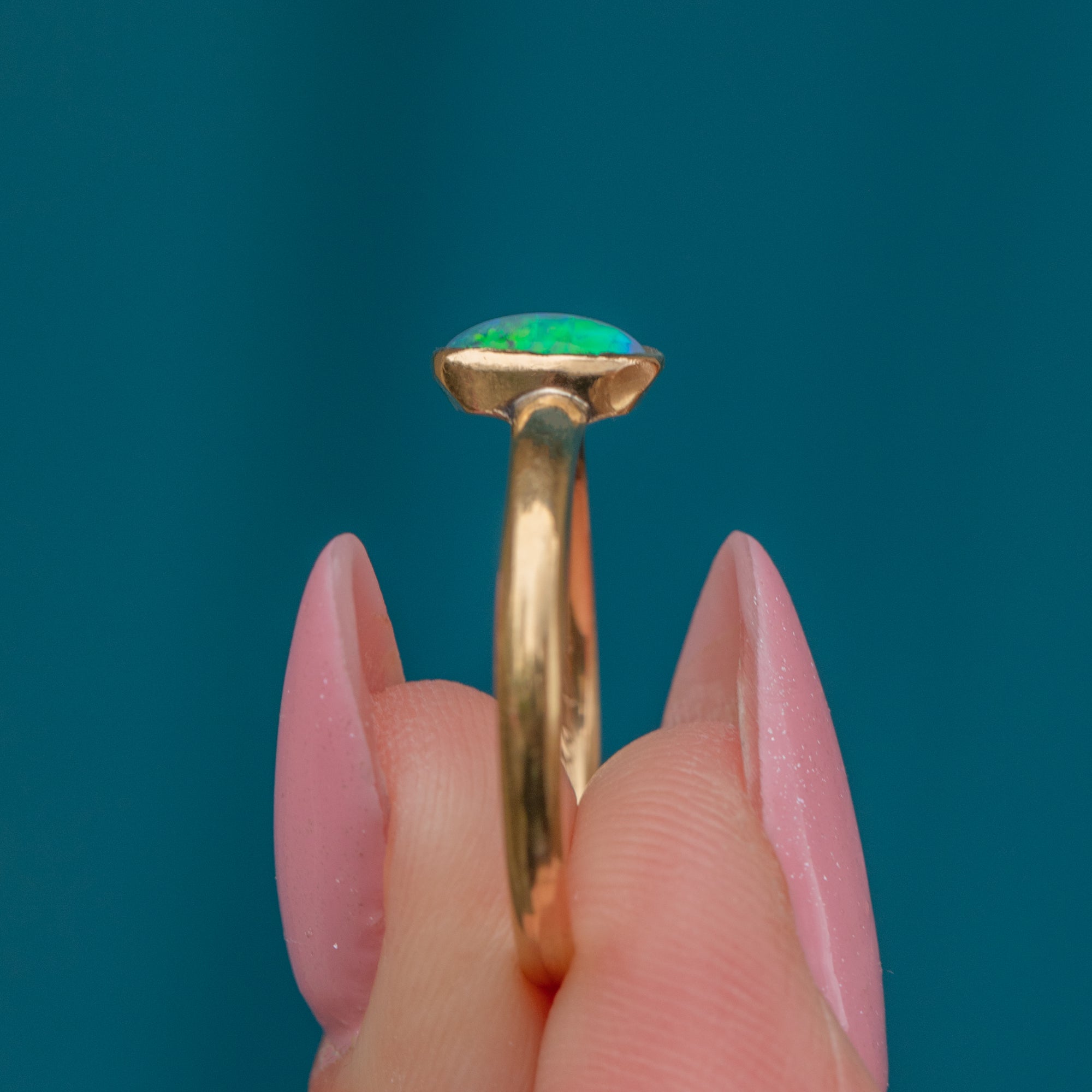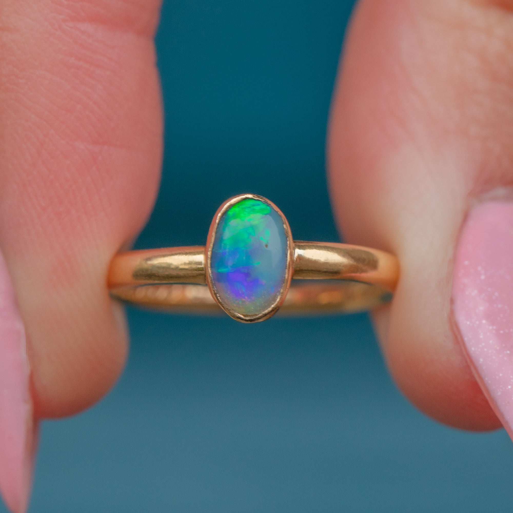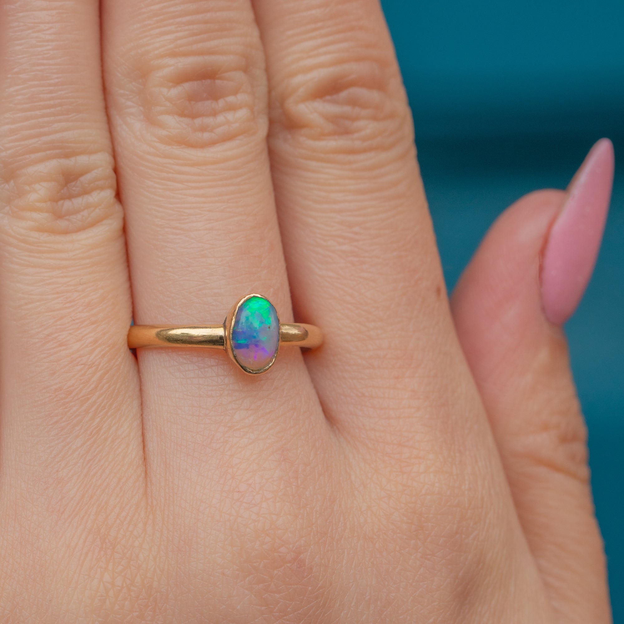 The stunning oval Opal boasts lovely lilac and royal blue hues, with flashes of neon green as she catches the light. The Opal is set within a buttery 18ct Gold bezel, adding a luxurious finish.