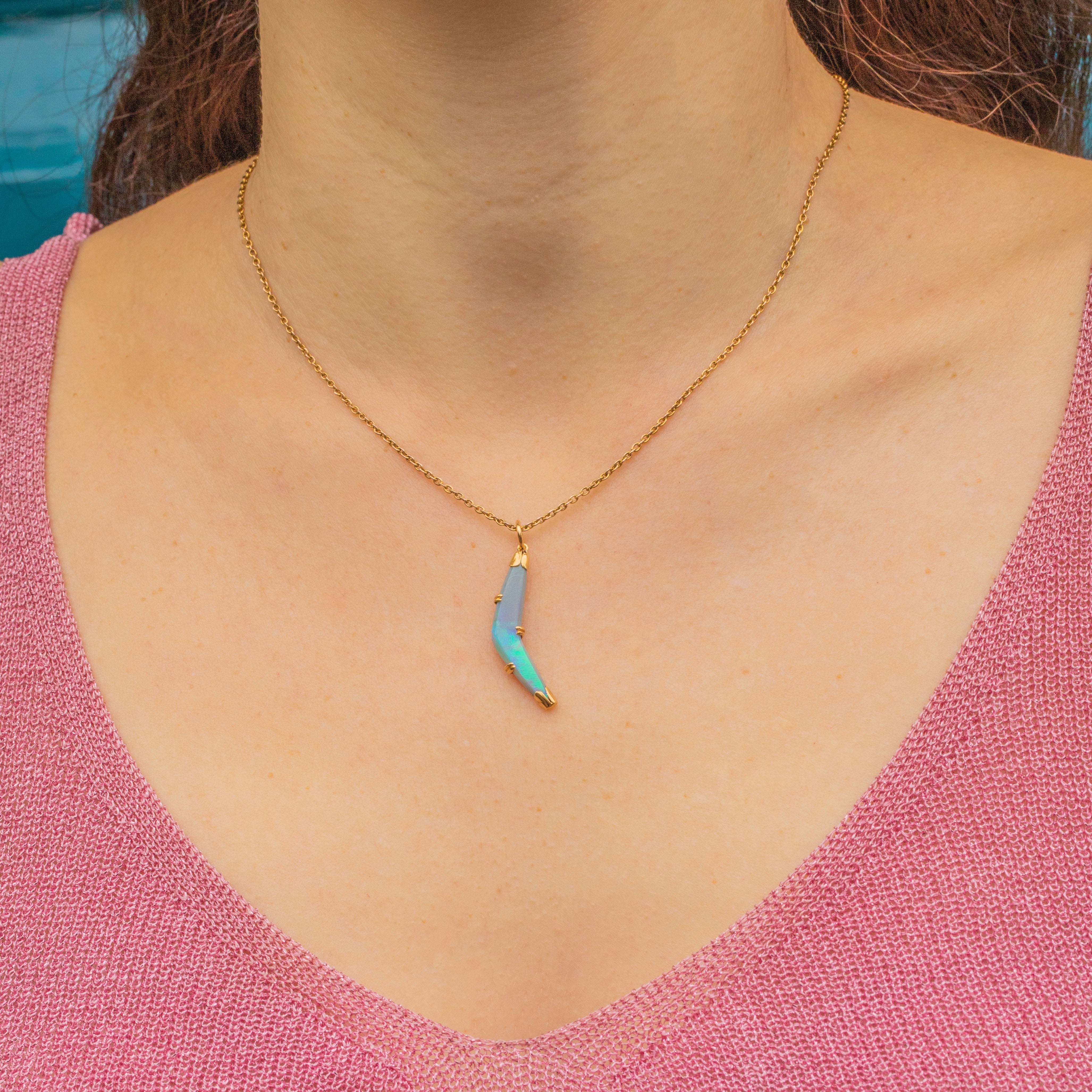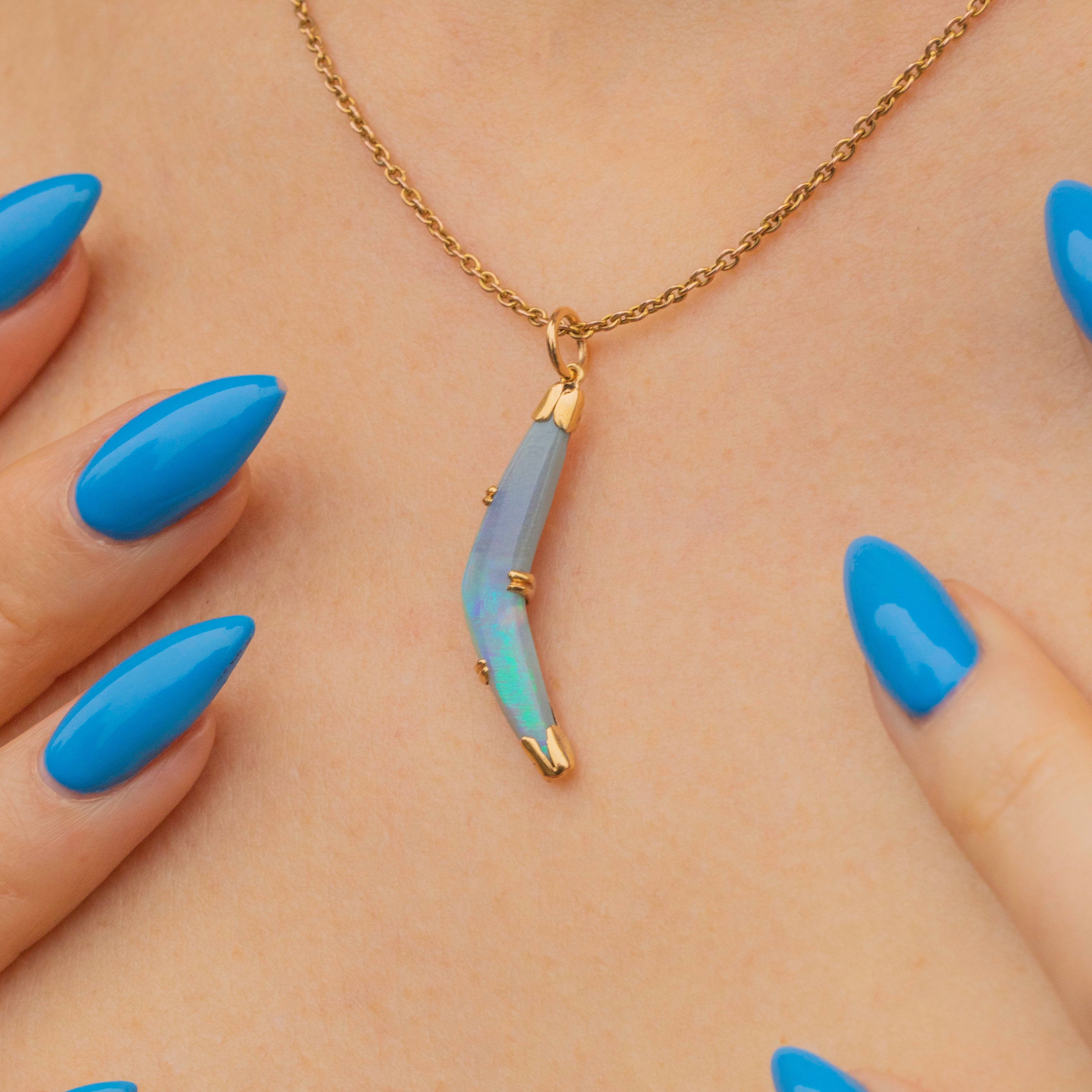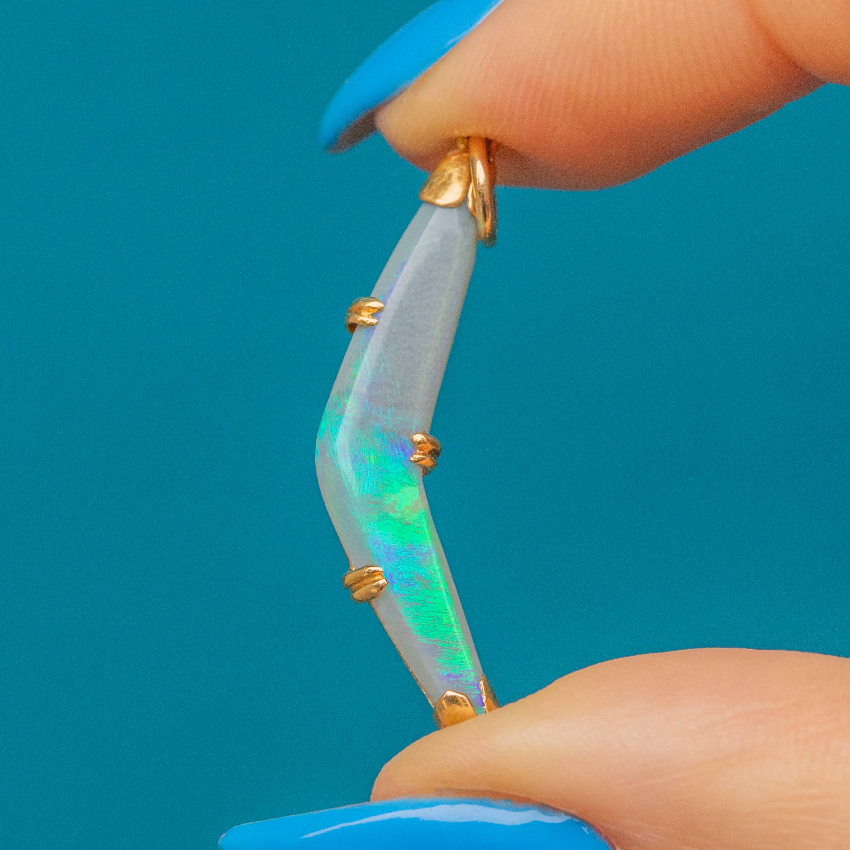 This antique 18ct Gold Opal boomerang pendant is set with an exquisite shimmering Opal, formed in the shape of a boomerang. Originating from Australia, boomerangs are a symbol of resilience and return, making her the perfect gift for someone about to embark on a new adventure, as a talisman for a safe return.