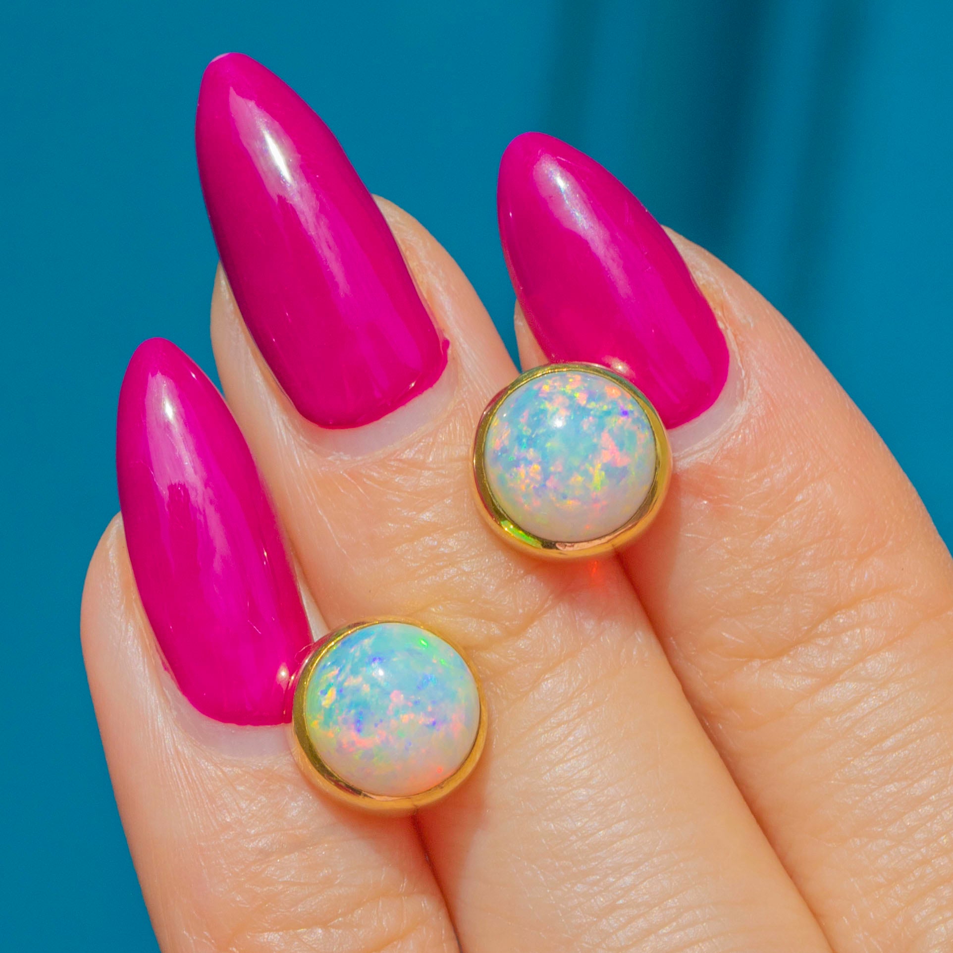 Opals are 8mm in diameter, weighing approx. 3.60ct combined.