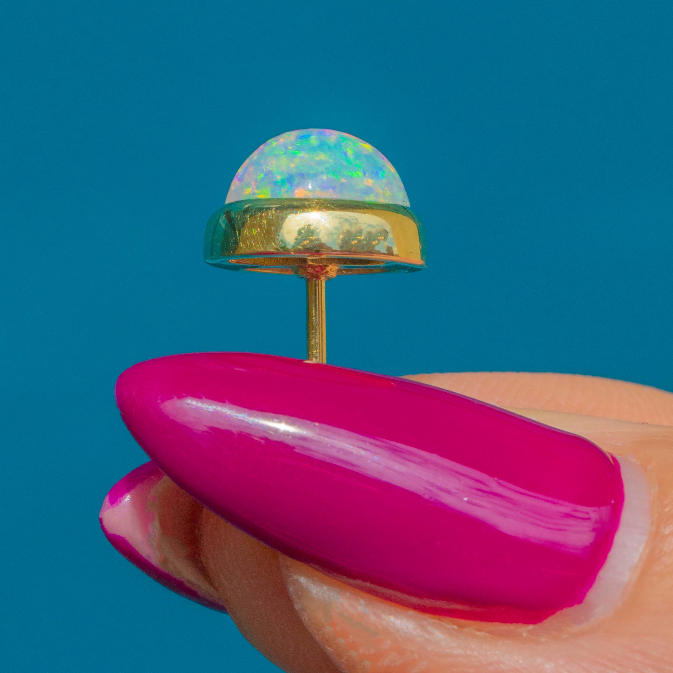 Set within a chunky 18ct Gold bezel, these Art Deco Opal earrings are dainty yet impactful. The Opals have a vibrant play of colour, revealing speckles of fuchsia and green!