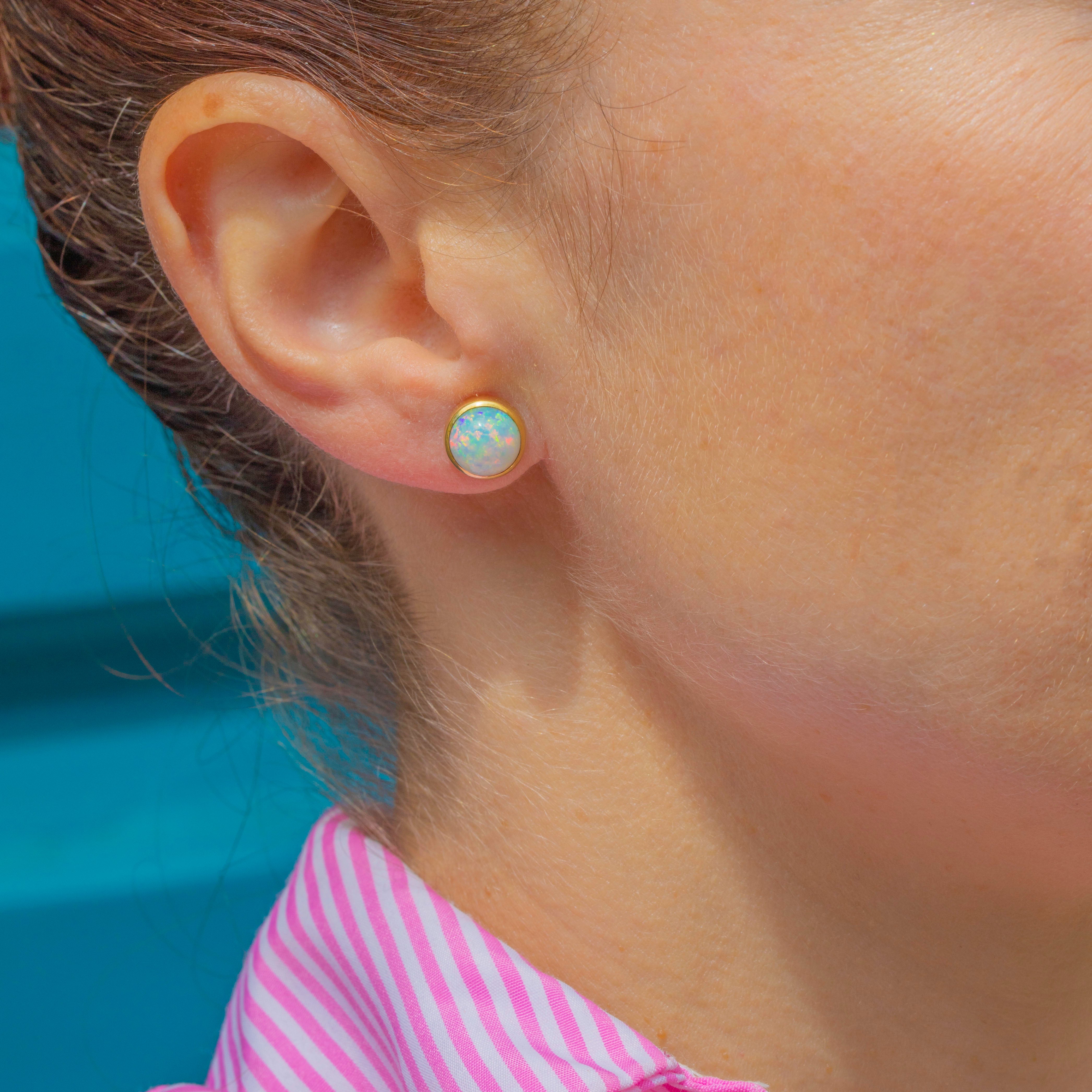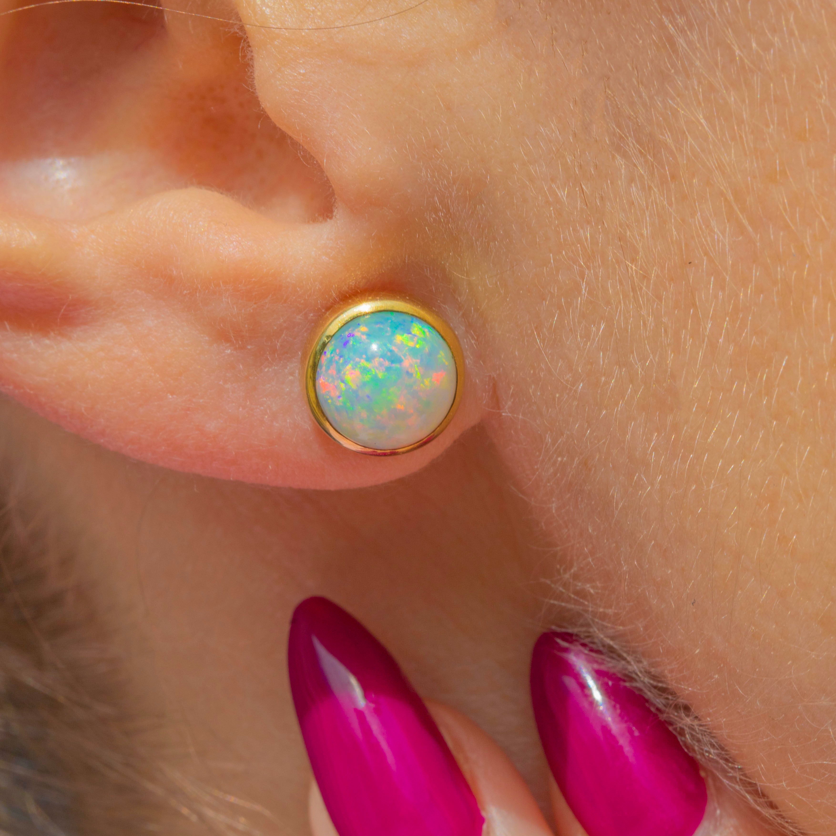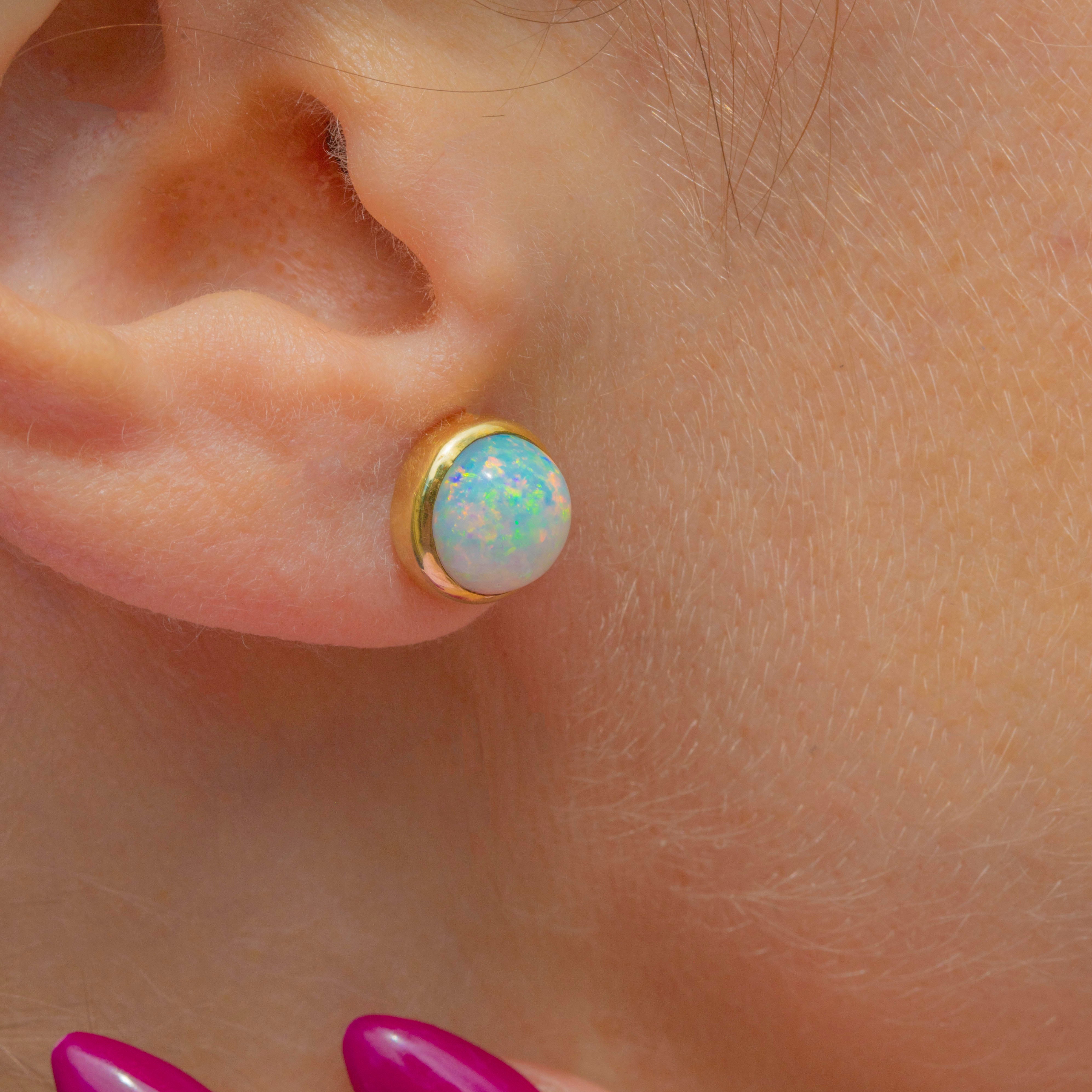 EXCELLENT: Each Opal cabochon is secure in a chunky 18ct Gold bezel, and is free from chips or scuffs. Complete with posts and butterfly backs, these antique Opal studs are super wearable and will remain secure in your lobes all day long!