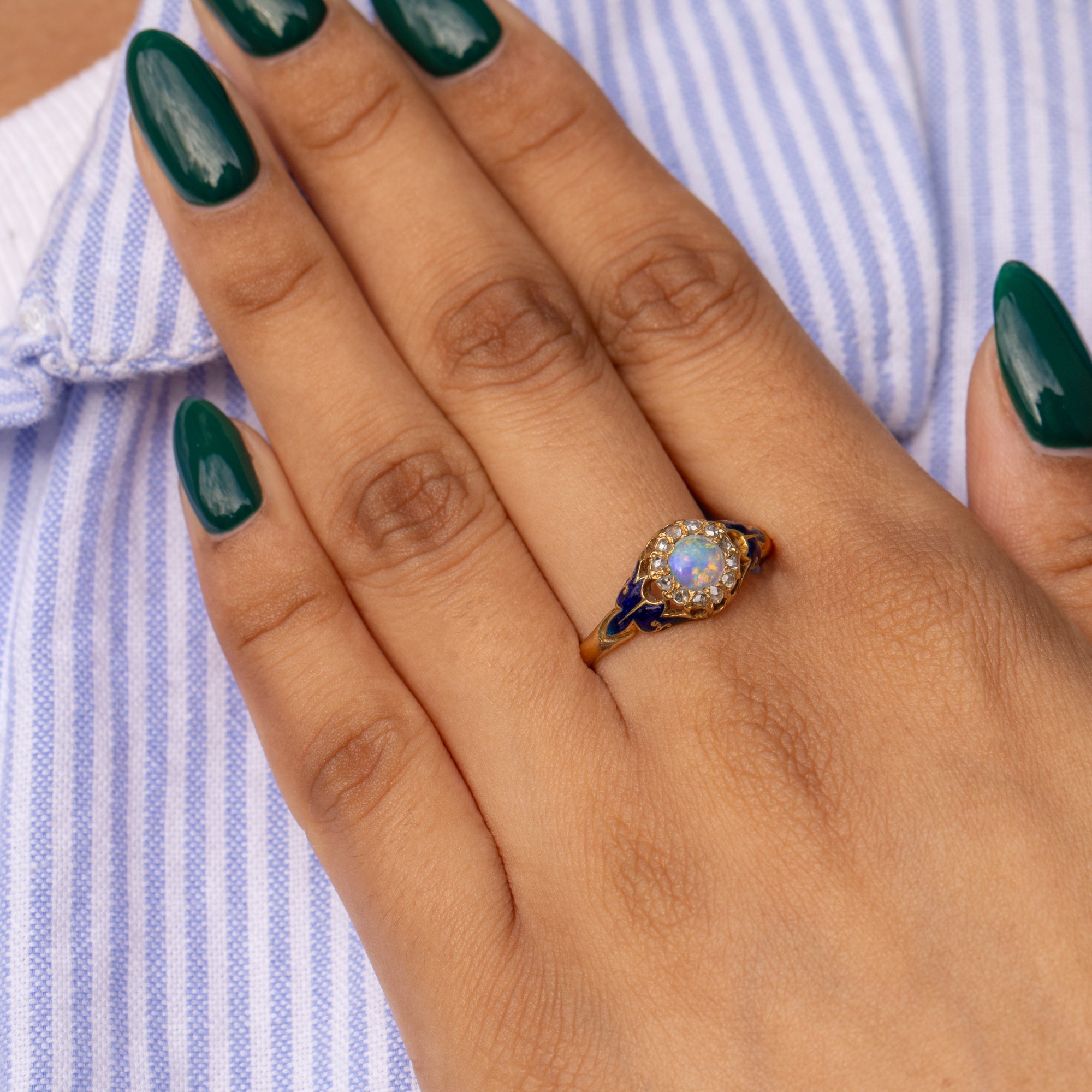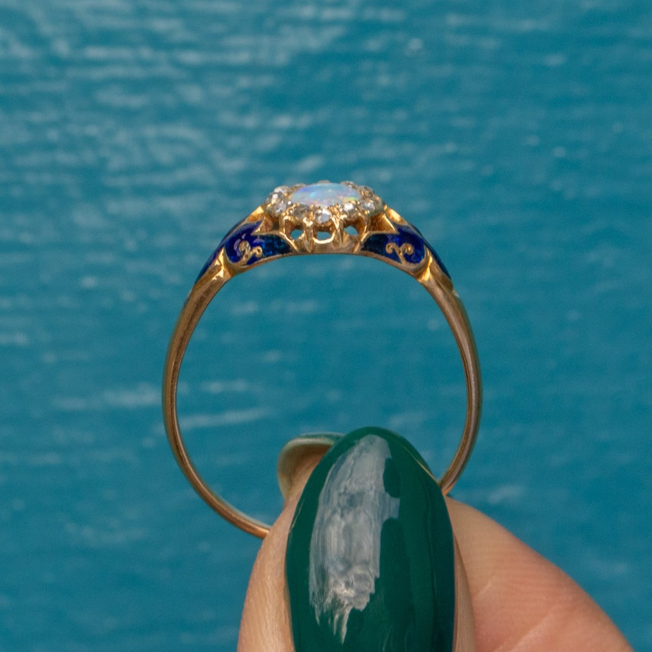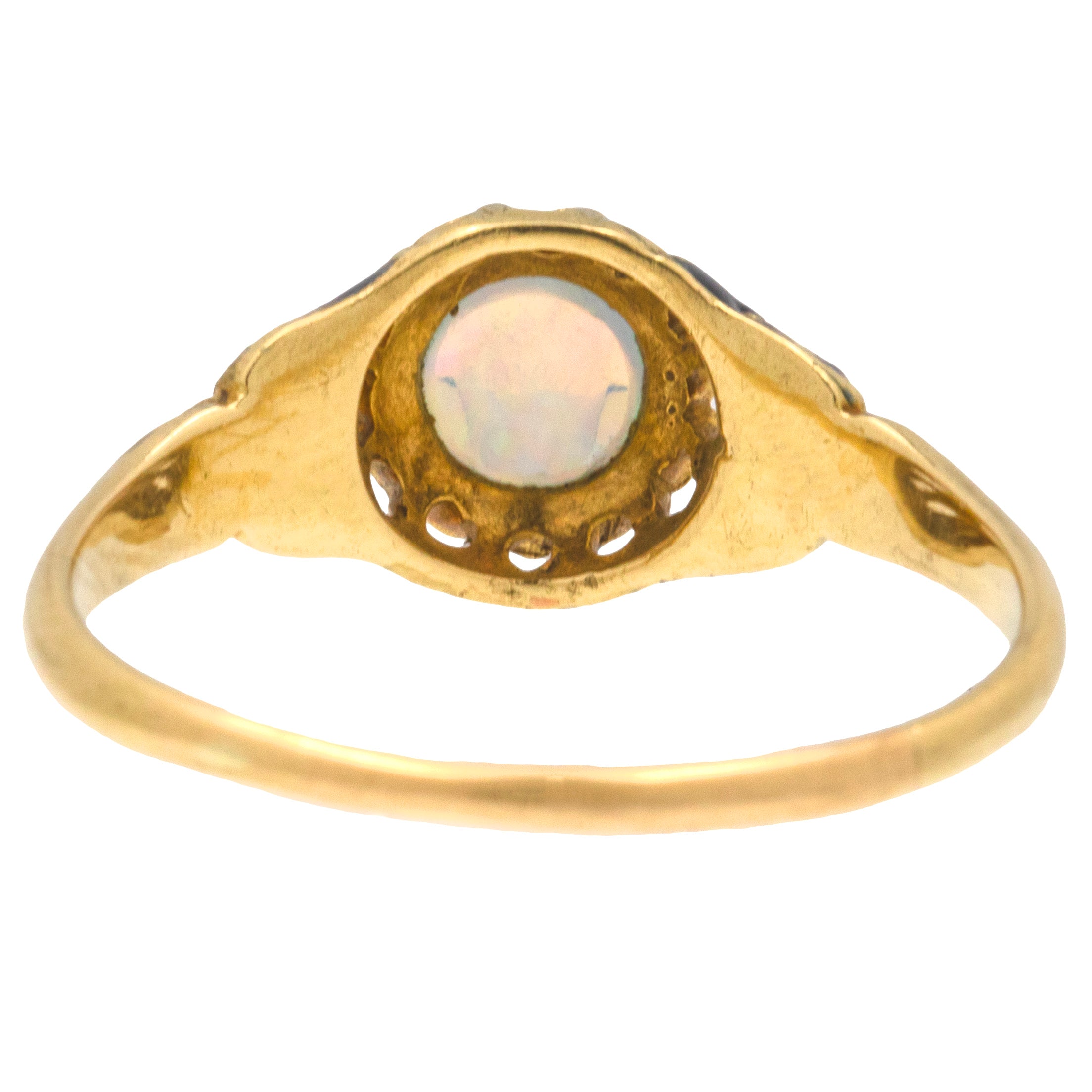 アンティーク 18ct ゴールド オパール ダイヤモンド リング、ブルーエナメル ショルダー 約1860年頃