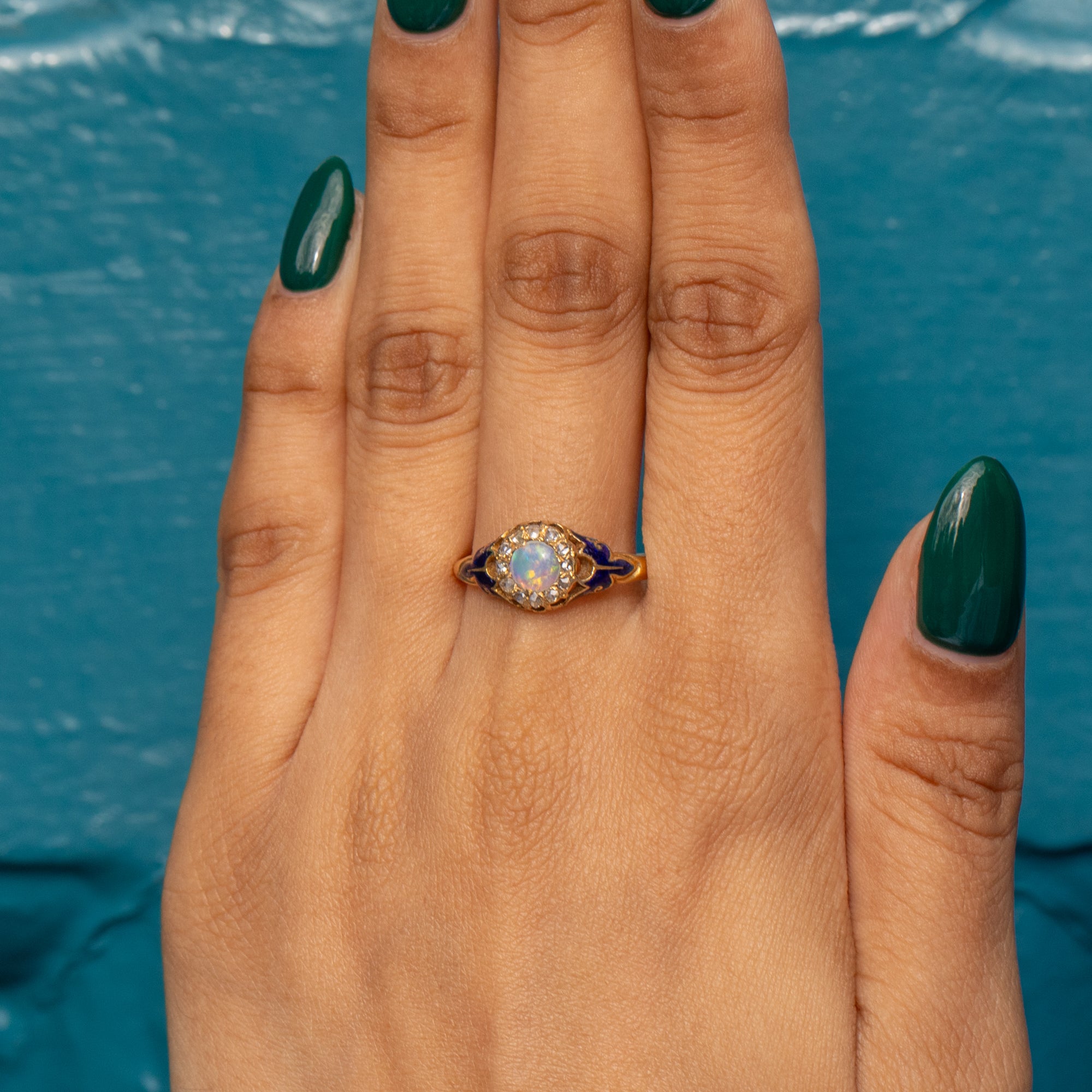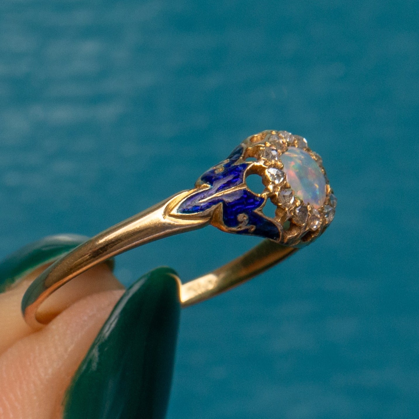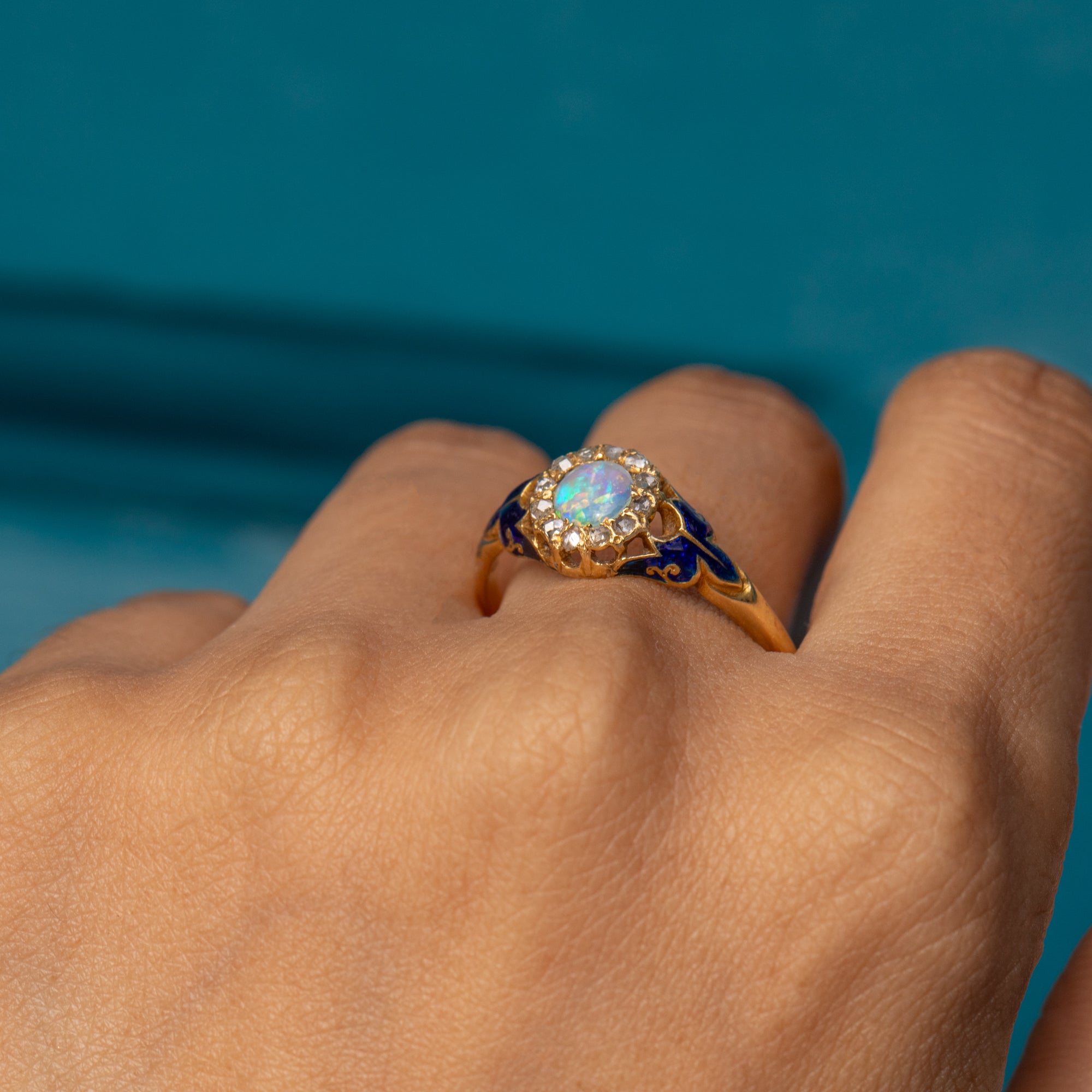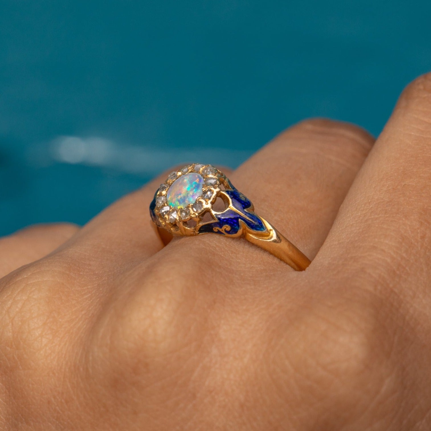 アンティーク 18ct ゴールド オパール ダイヤモンド リング、ブルーエナメル ショルダー 約1860年頃