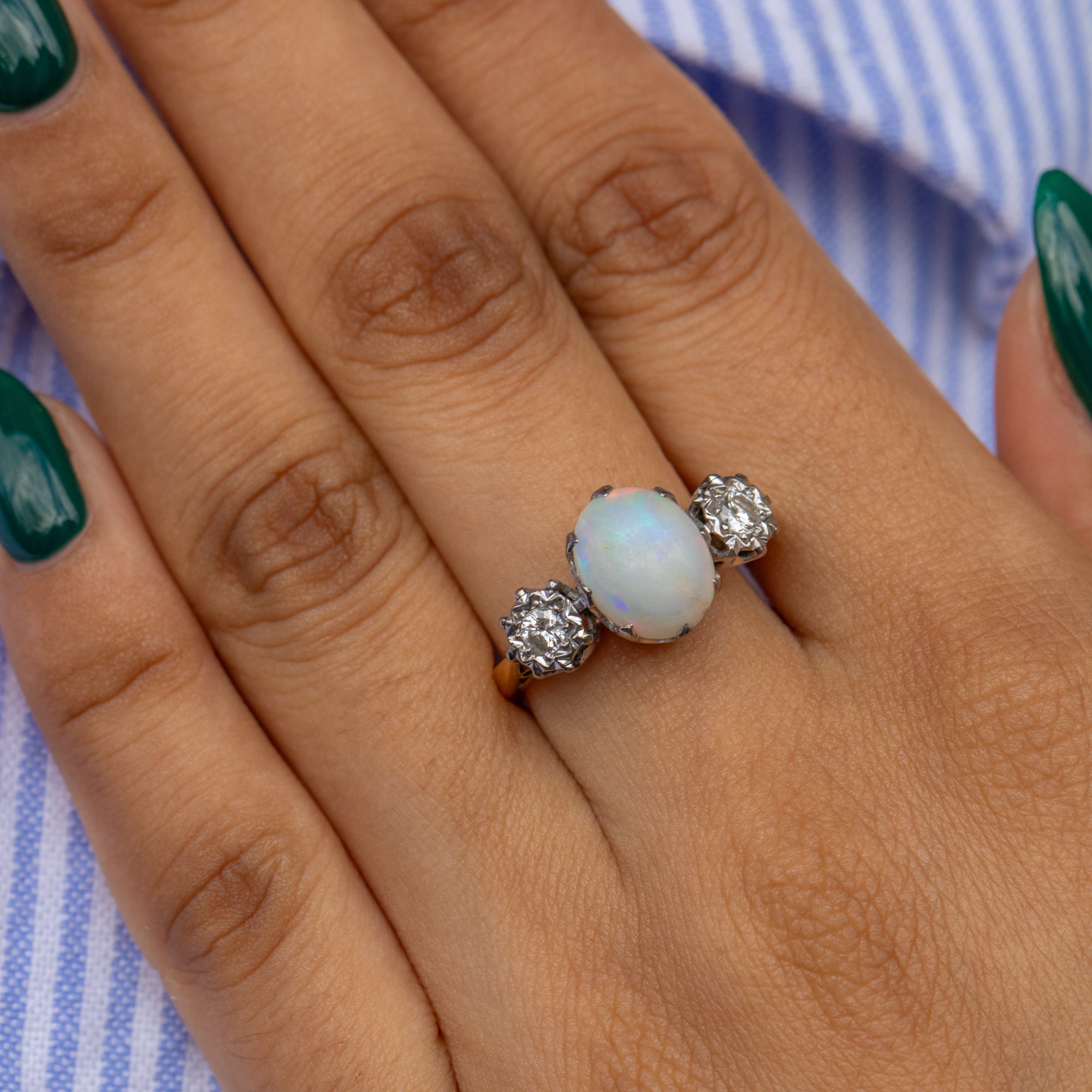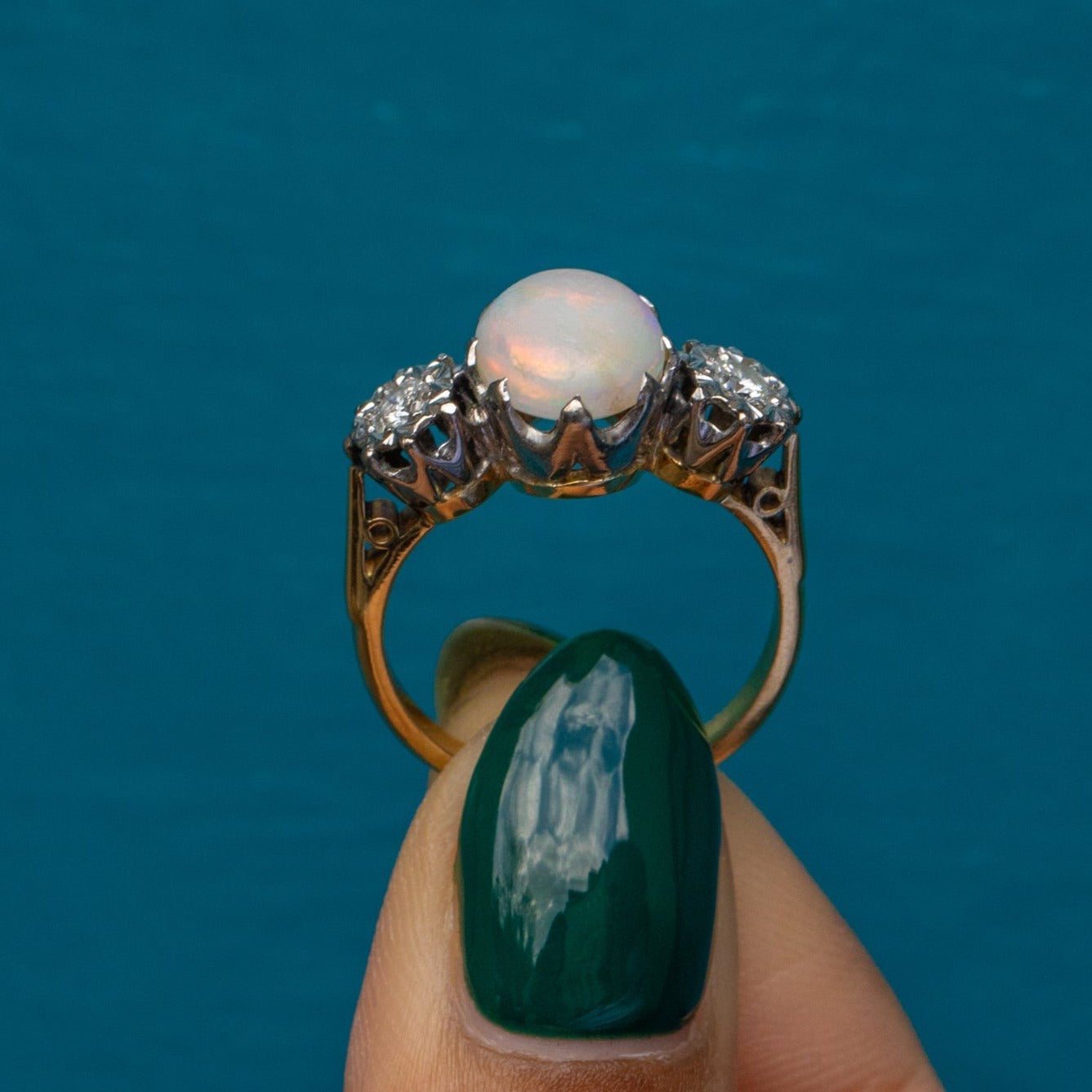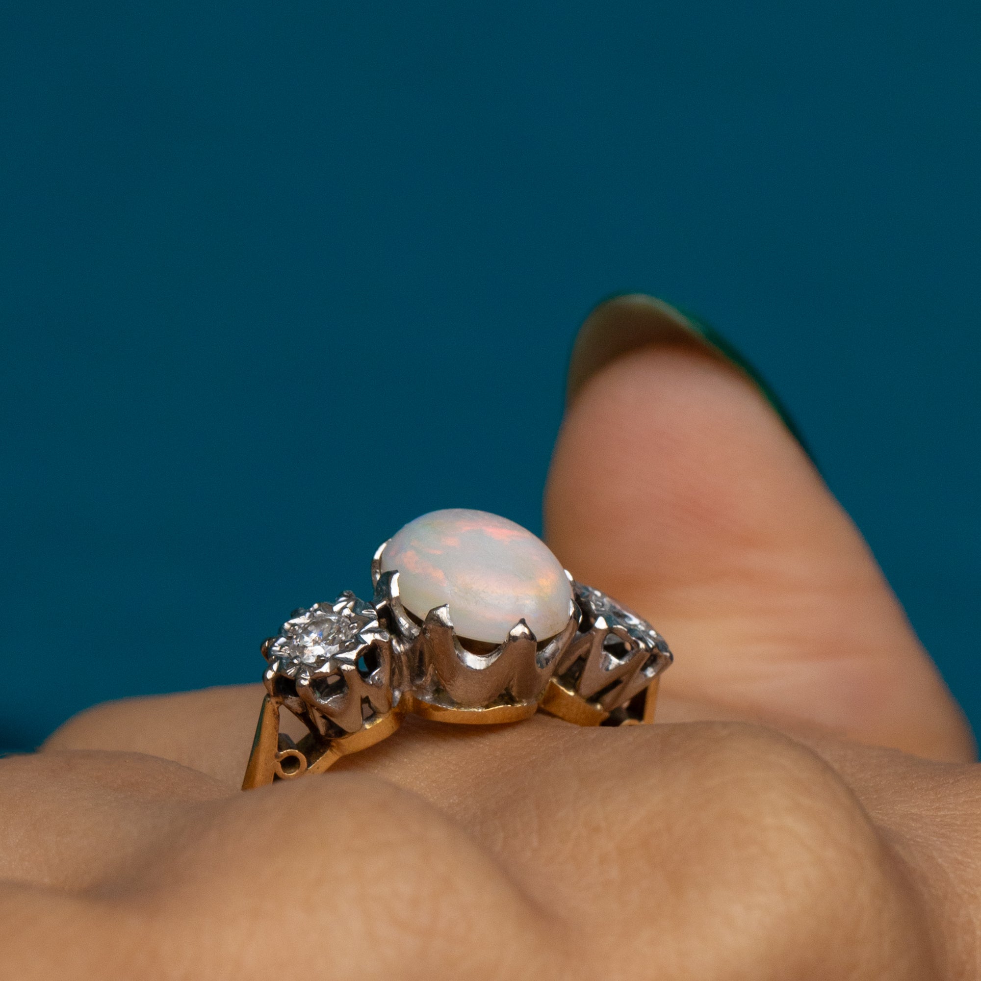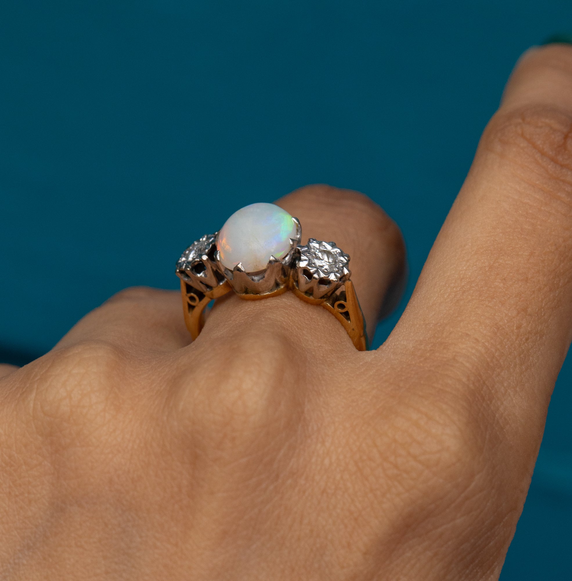 アンティーク 18ct ゴールド オパール ダイヤモンド トリロジーリング、1.80ct オパール