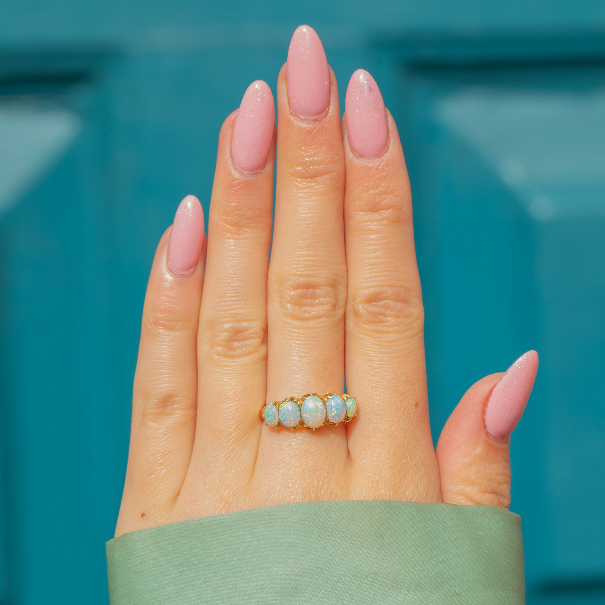 Her 18ct Gold band is buttery and possesses an alluring glow, with settings that provide a perfect throne for the iridescent natural solid Opals. Showcasing a spellbinding confetti display of vibrant greens, soft blues and pinks, each Opal is whimsical and thrives beneath the light, enchanting anyone who lays eyes on this spectacular Victorian ring!