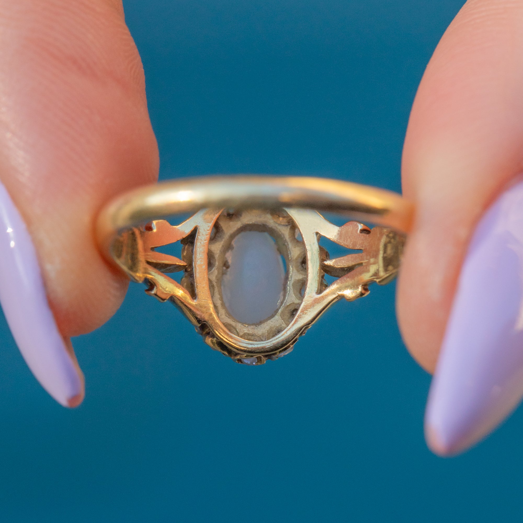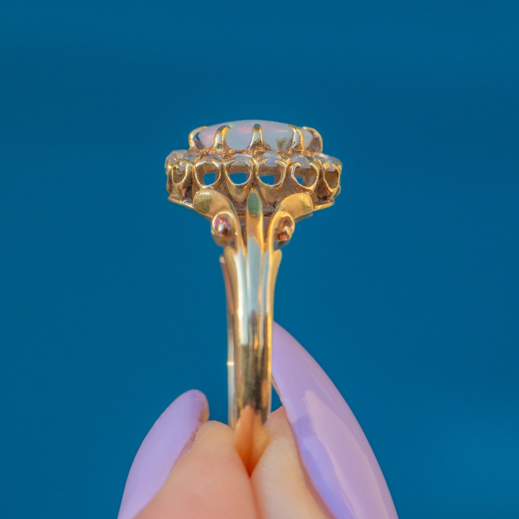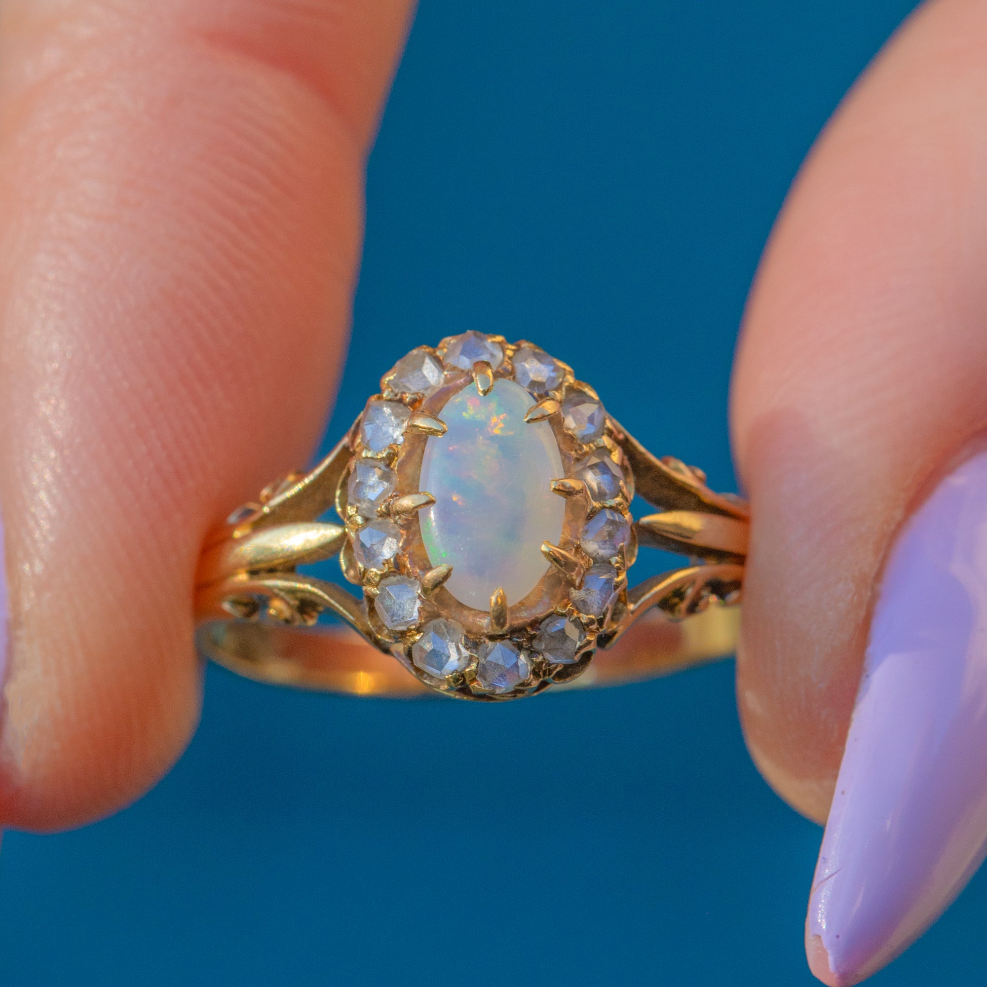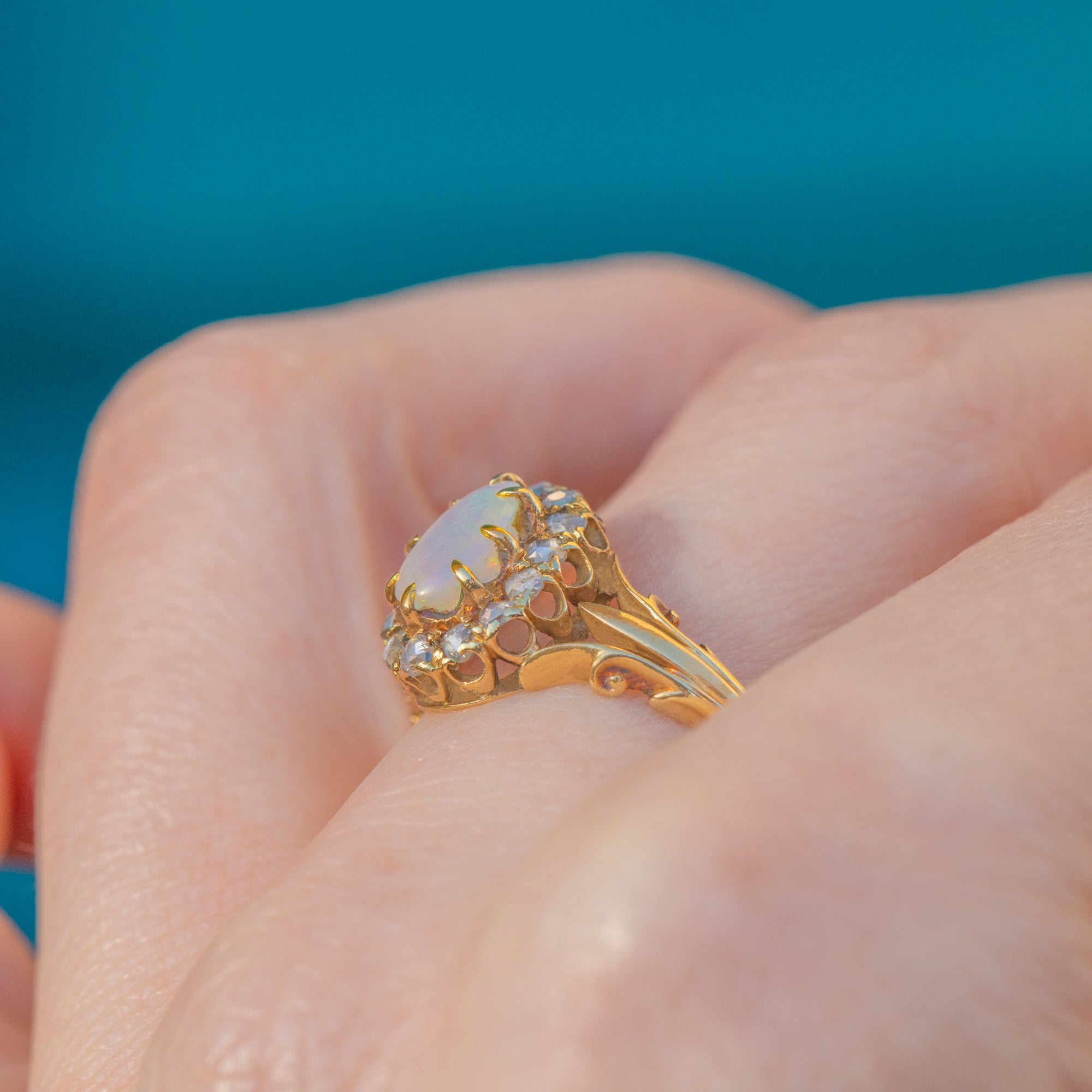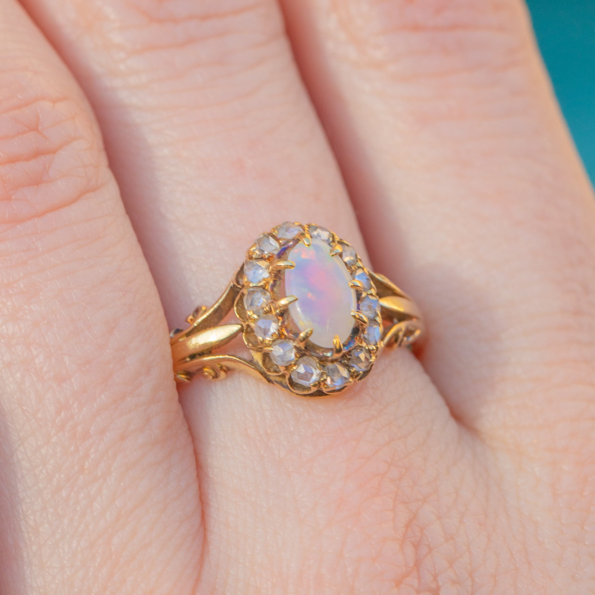 This antique 18ct Gold Opal rose-cut Diamond cluster ring perfectly captures the exquisite craftsmanship of the Victorian era! The sumptuous 18ct Gold band showcases ornate details, with a deep rococo design running up the shoulders holding the gemstone cluster proudly from the finger.