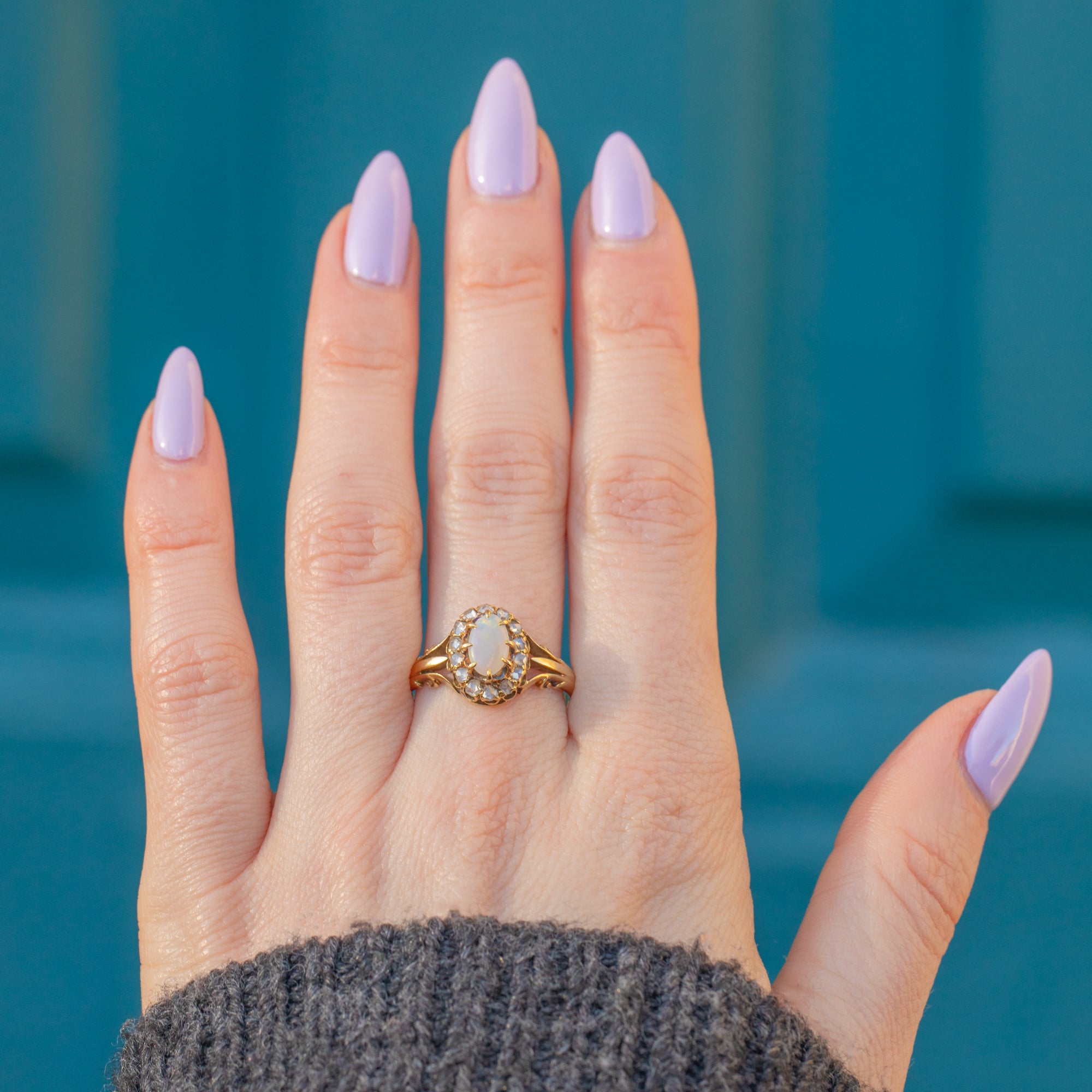 A pretty natural solid Opal cabochon takes centre stage, shimmering a light pink hue speckled with neon orange and blue, displayed within stylistic tapered claws. The Opal is haloed by scintillating Diamonds, creating a spectacular display as their rose-cut facets catch the light. With a real old-time charm, this Victorian Opal Diamond ring will make an enchanting addition to your collection!