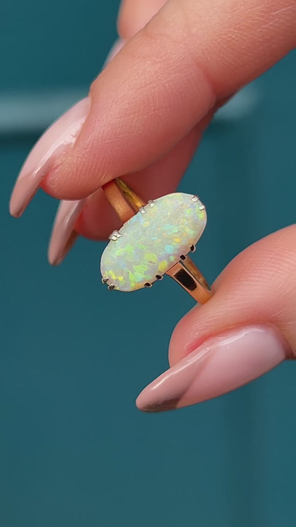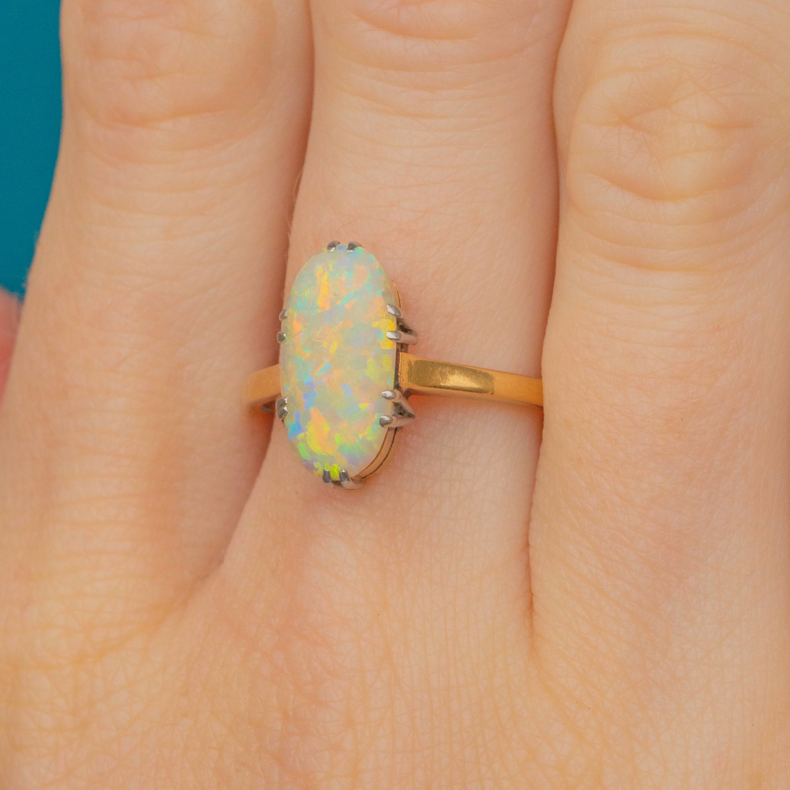 You will instantly become transfixed by this enchanting antique 18ct Gold Opal solitaire ring! The large oval 0.96ct Opal displays wonderful pops of blue and green across its milky core, coming to life beneath the light, held within Platinum claws for a refined finish.