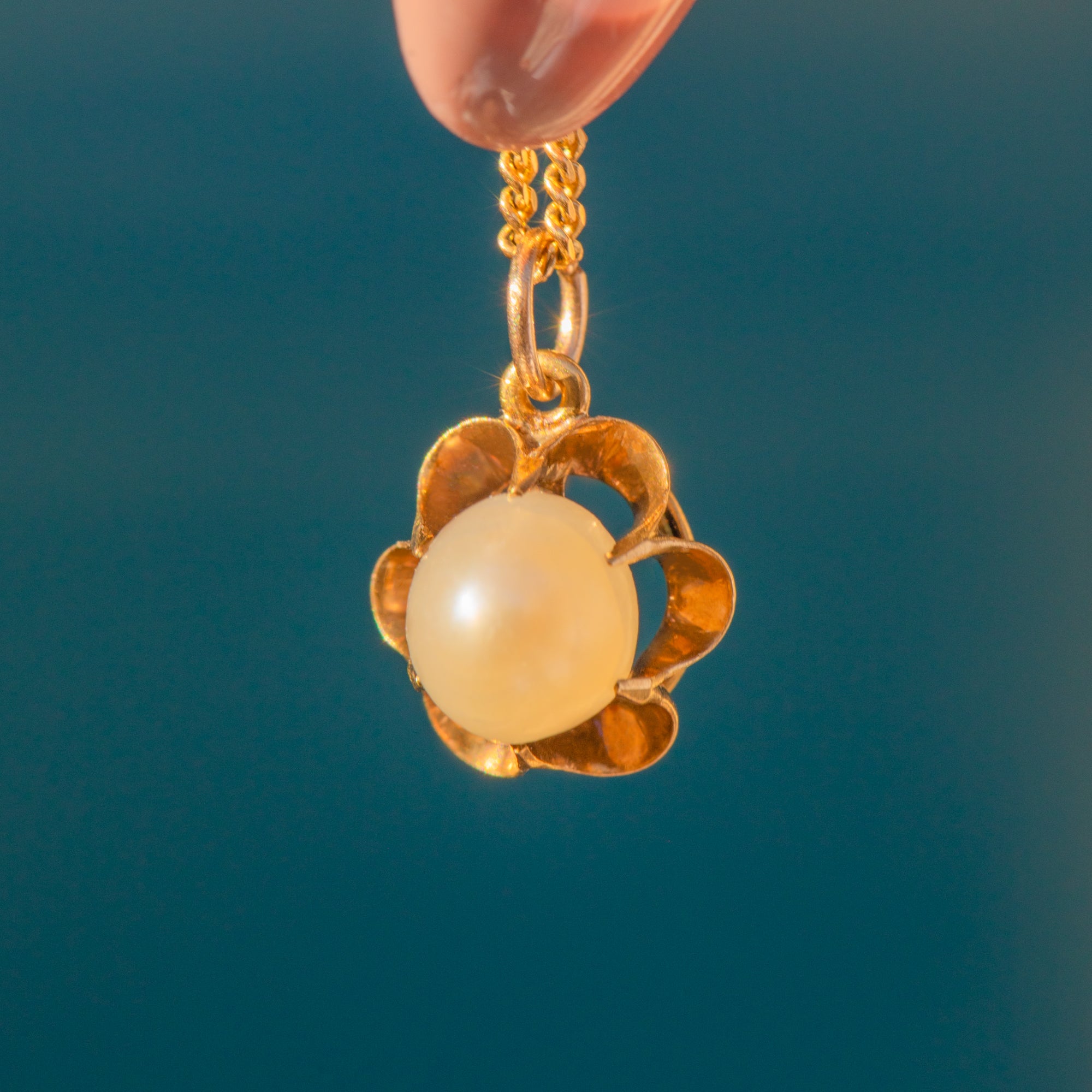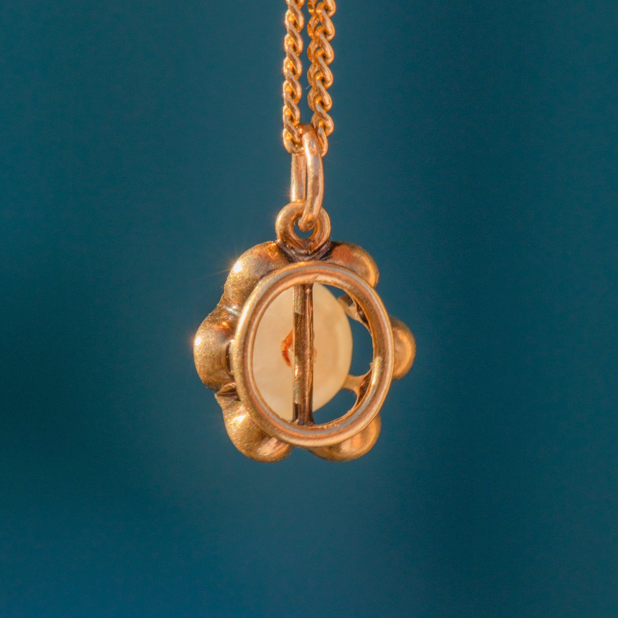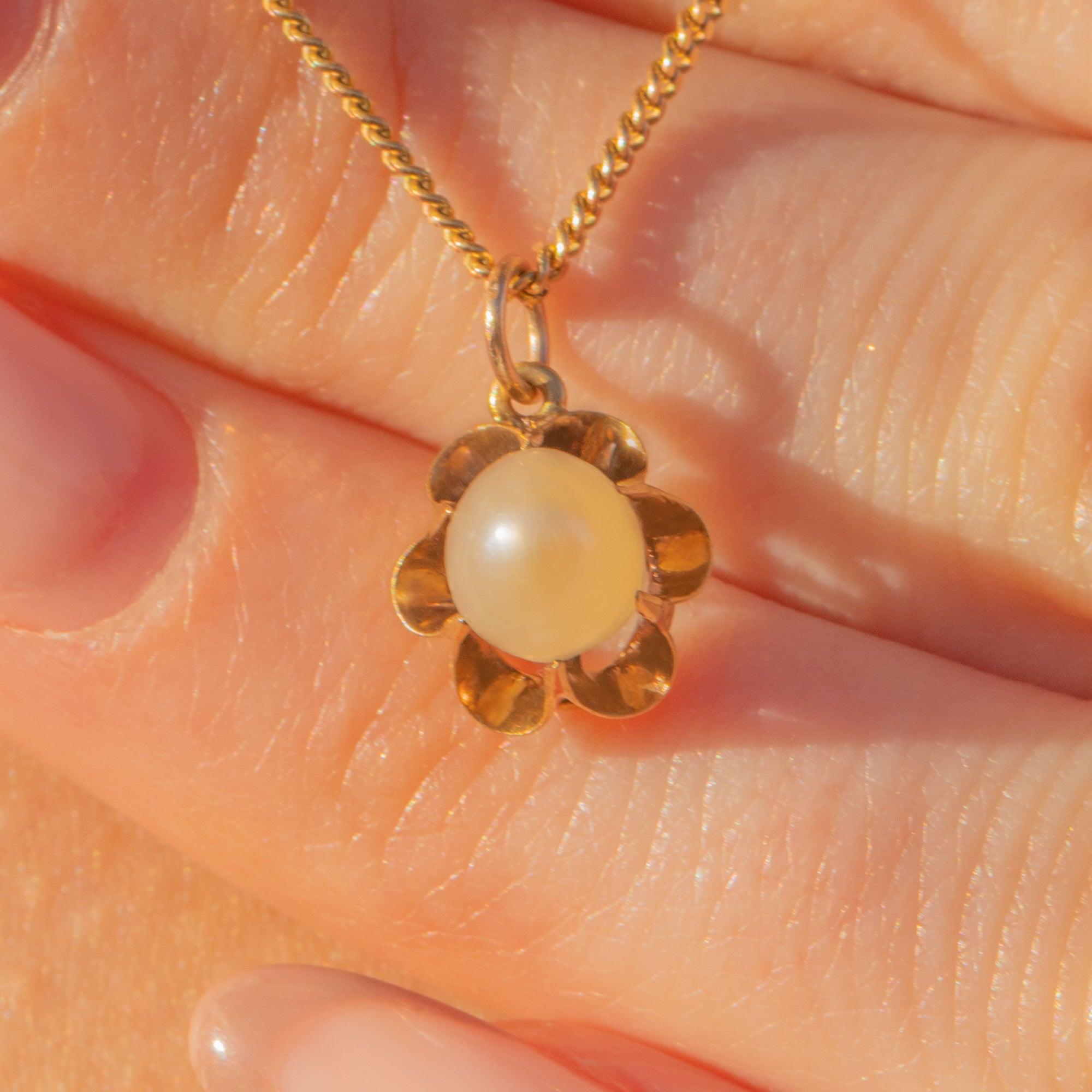 VERY GOOD.This antique 18ct Gold Pearl buttercup set charm is in very good condition. Her lustrous Pearl sits securely within her claw settings, allowing for confident wear. There are some minor signs of wear to the Gold commensurate with age, however this does not detract from her beauty.