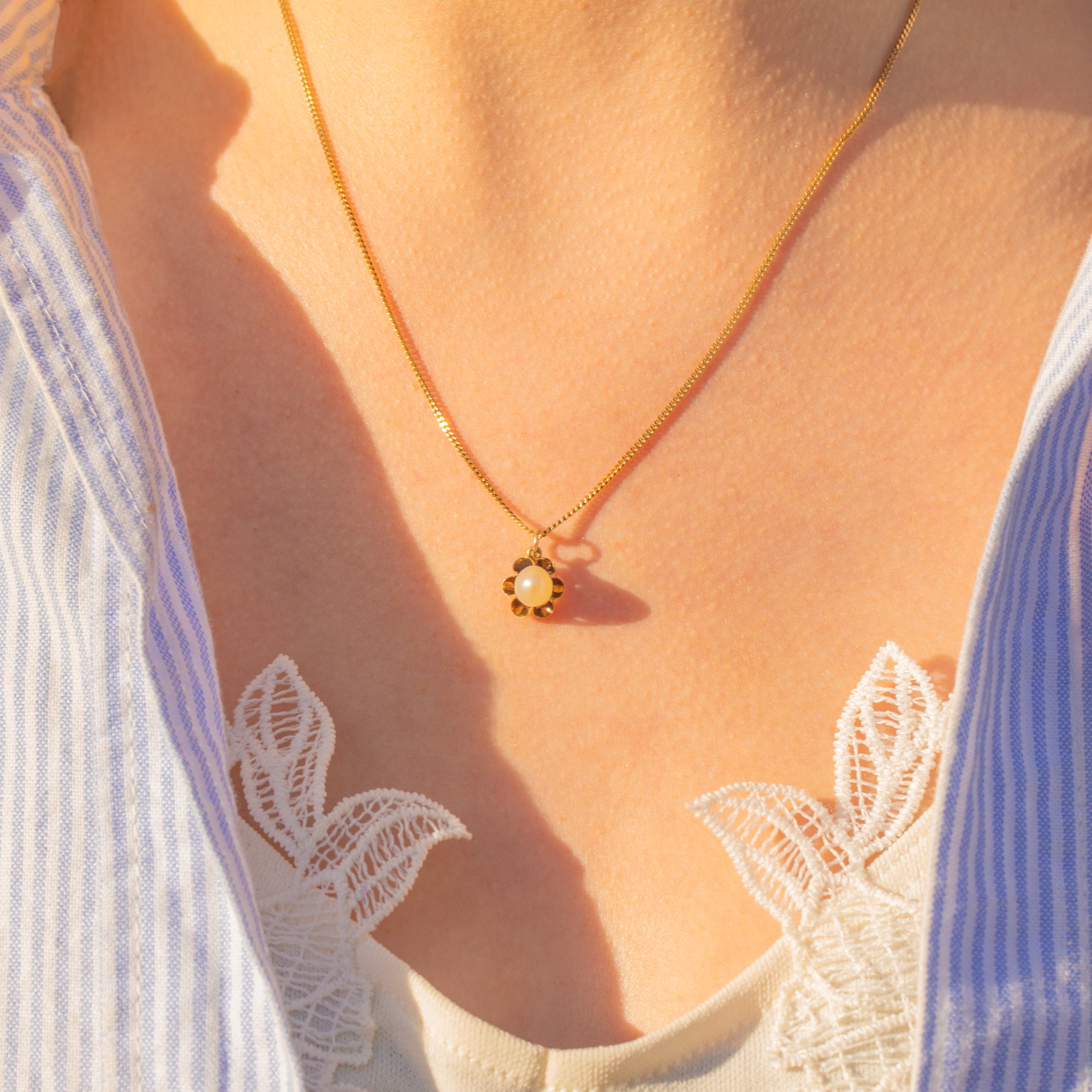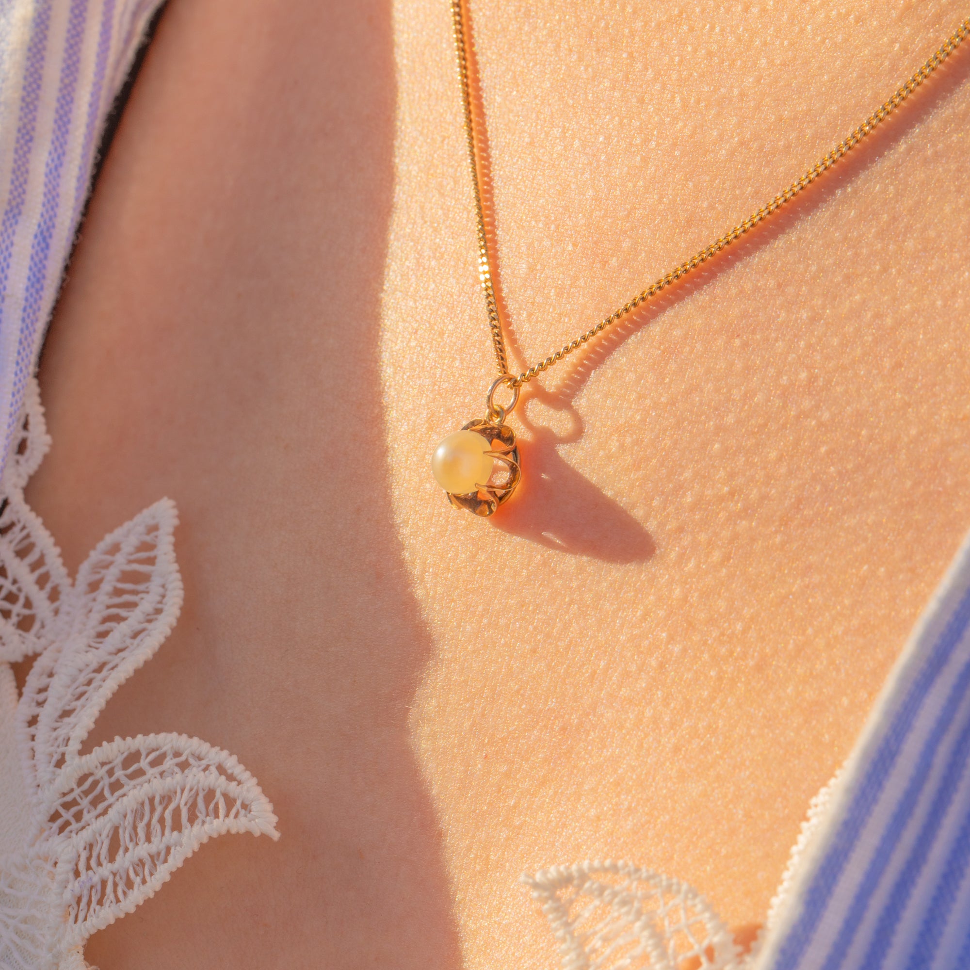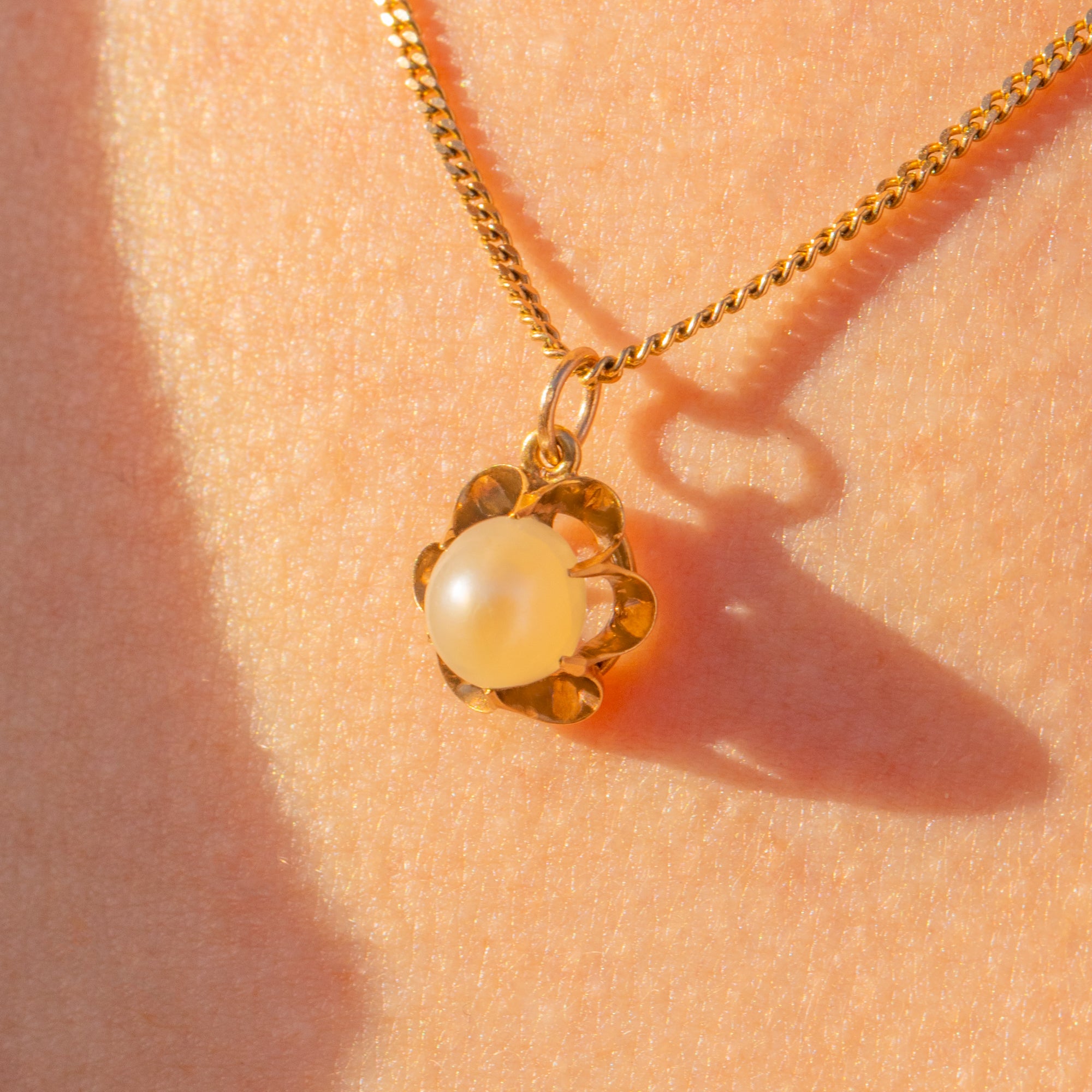 Crafted from sumptuous 18ct Gold, this antique charm holds a plump iridescent Pearl in her centre. An exemplar of Victorian craftsmanship, her buttery claw settings form to create an adorable buttercup design that adorns the Pearl, adding some playful character to this delicate charm.