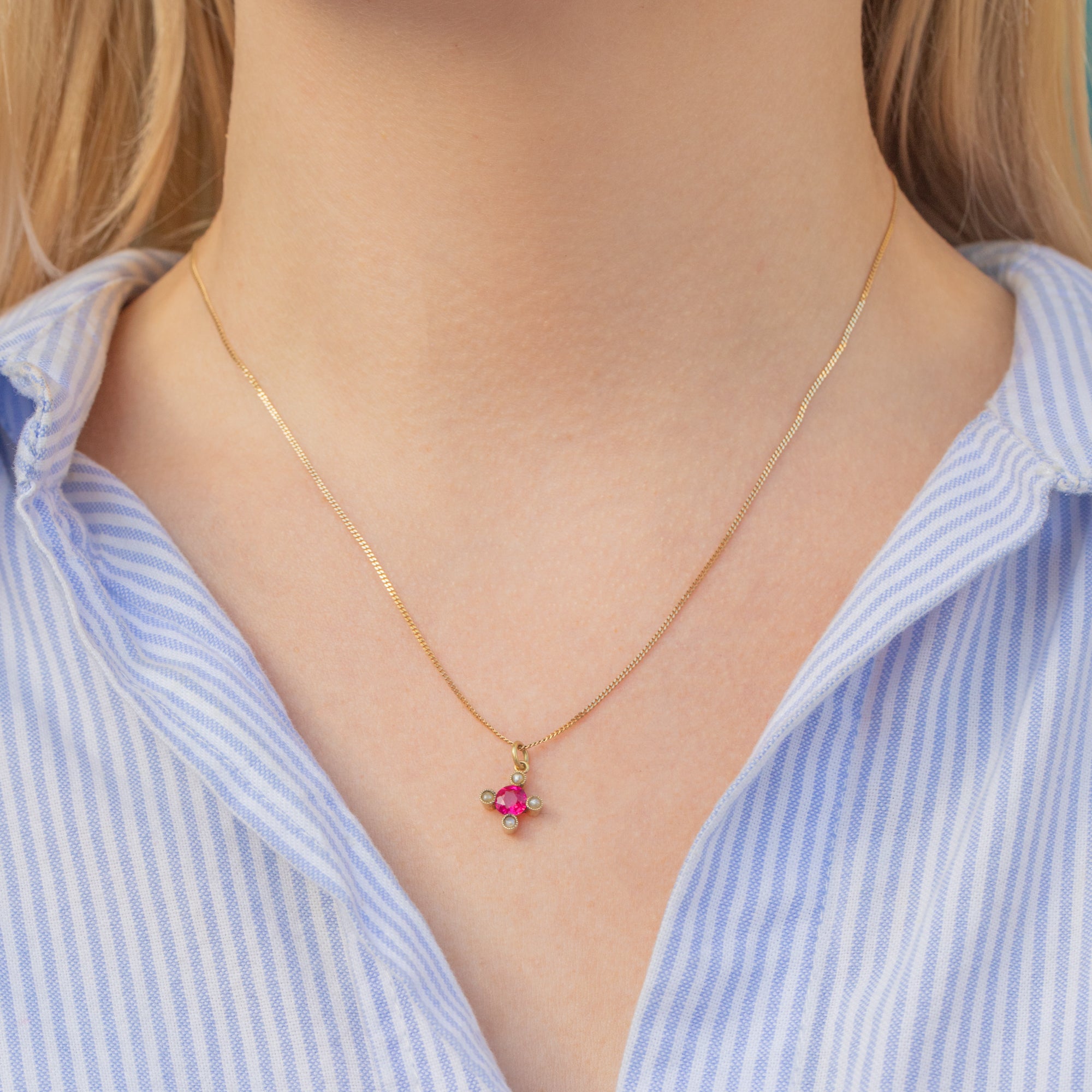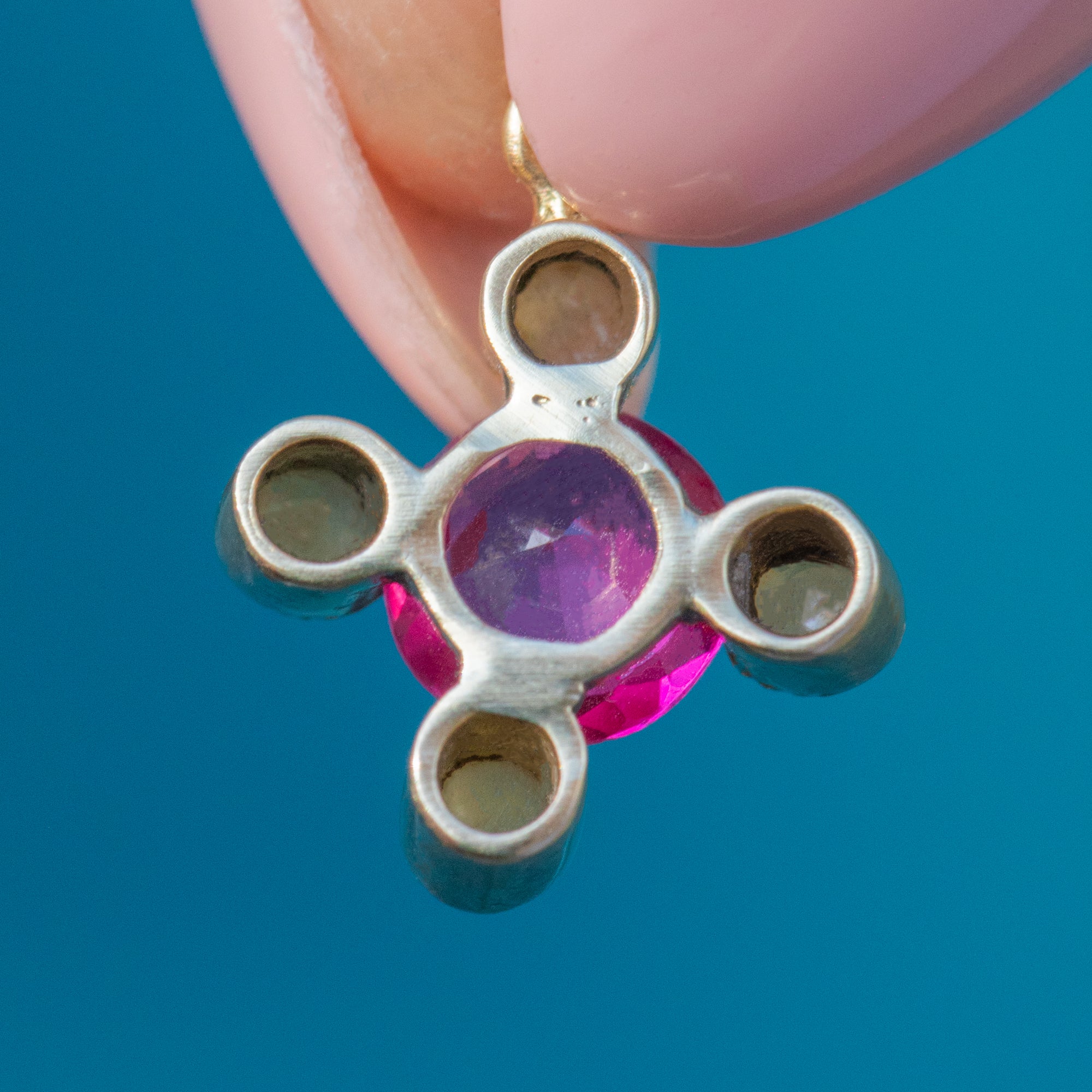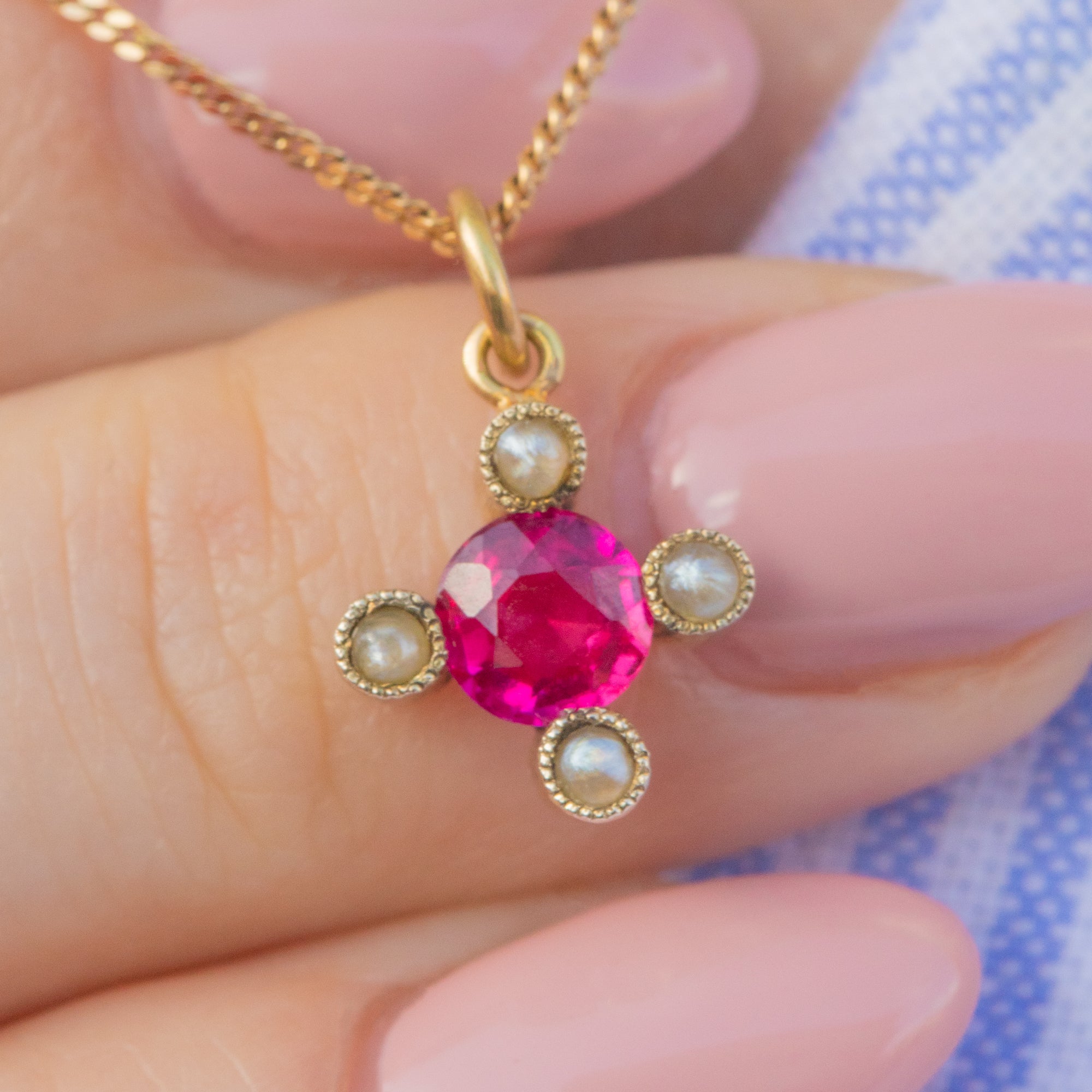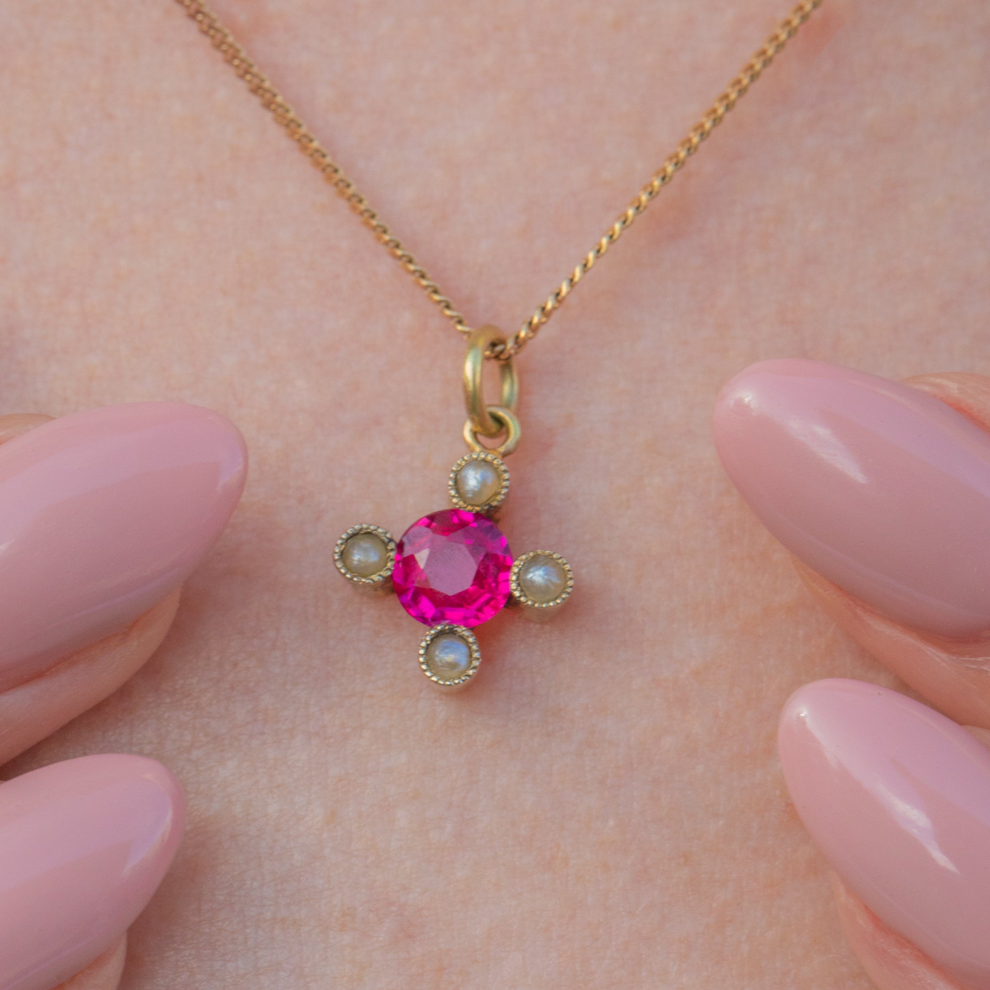This exquisite antique 18ct Gold Pink Sapphire Pearl charm is a dinky delight! Crafted from 18ct yellow Gold and displaying a vibrant 0.50ct fuchsia Sapphire as its focal point. Her hot pink Sapphire is beautifully complemented by four delicate seed Pearls, arranged symmetrically around the gemstone to create an elegant and timeless design.