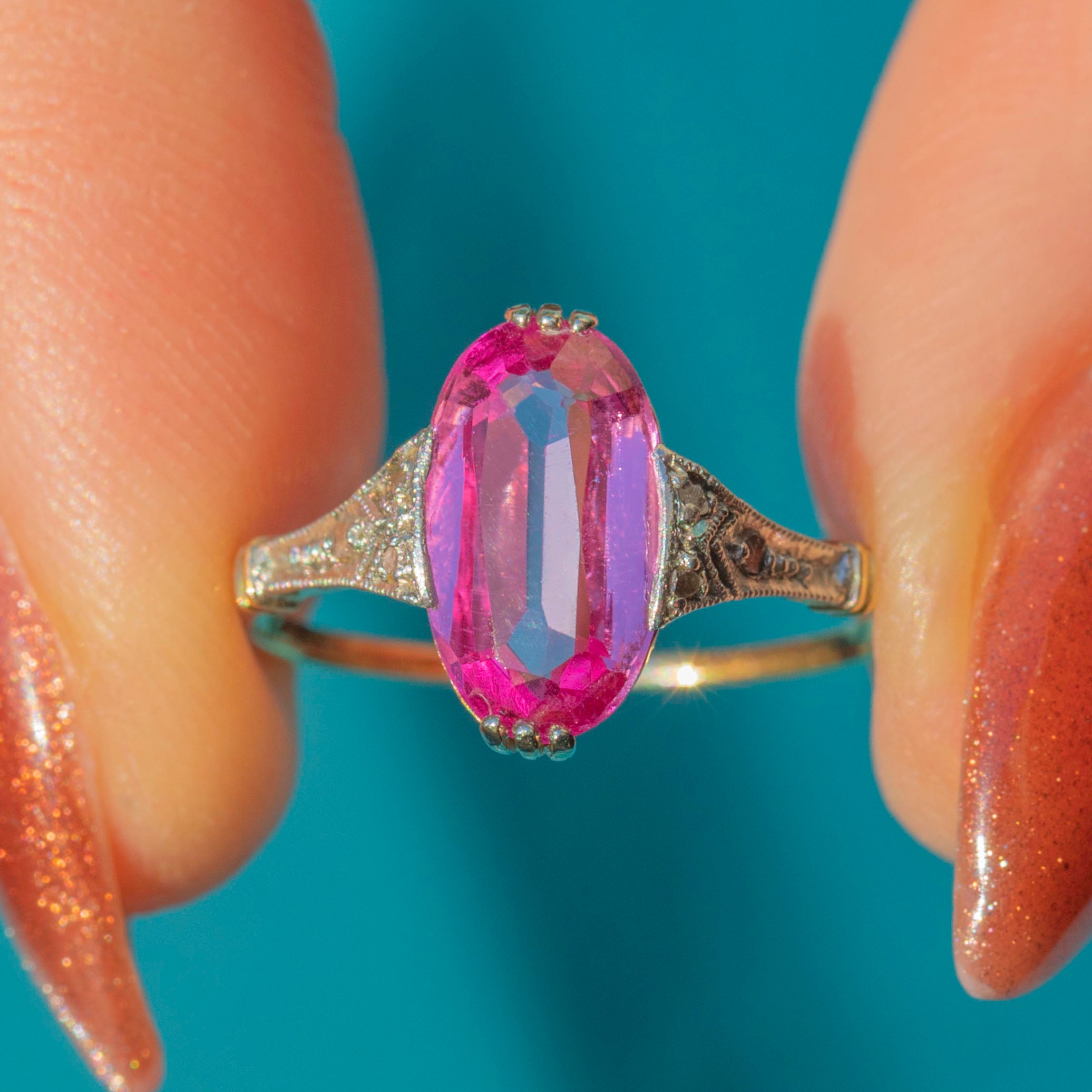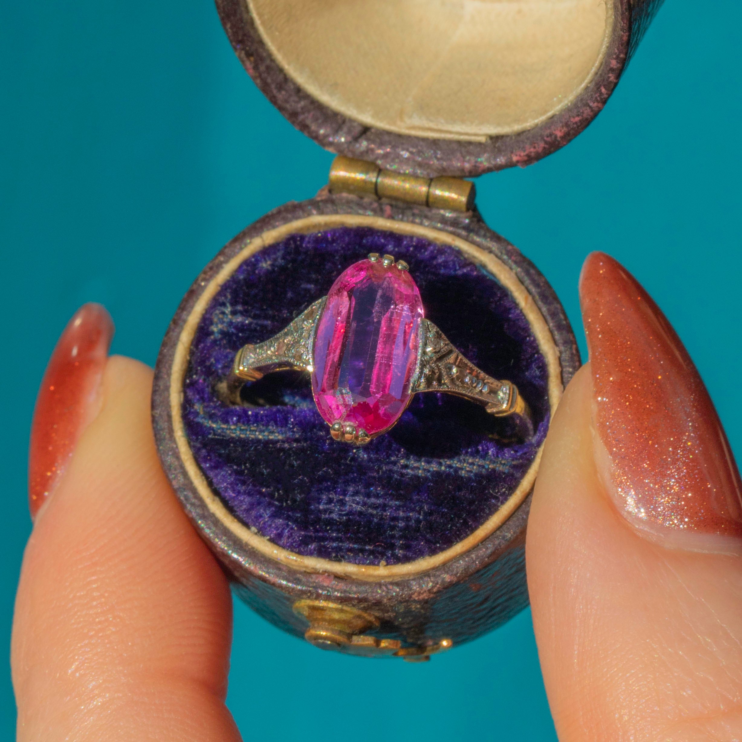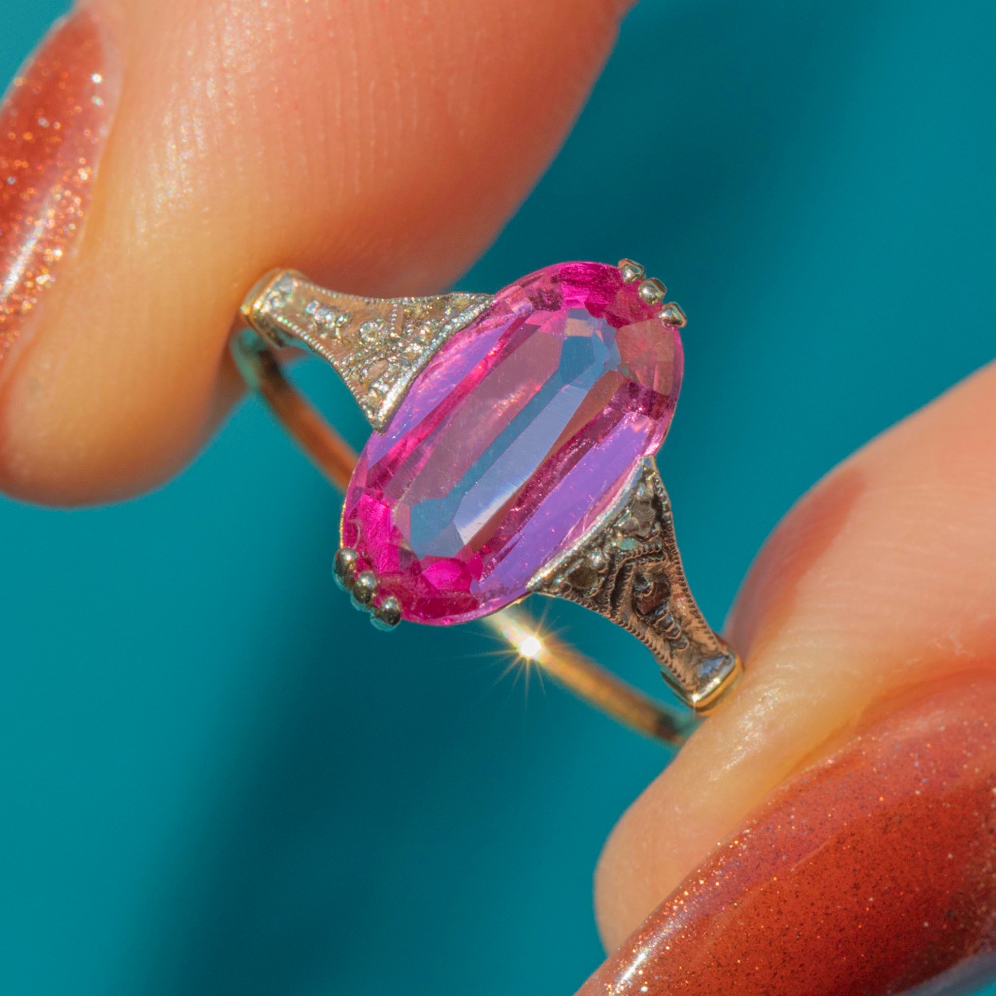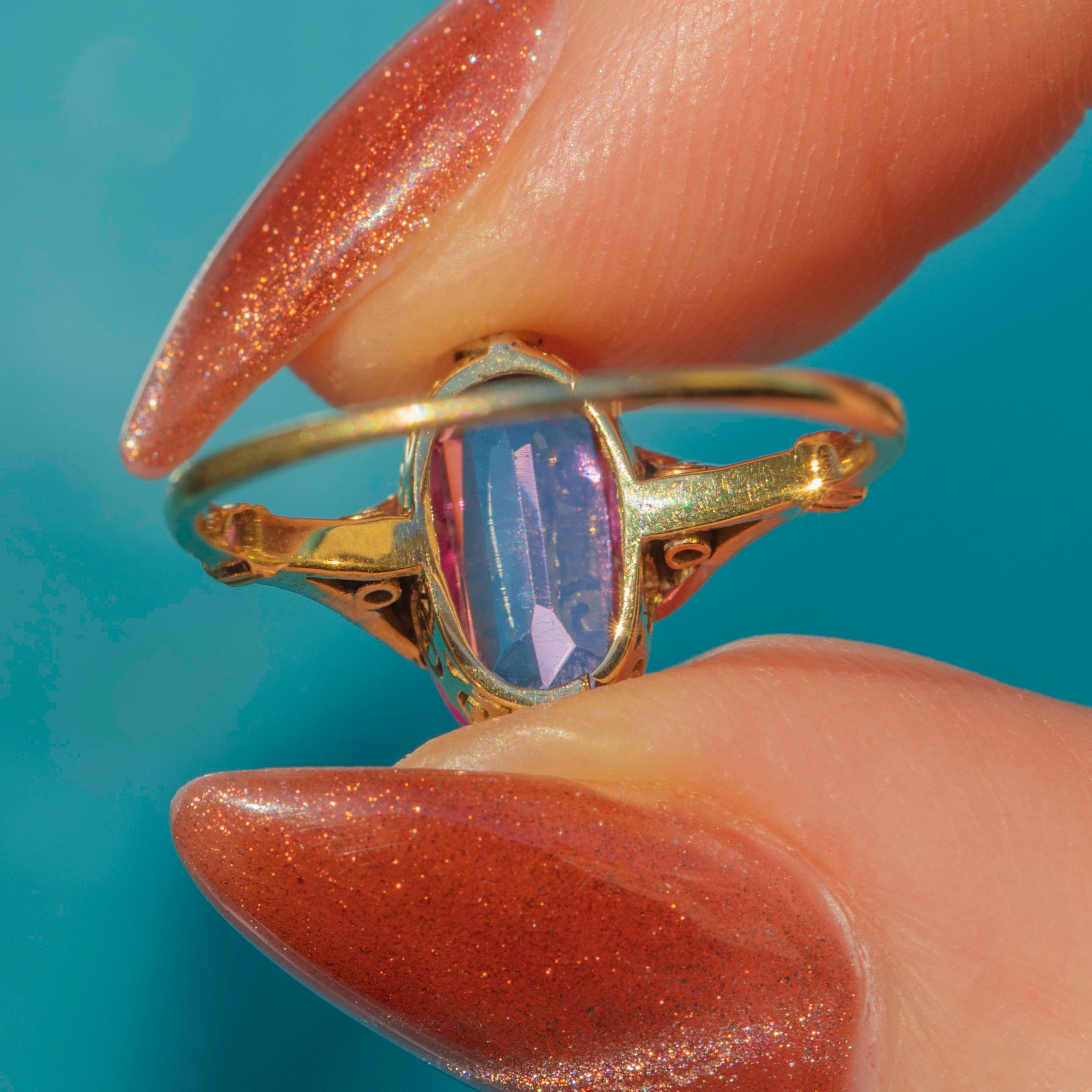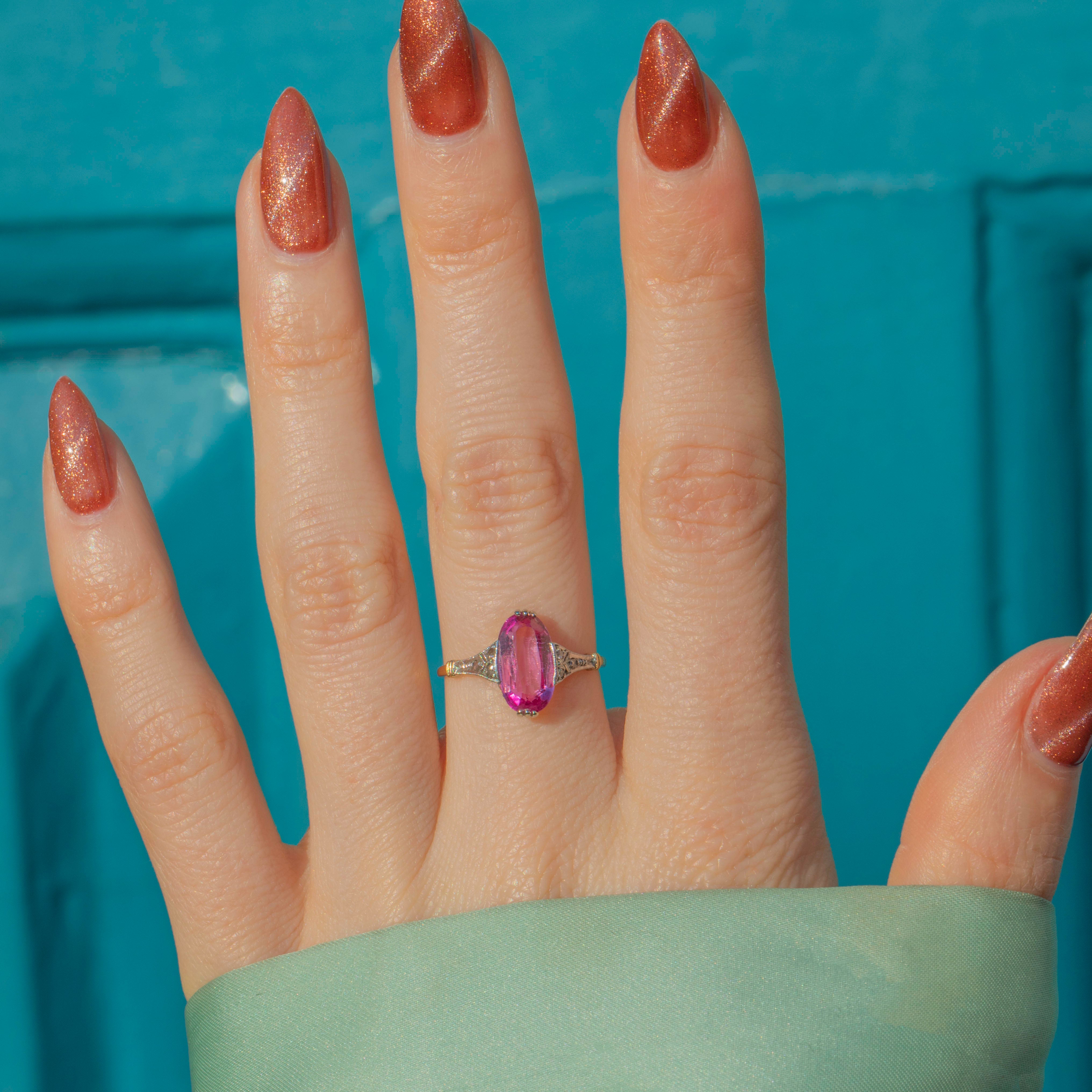 If you adore timeless elegance and a touch of rosy romance, this antique Antique 18ct Gold Pink Sapphire Ring is a must-have for your collection. The stunning Pink Sapphire takes centre stage, captivating with her soft blush hue and sparkling facets that dance in the light.