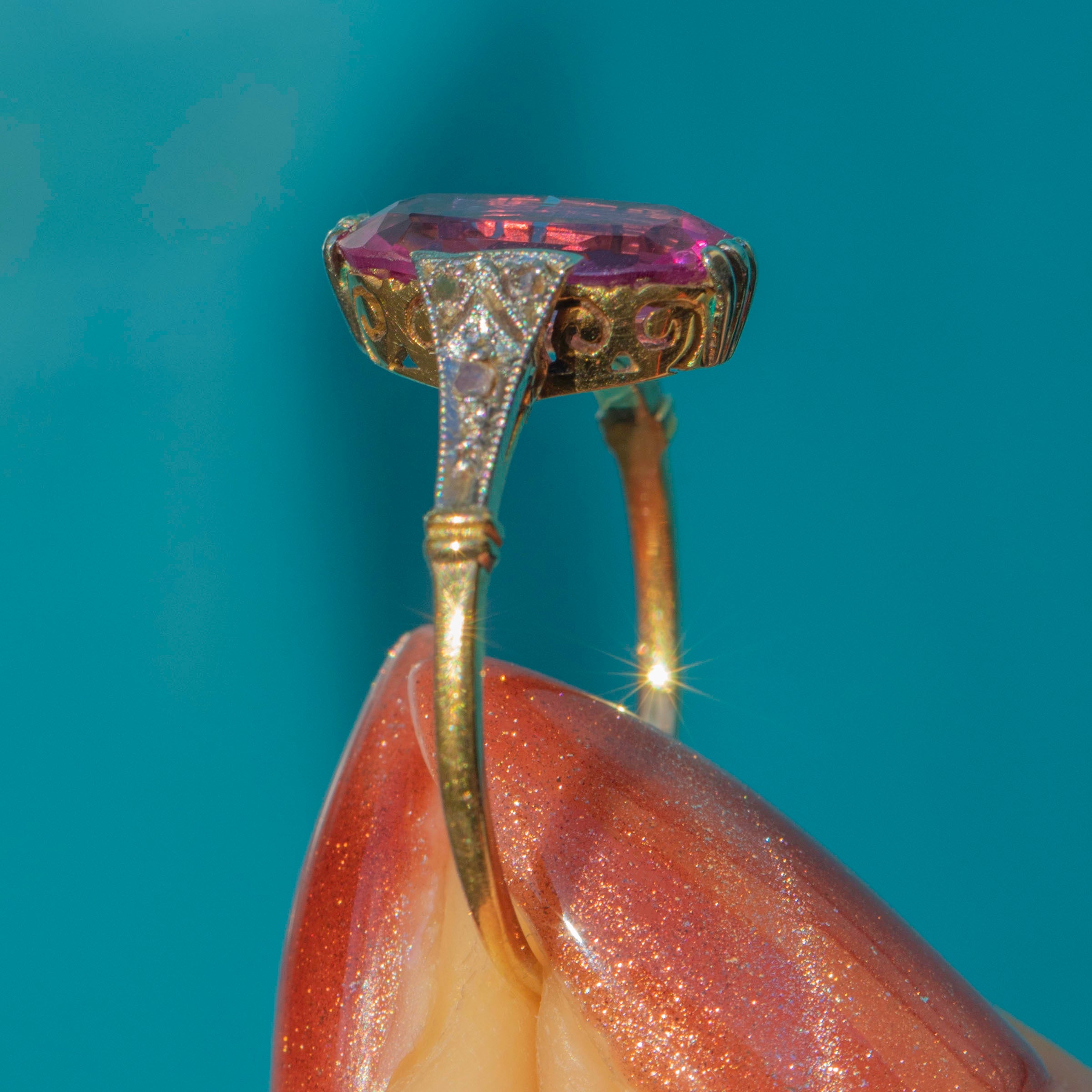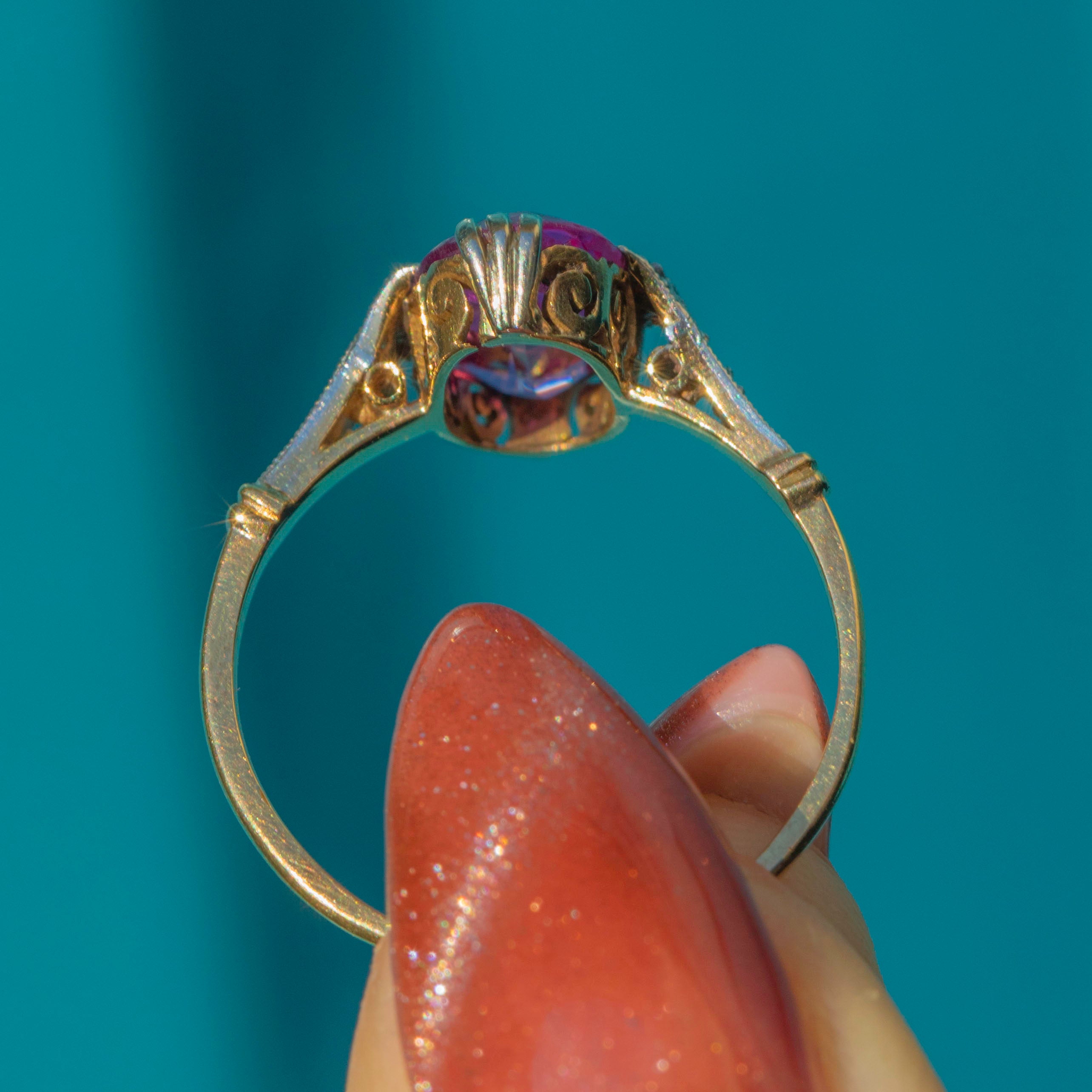 EXCELLENT-VERY GOOD This Antique 18ct Gold Pink Sapphire Ring is in excellent to very good condition. The Pink Sapphire is absolutely radiant, with a few natural inclusions that only add to its unique charm and character. All Diamonds are securely set, sparkling beautifully, while the Gold band bears a small dink—a subtle testament to its storied past and timeless allure.