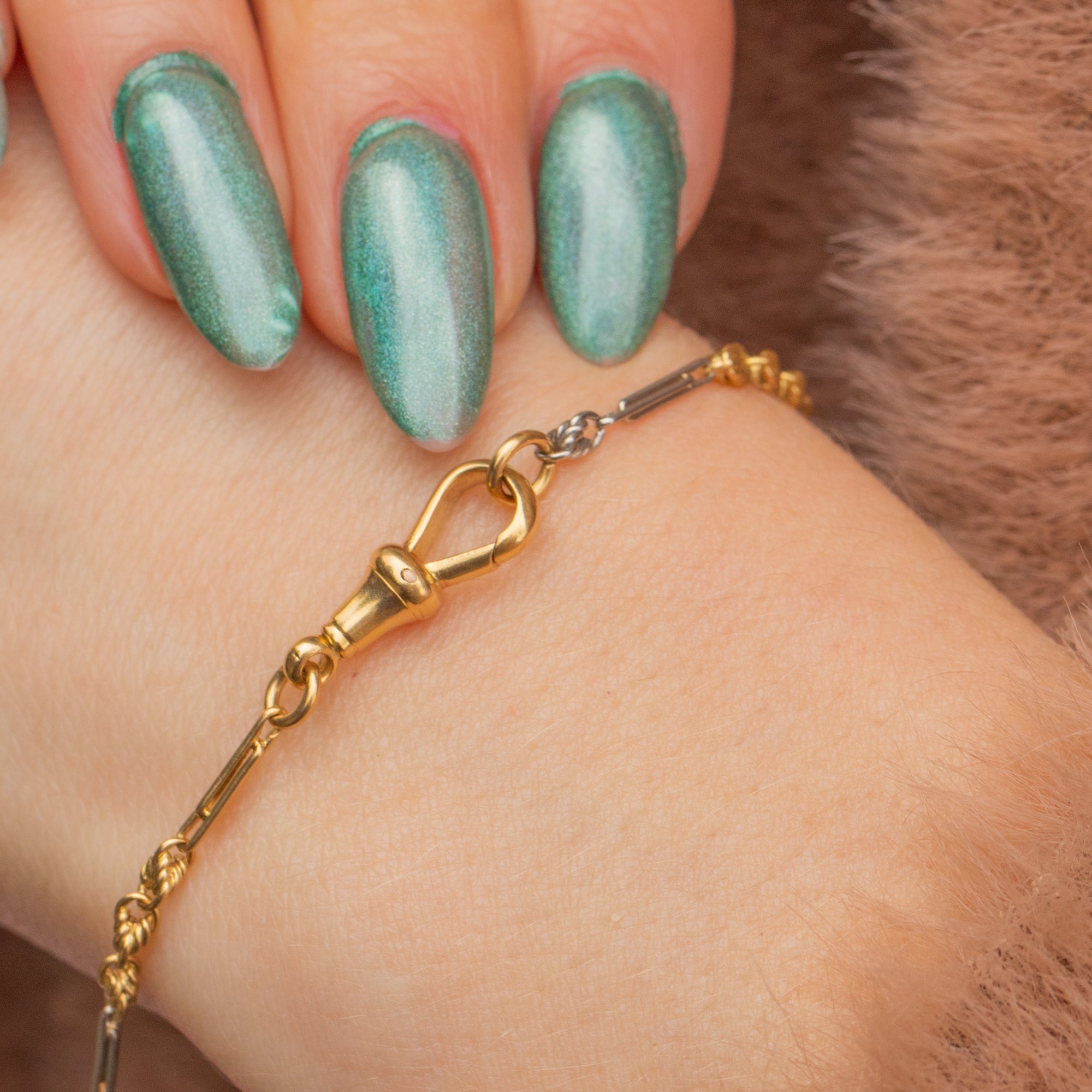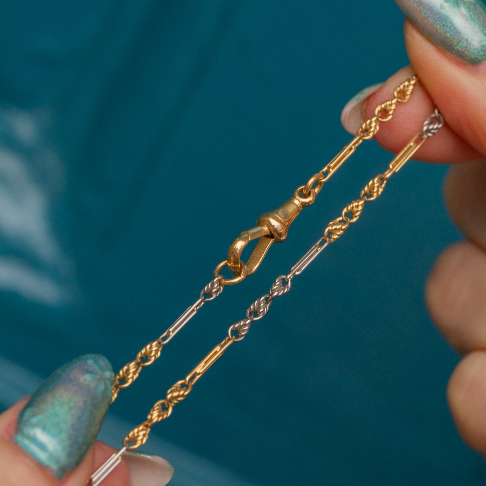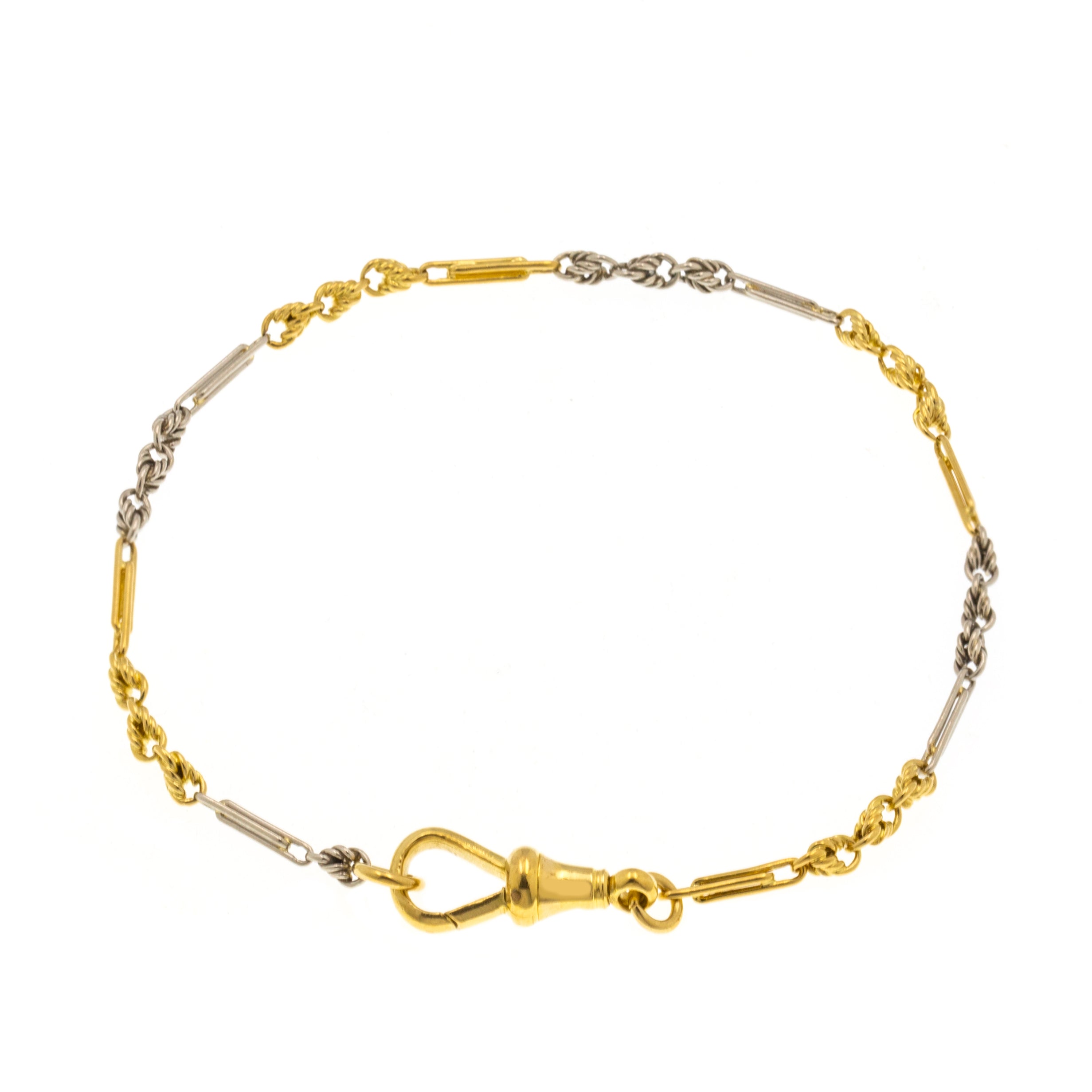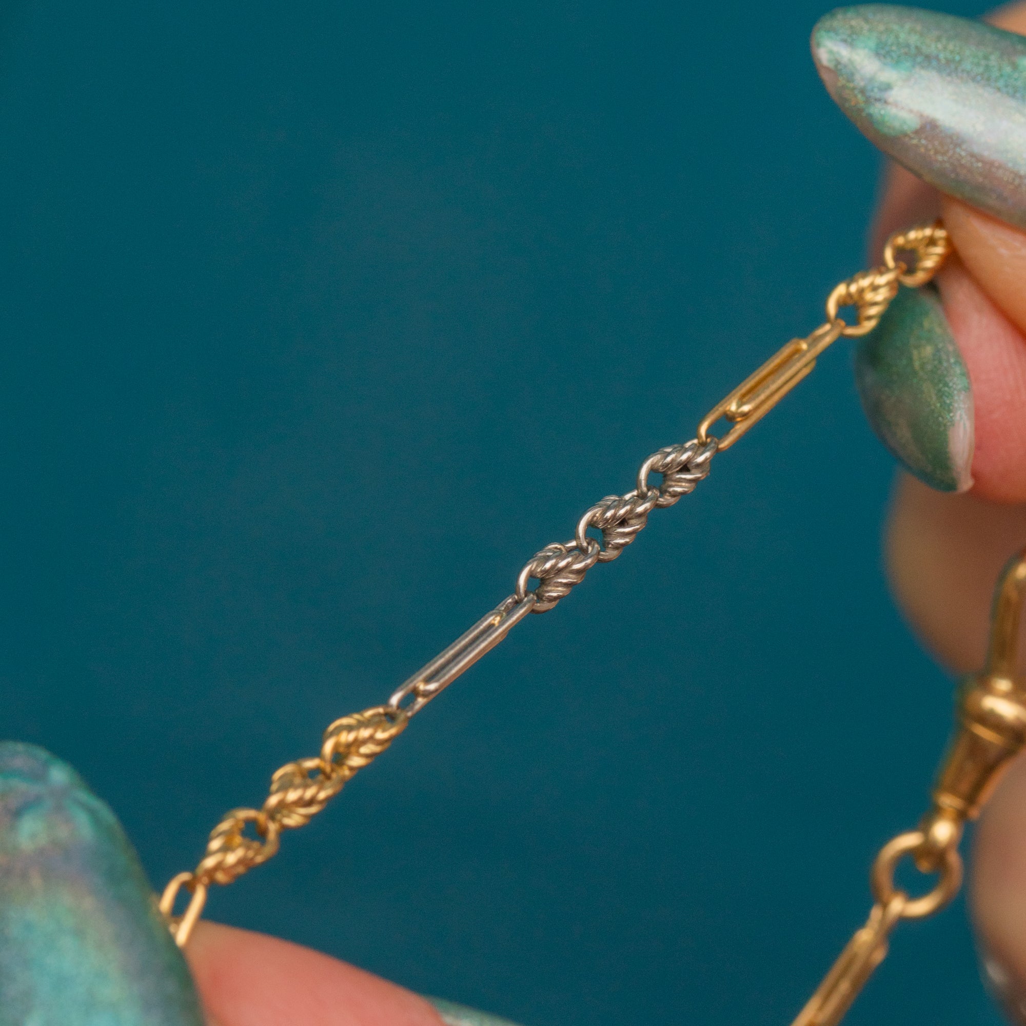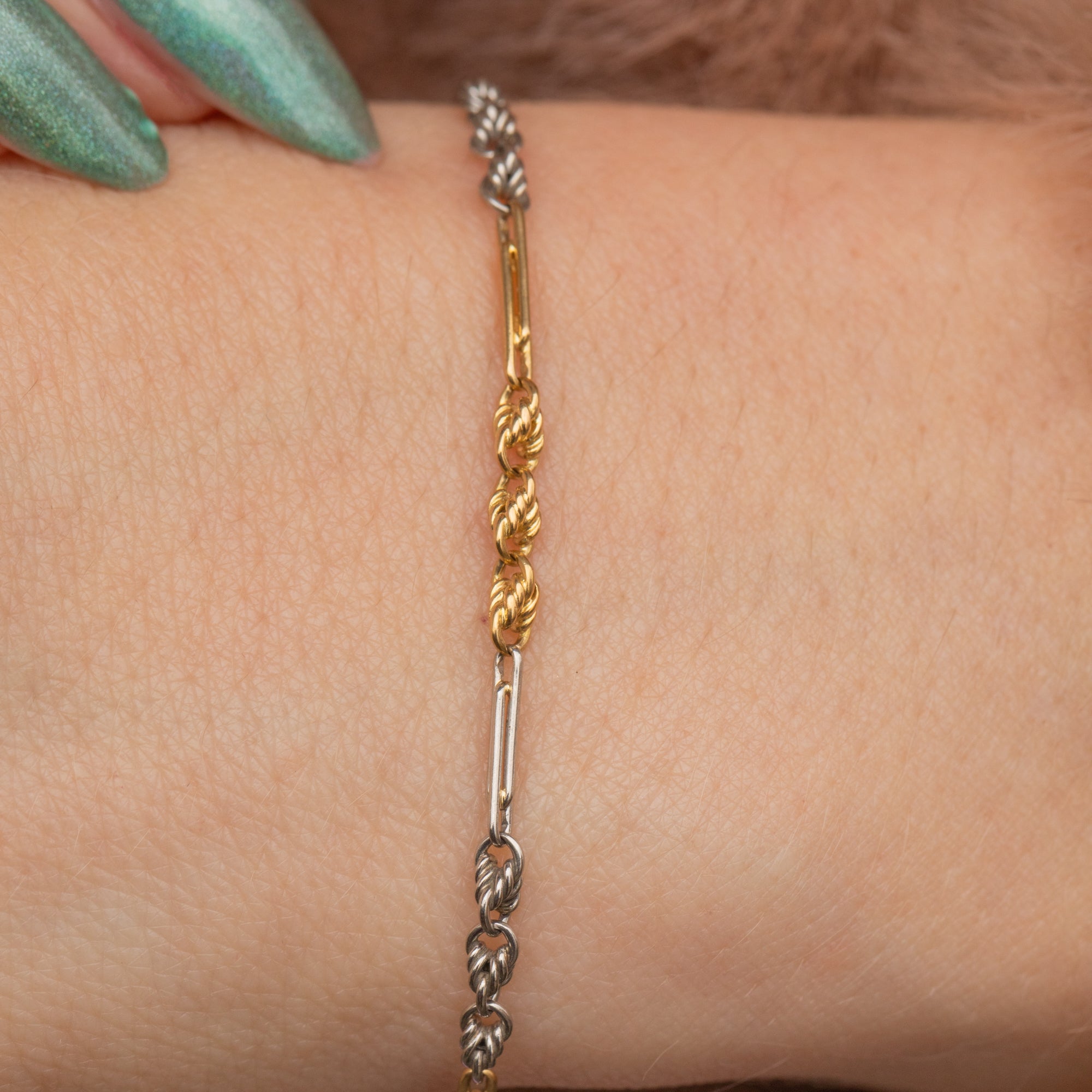 This antique 18ct Gold and Platinum bi-colour bracelet will be the hot topic of conversation as she adorns your wrist! Platinum and Gold lover's knots and paperclip links are entwined to form her 7.5" length; the contrast of mixed metals is what will set your collection apart from the rest.